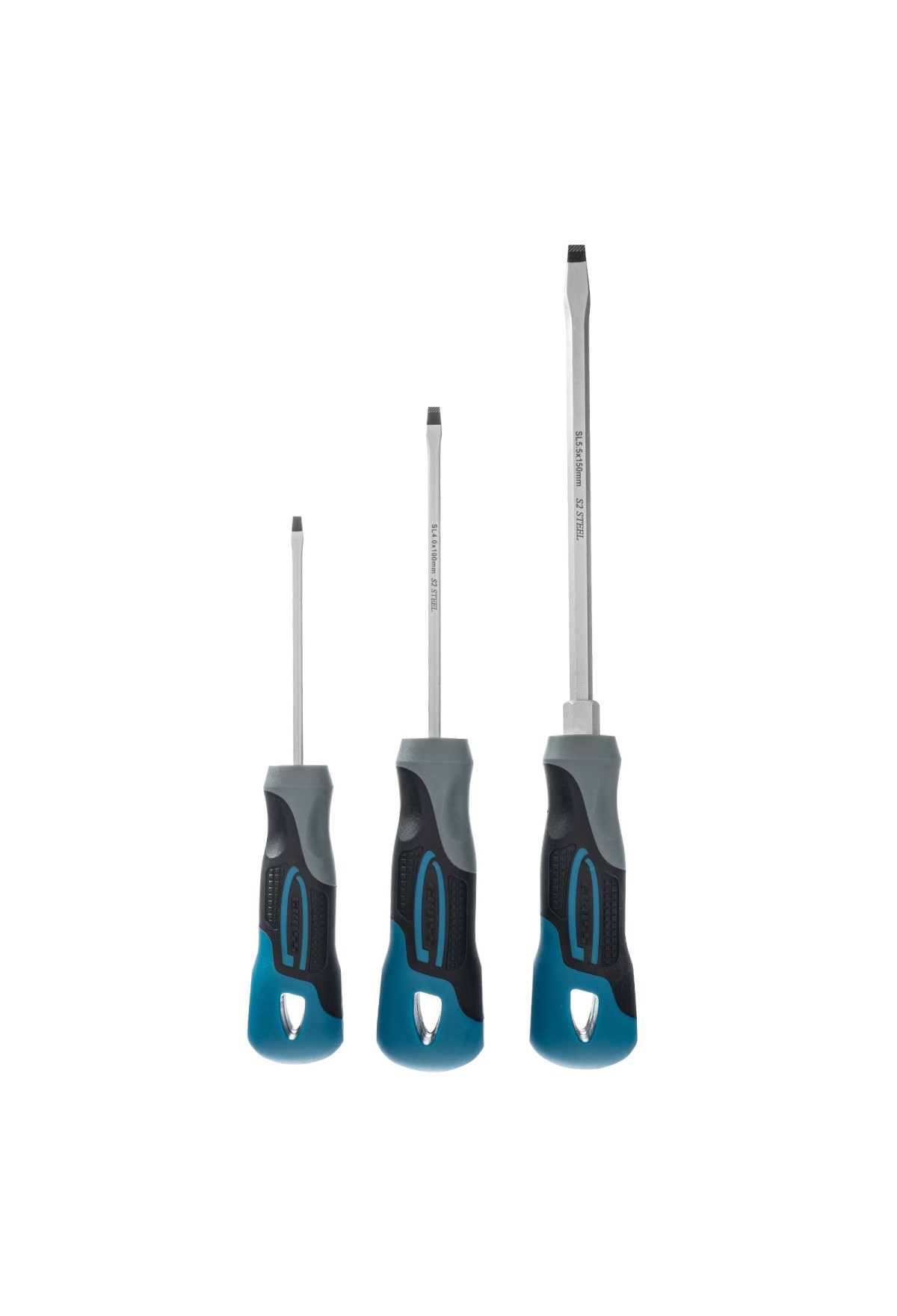 Набор из 3 отверток Gross 12165 из стали S2, с трехкомпонентными рукоятками, используется для монтажа и демонтажа крепежных элементов с профилем SL3, SL4 и SL5,5. Высокое качество отверток позволяет применять их для решения профессиональных задач с повышенными нагрузками. Отвертки в комплекте имеют стержни разной длины 75-150 мм для удобства работы с крепежом как на поверхности, так и в углублениях.