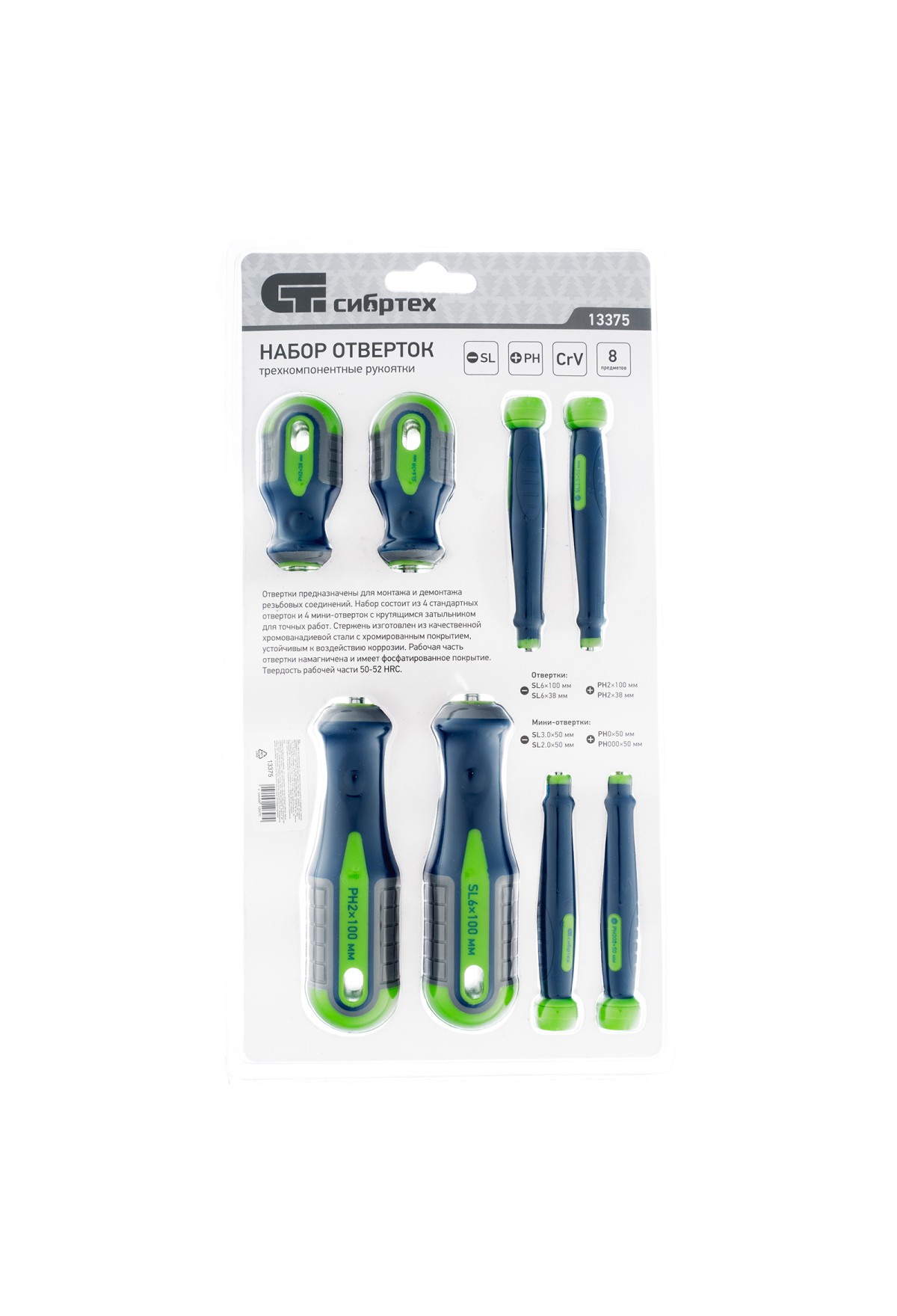 Технические характеристики Набор отверток универсальный, CrV, трехкомпонентные рукоятки, 8 предметов Сибртех