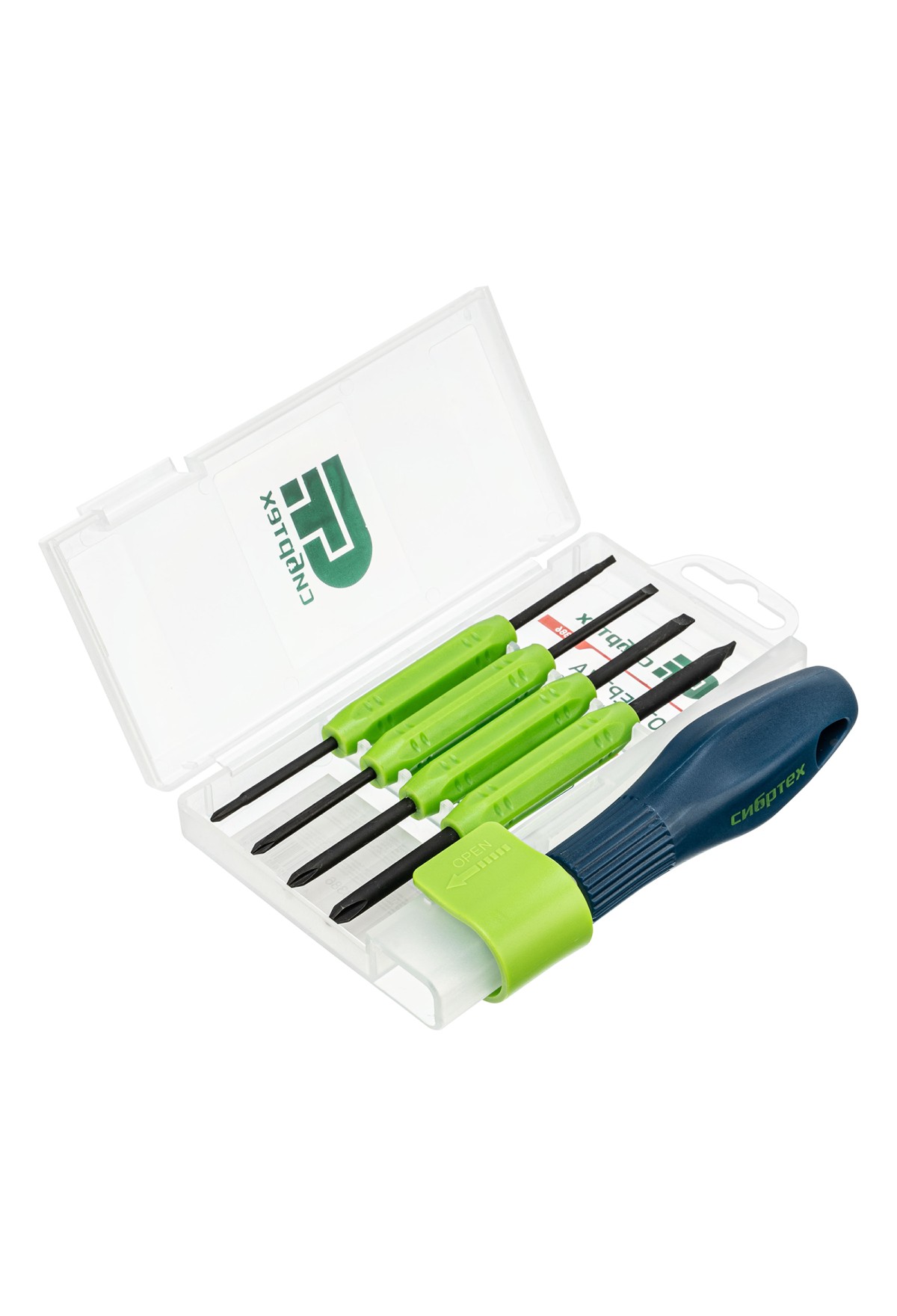 | Комплектация | Карманный пластиковый кейс - 1 штОднокомпонентная рукоятка - 1 штДвусторонние стержни: PH2/SL5, PH1/SL4, PH0/SL3, PH00/SL2 - 4 шт |