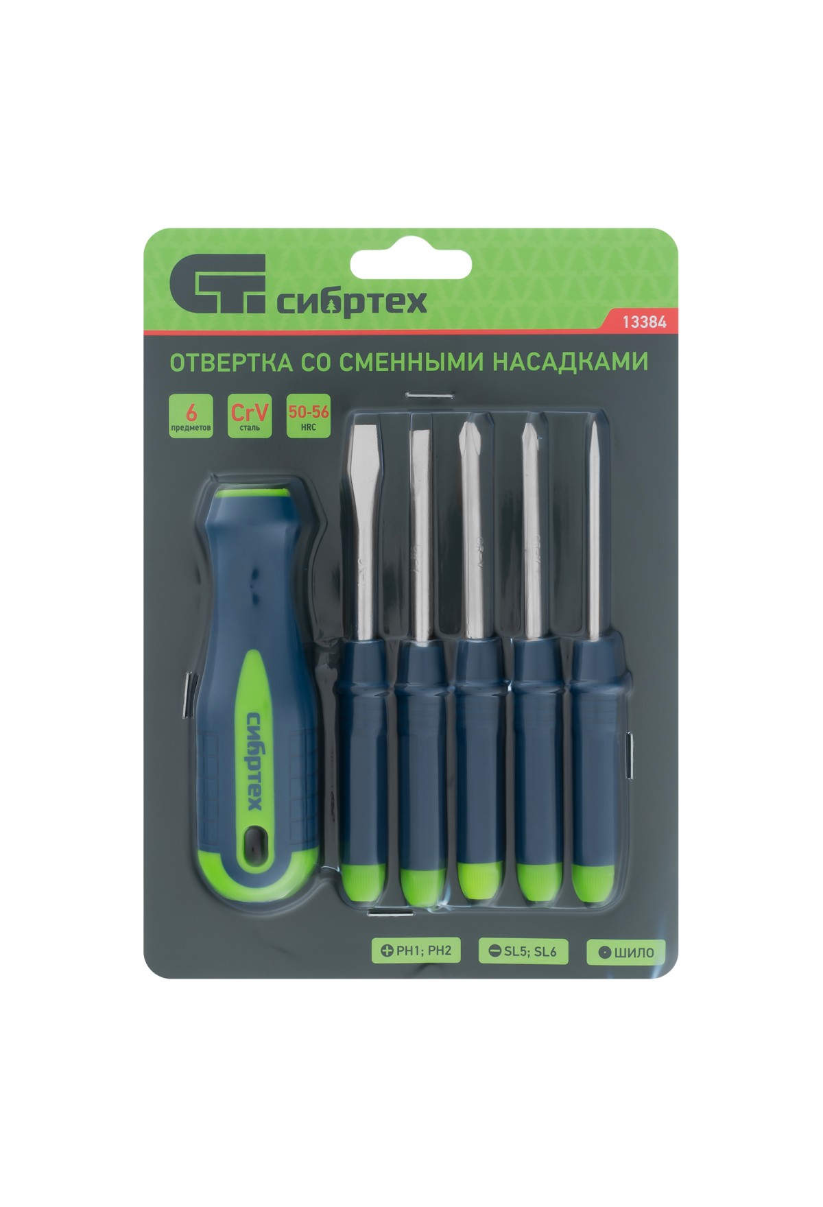 Отвертка со сменными насадками Сибртех 13384, 5 предметов, пригодится для монтажных и ремонтных работ в квартире, на даче, в гараже. Набор включает в себя 4 стержня для работы с крепежами типоразмера PH1, PH2, SL5, SL6 и шило для прокалывания материалов.
