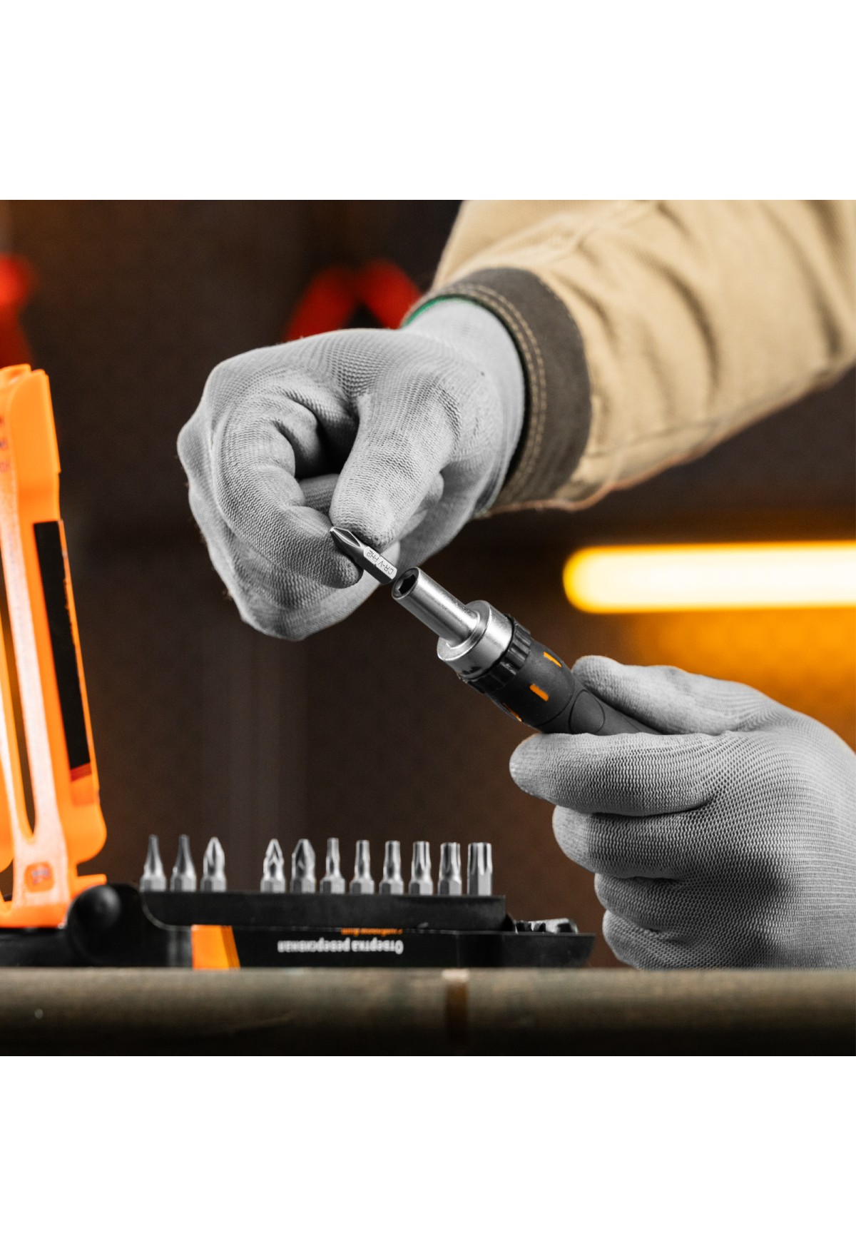 - Биты и стержень отвертки из стали CrV имеют высокие показатели износостойкости, что обеспечивает их долговечность.