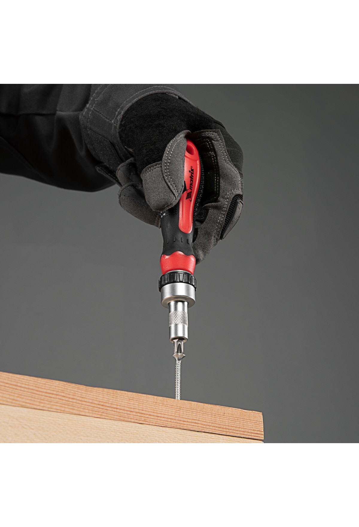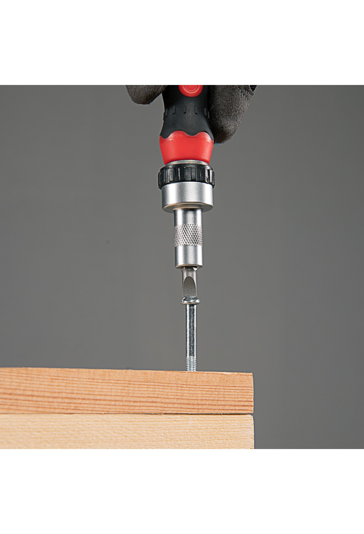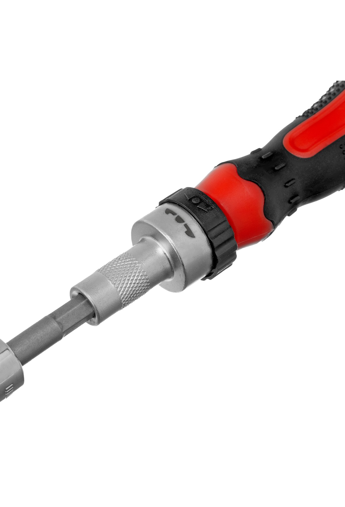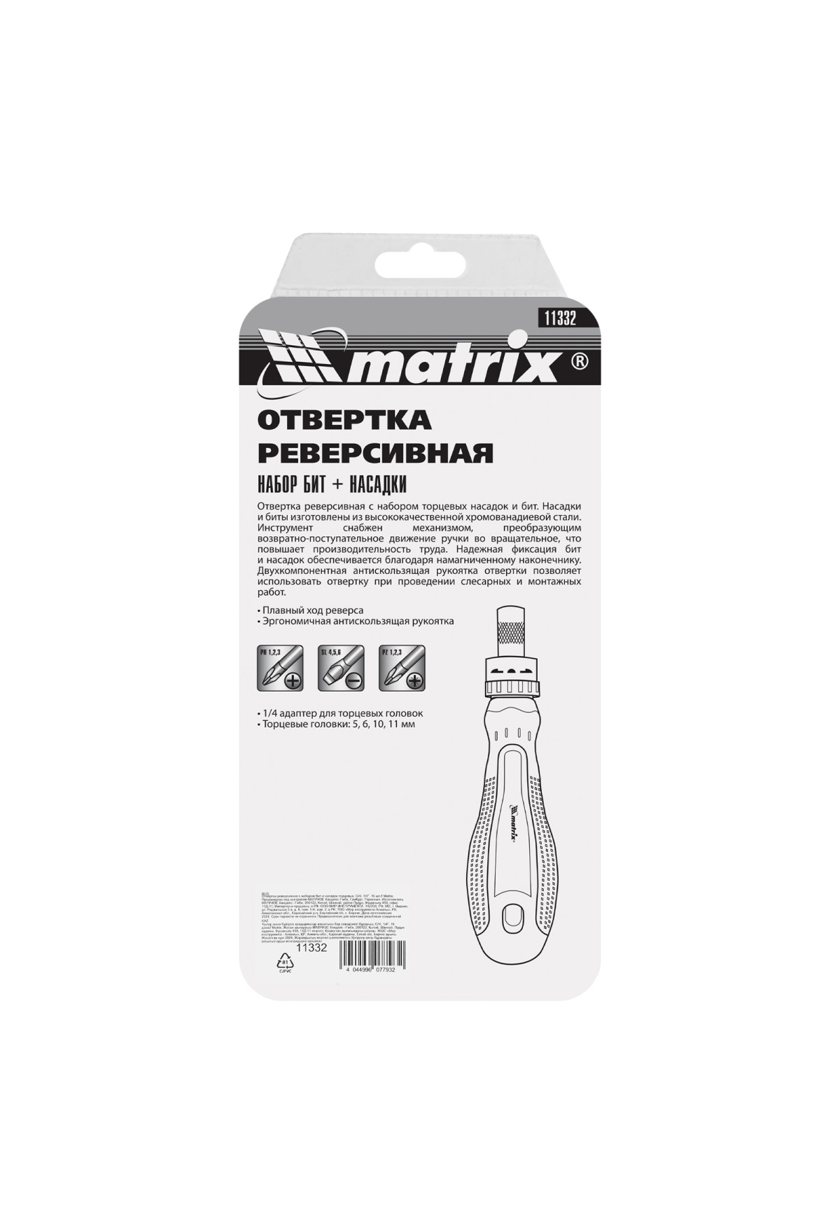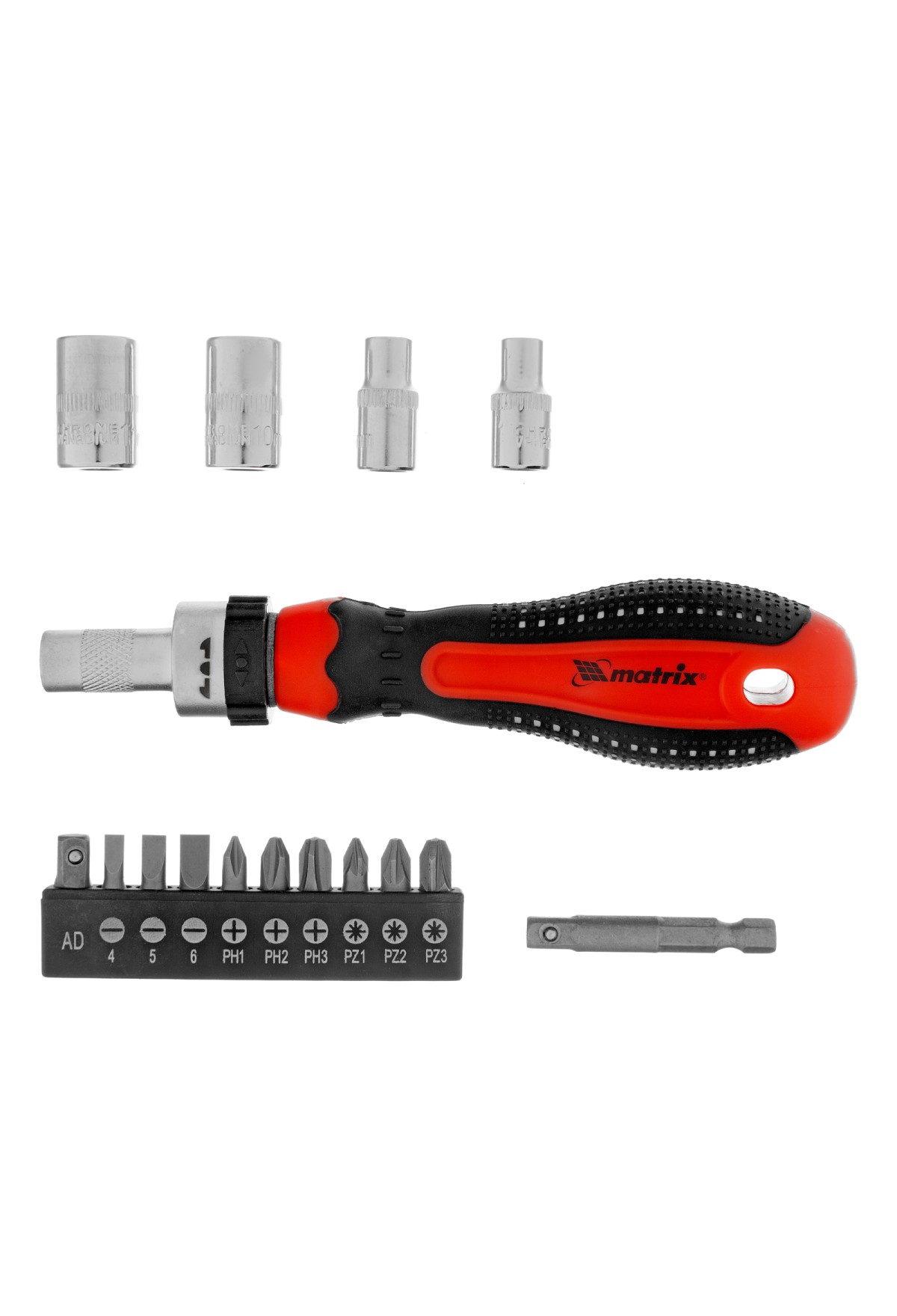 Реверсивная отвертка Matrix 11332 с набором бит и торцевых насадок из стали CrV, с присоединительным размером 1/4", 16 шт. в упаковке, предназначена для работ с резьбовыми соединениями. Благодаря торцевым головкам с адаптером может использоваться в качестве накидного ключа. Храповой механизм облегчает вращение отвертки и увеличивает скорость работы. Направление вращения можно менять при помощи кольцевого переключателя. Отвертка пригодится при сборке и установке мебели, ремонте бытовой техники, будет полезна дома, на даче или в гараже.