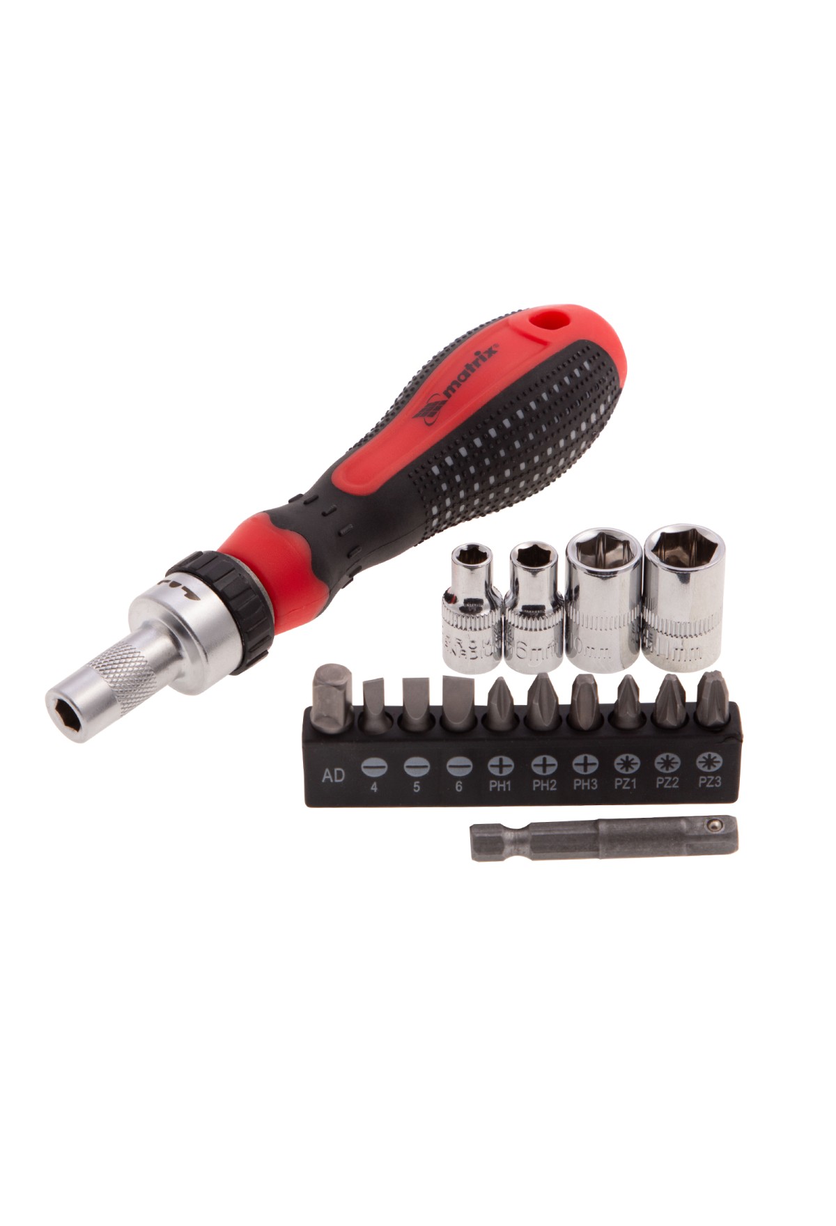 Технические характеристики Отвертка реверсивная с набором бит и насадок торцевых, CrV, 1/4, 16 шт Matrix