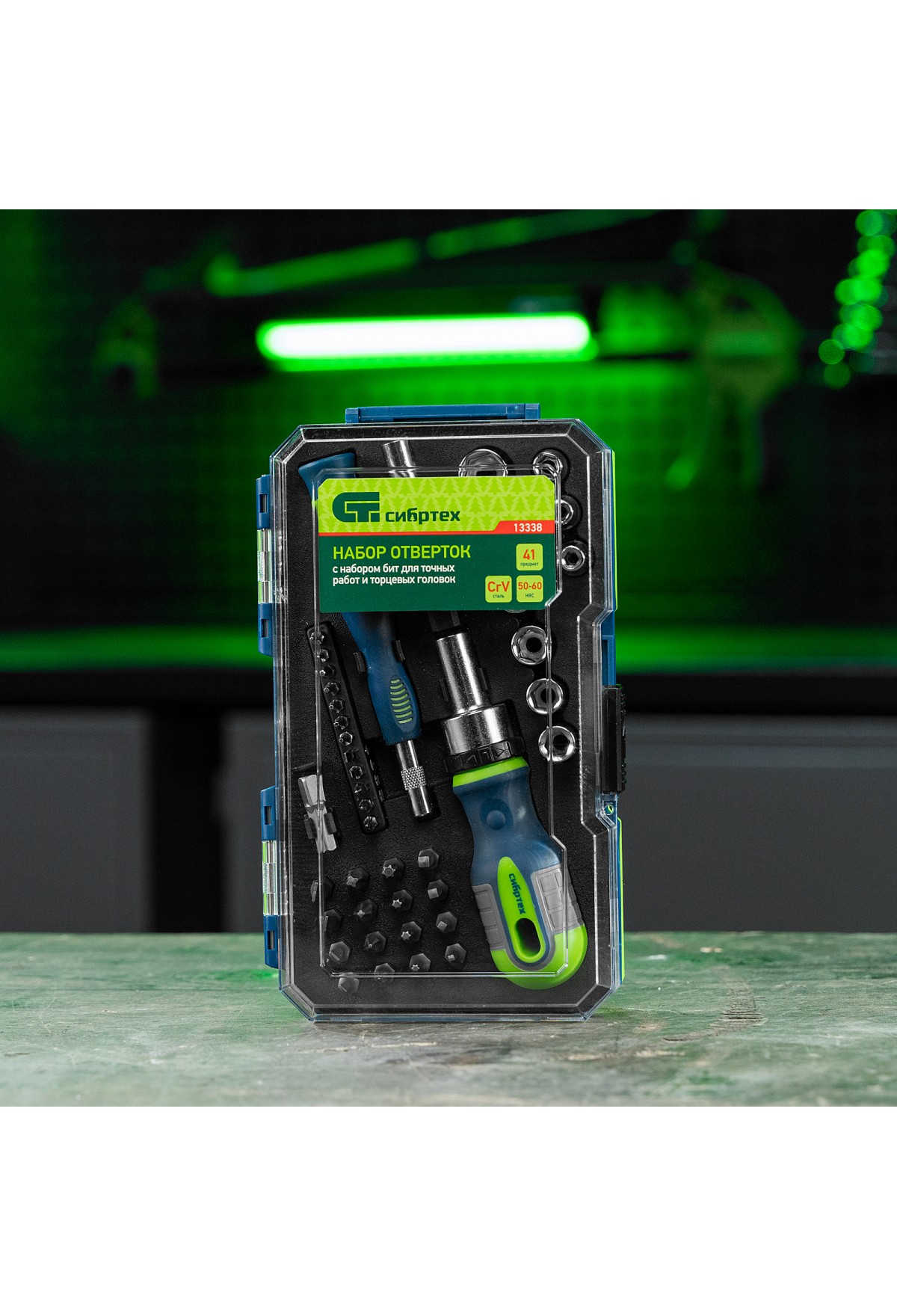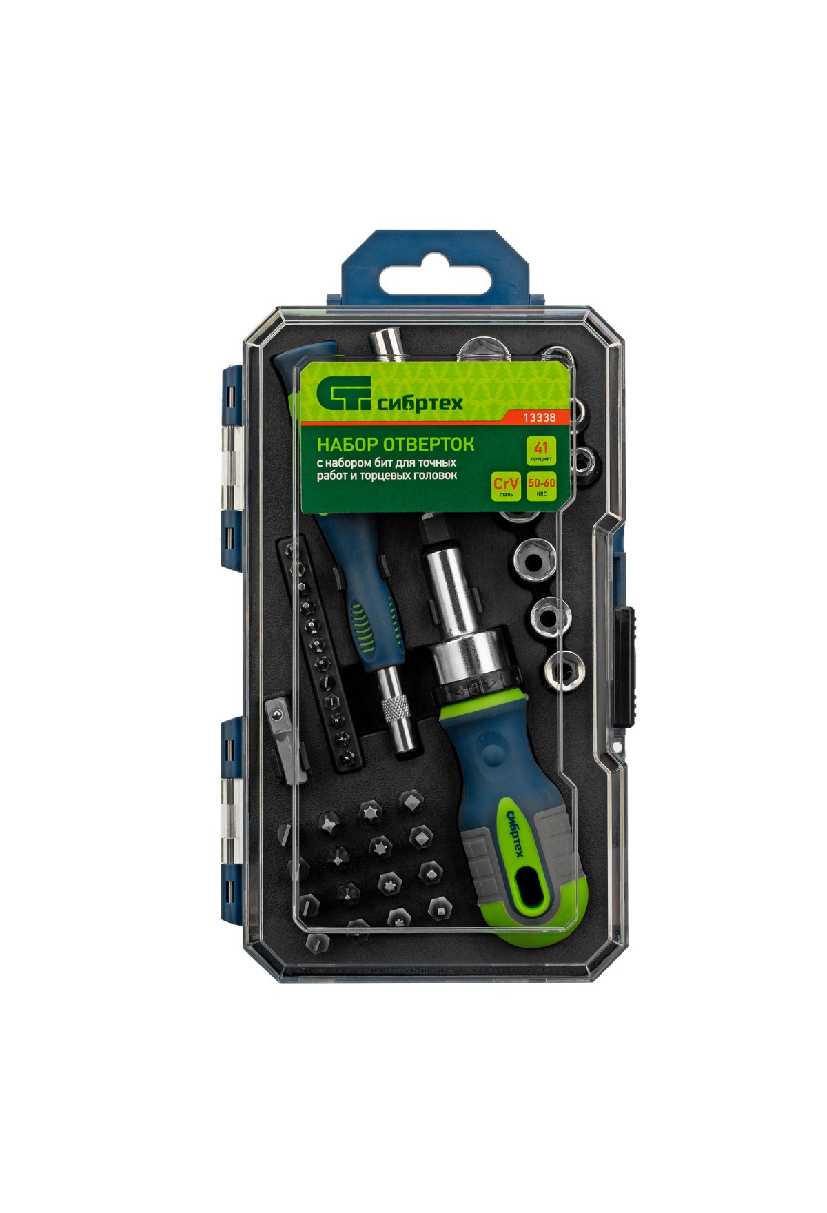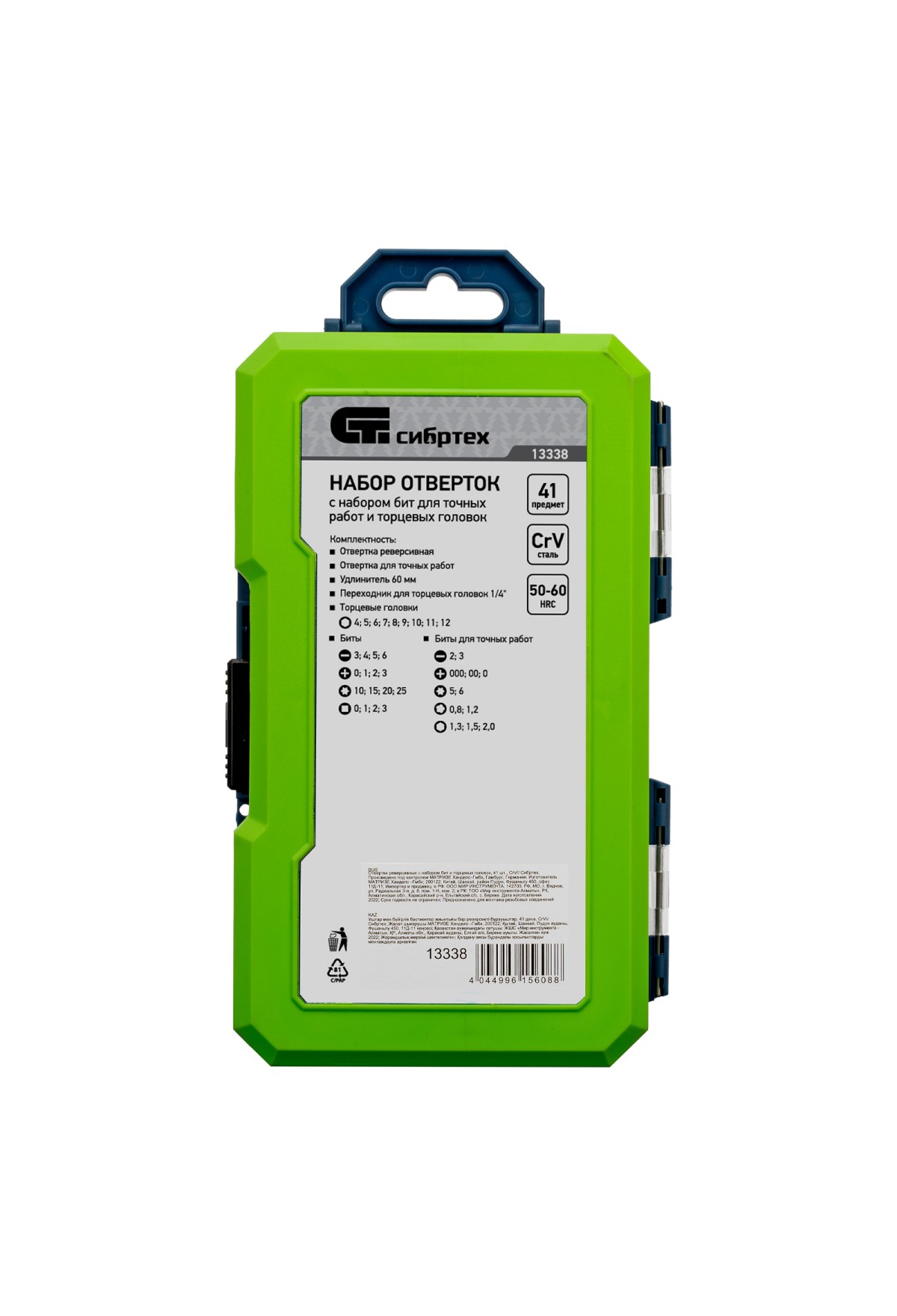 Реверсивные отвертки с набором бит и торцевых головок Сибртех 13338, 41 предмет, CrV, включает в себя насадки для работы с крепежом типа SL, PH, PZ, HEX, TORX и торцевые головки для монтажа/демонтажа гаек, болтов, саморезов. Также в нем есть отвертка и биты для точных работ, с помощью которых можно осуществить ремонт мелкой электроники, очков, детских игрушек и т.д. Удлинитель позволяет проводить работы в труднодоступных местах.