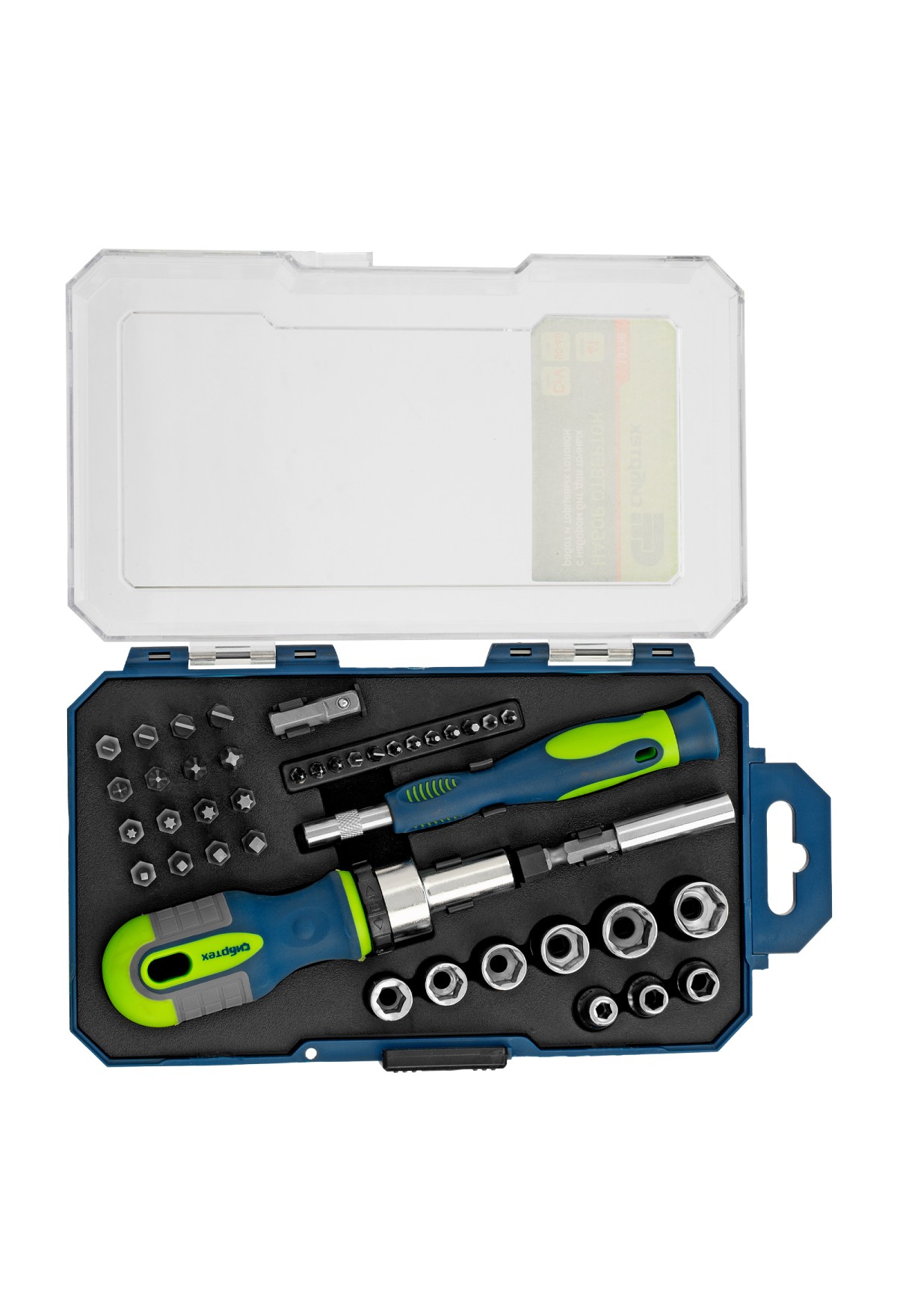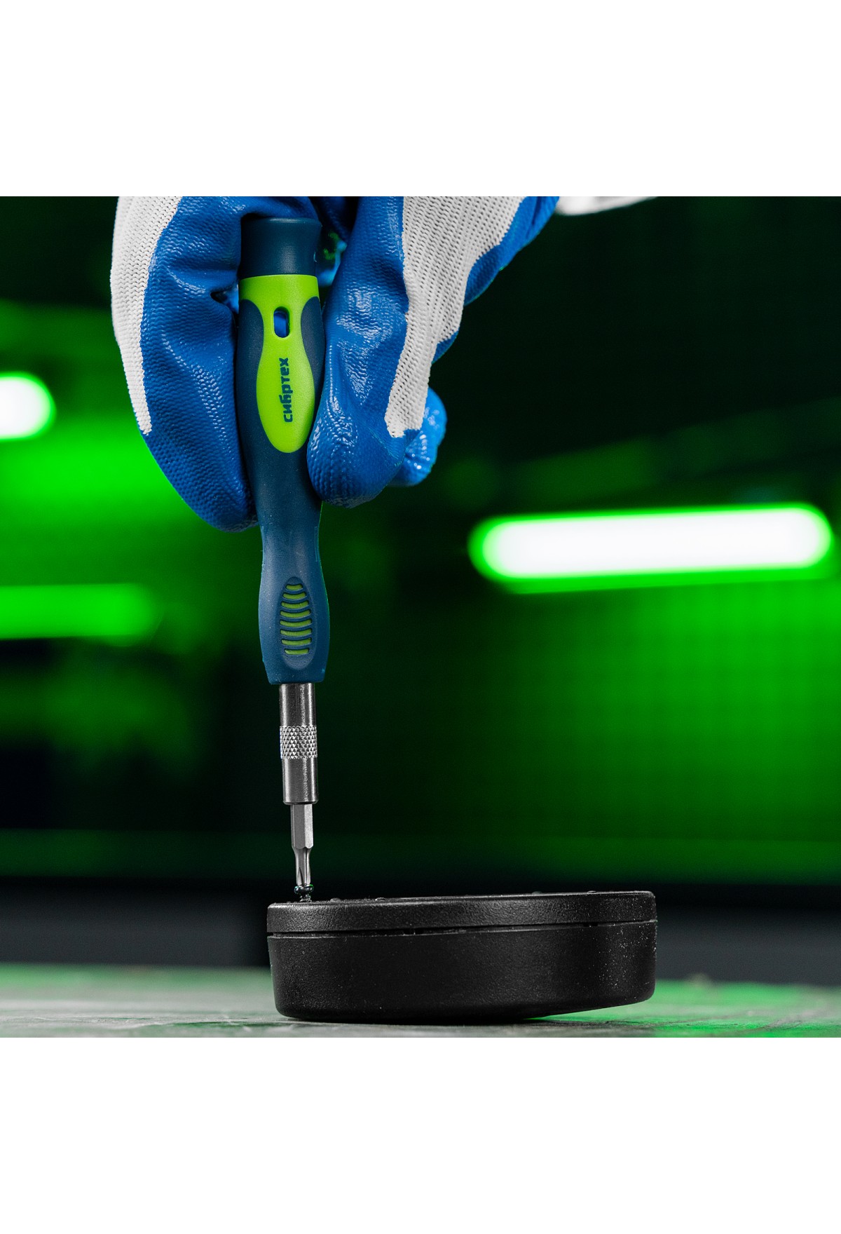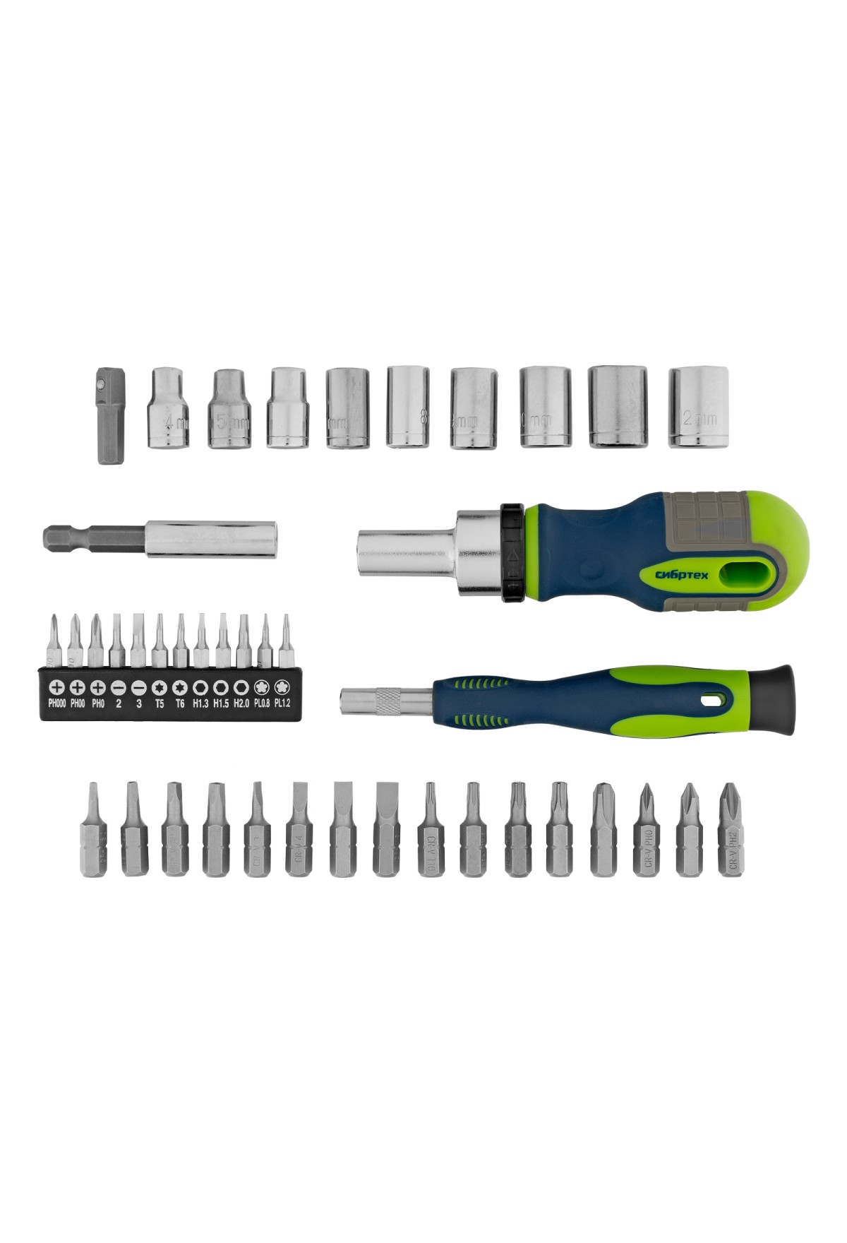 Реверсивные отвертки с набором бит и торцевых головок Сибртех 13338, 41 предмет, CrV, включает в себя насадки для работы с крепежом типа SL, PH, PZ, HEX, TORX и торцевые головки для монтажа/демонтажа гаек, болтов, саморезов. Также в нем есть отвертка и биты для точных работ, с помощью которых можно осуществить ремонт мелкой электроники, очков, детских игрушек и т.д. Удлинитель позволяет проводить работы в труднодоступных местах.