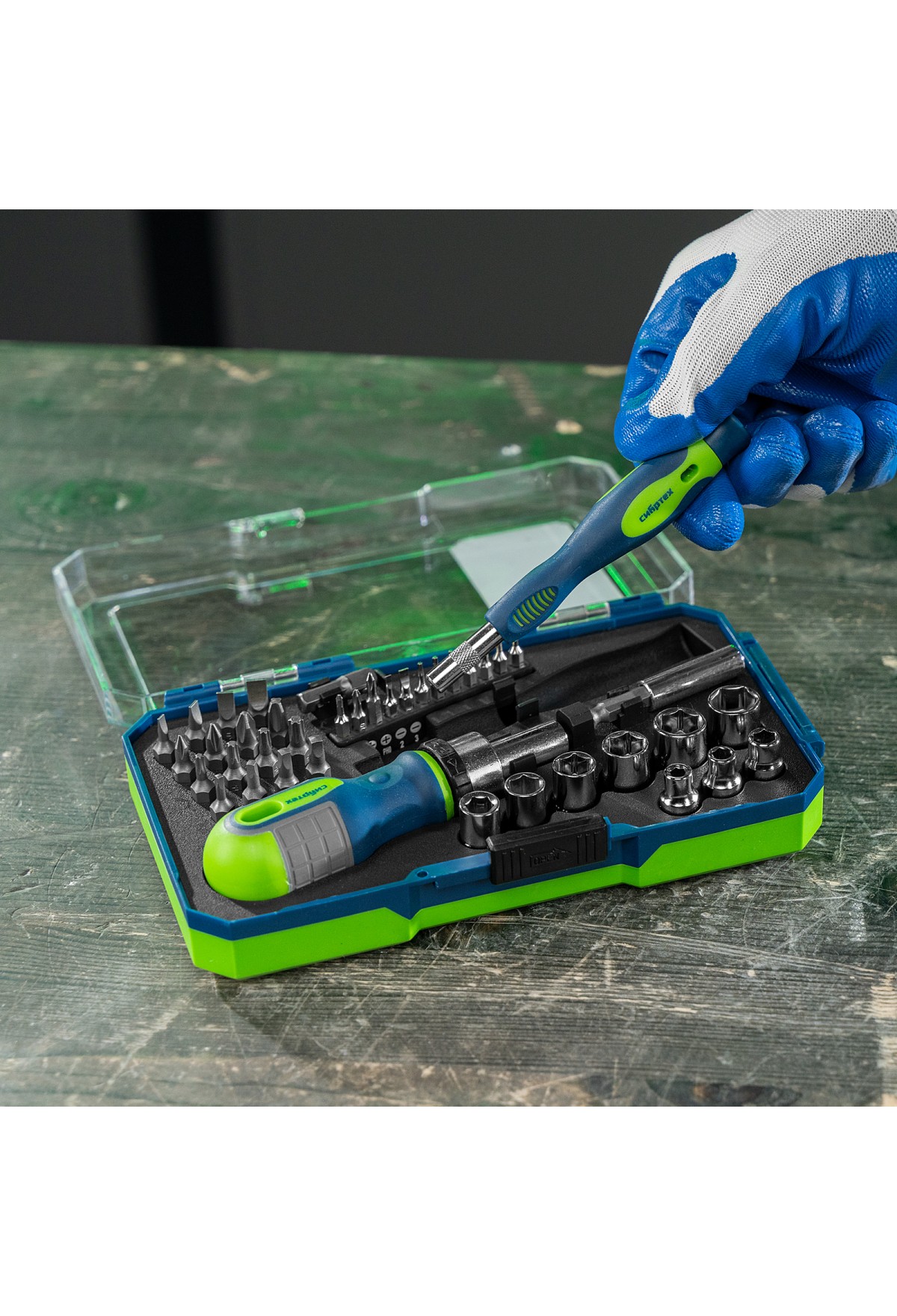 - Прочность и износостойкость — биты, торцевые головки и стержни отверток изготовлены из высококачественной хромованадиевой стали.