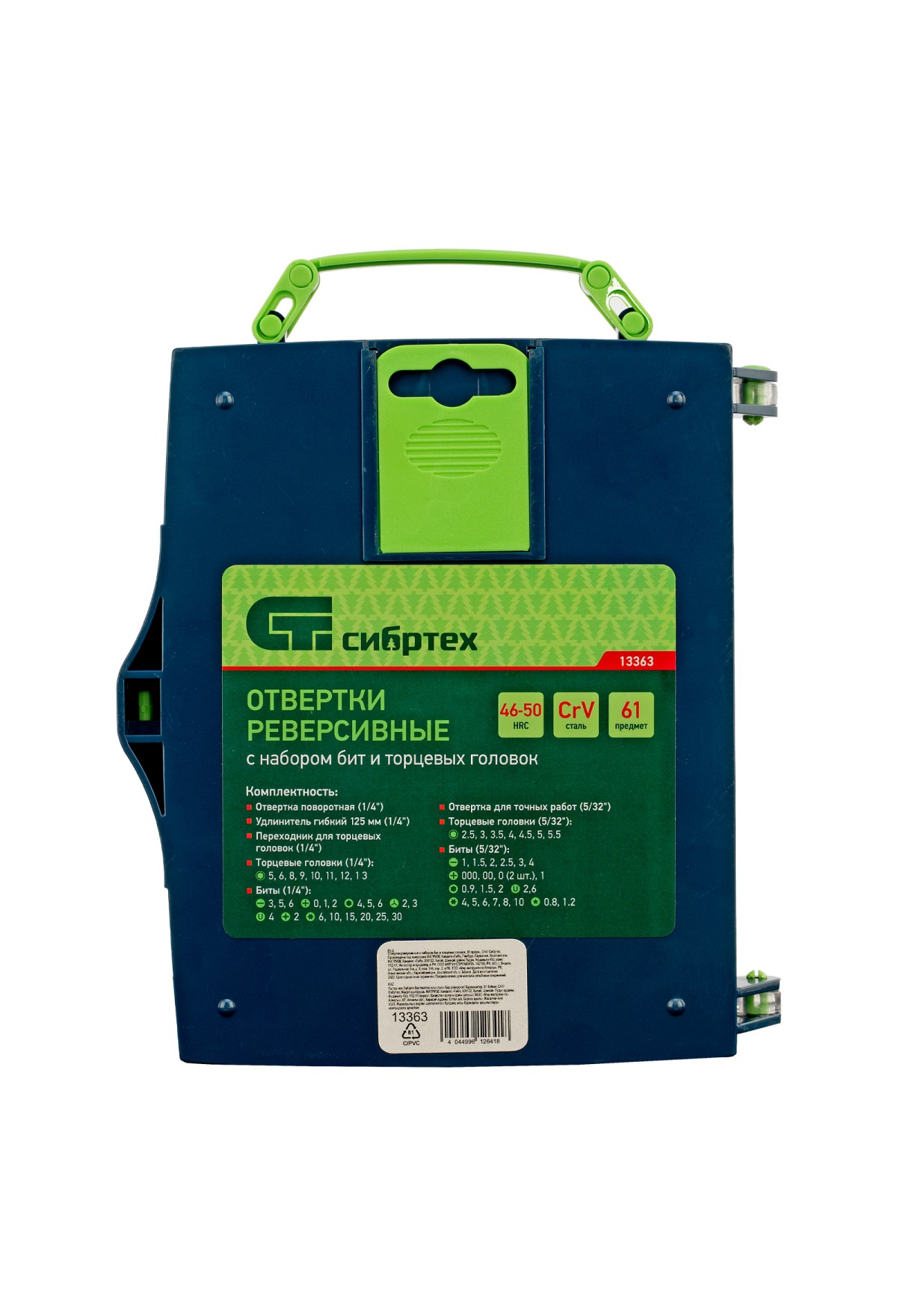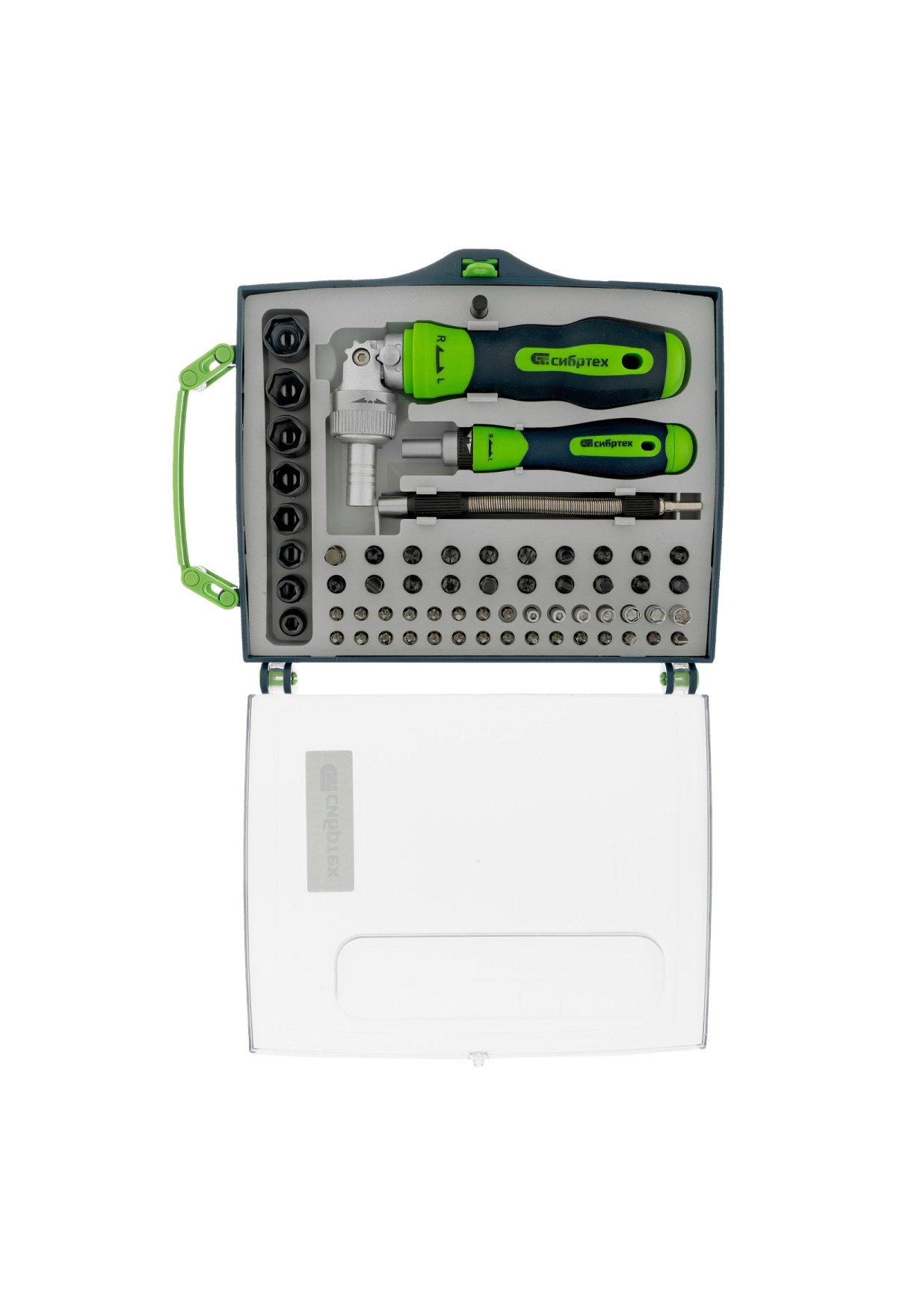 Технические характеристики Отвертки реверсивные с набором бит, торцевых головок, 61 предмет, CrV Сибртех