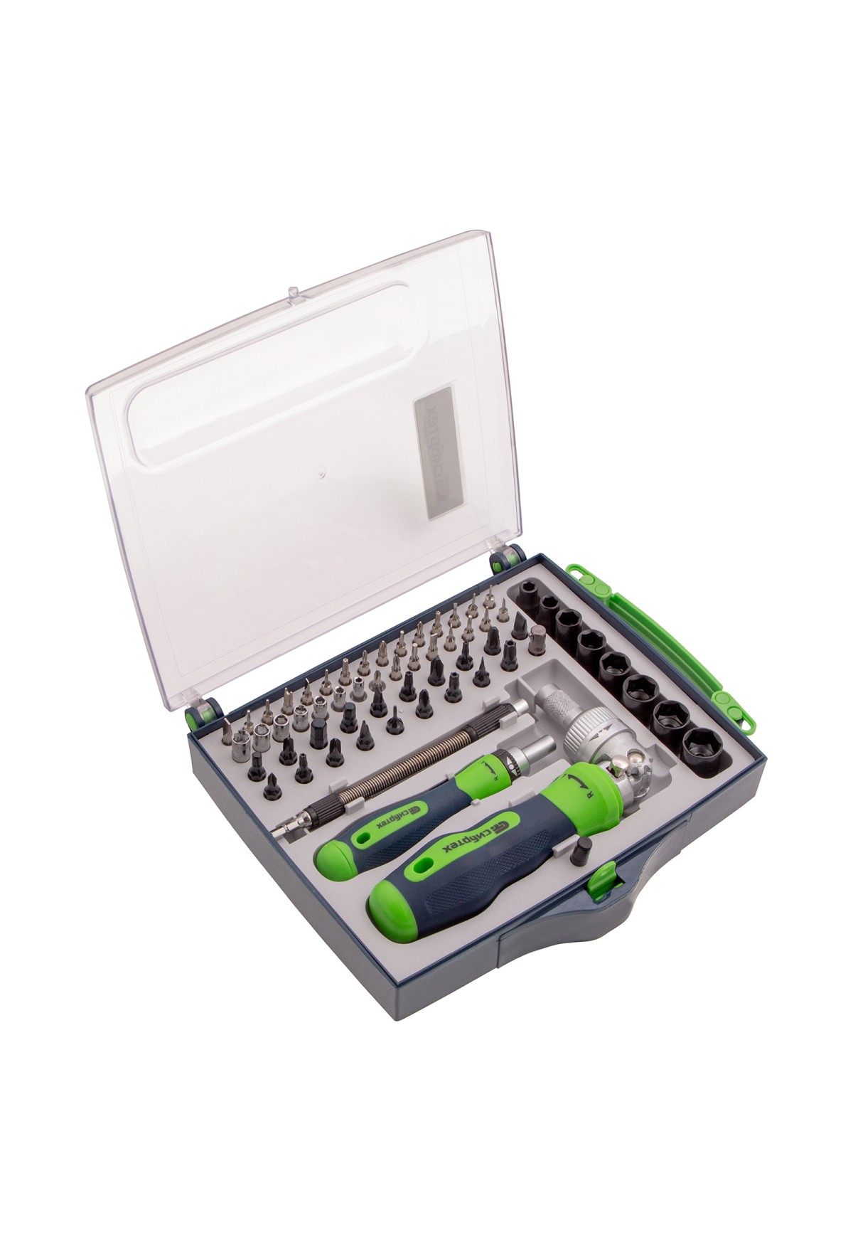 | Комплектация | Отвертка реверсивная - 1 штОтвертка реверсивная для точных работ - 1 штГибкий удлинитель - 1 штТорцевые головки: 5, 6, 8, 9, 10, 11, 12, 13 мм - 8 штБиты: SL3, SL5, SL6, PH0, PH1, PH2, PZ2, T6, Т10, Т15, Т20, Т25, Т30, H4, H5, H6, SP4, TW 2,3 - 18 шт |