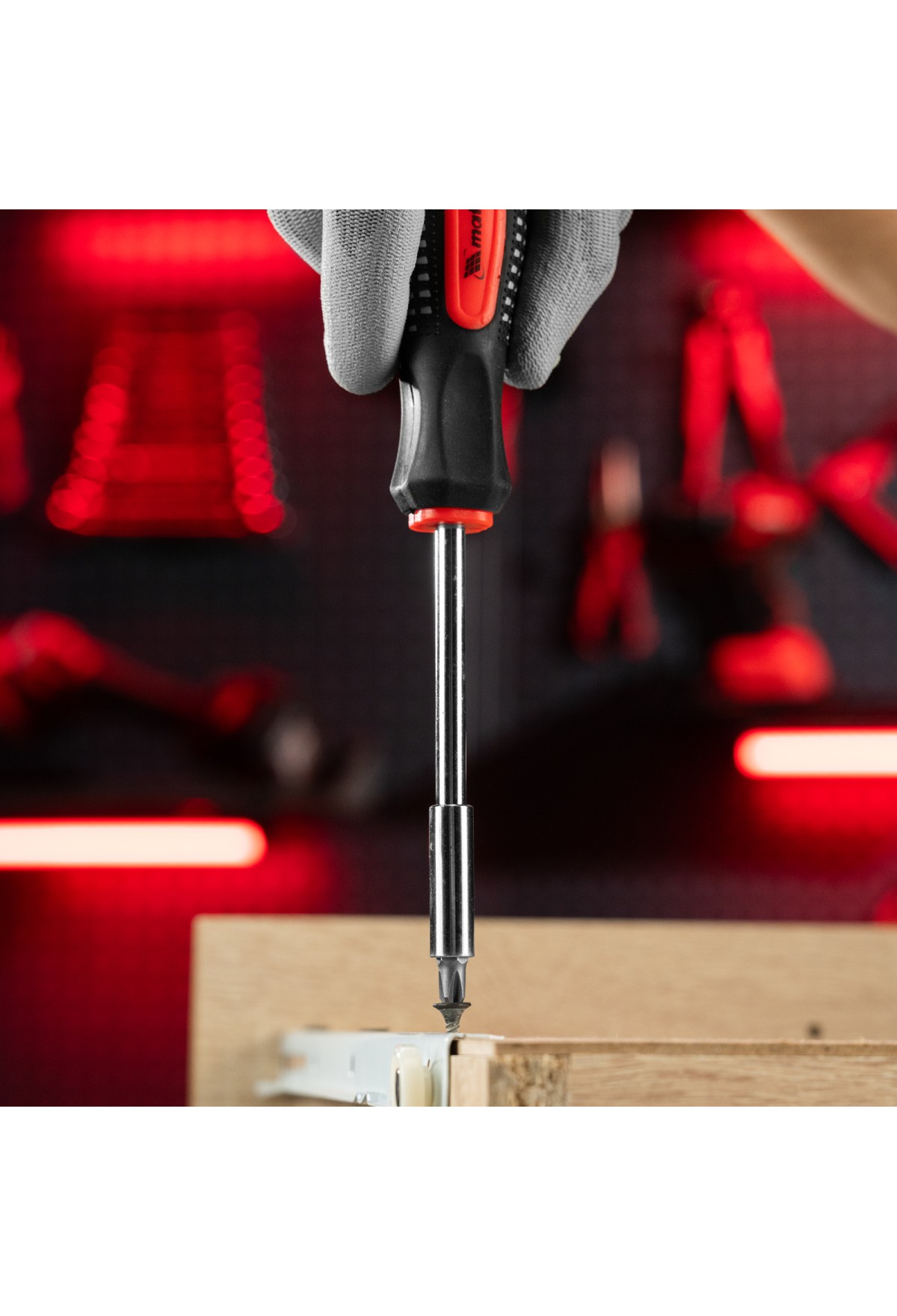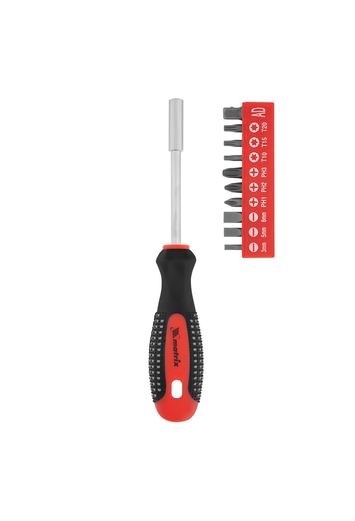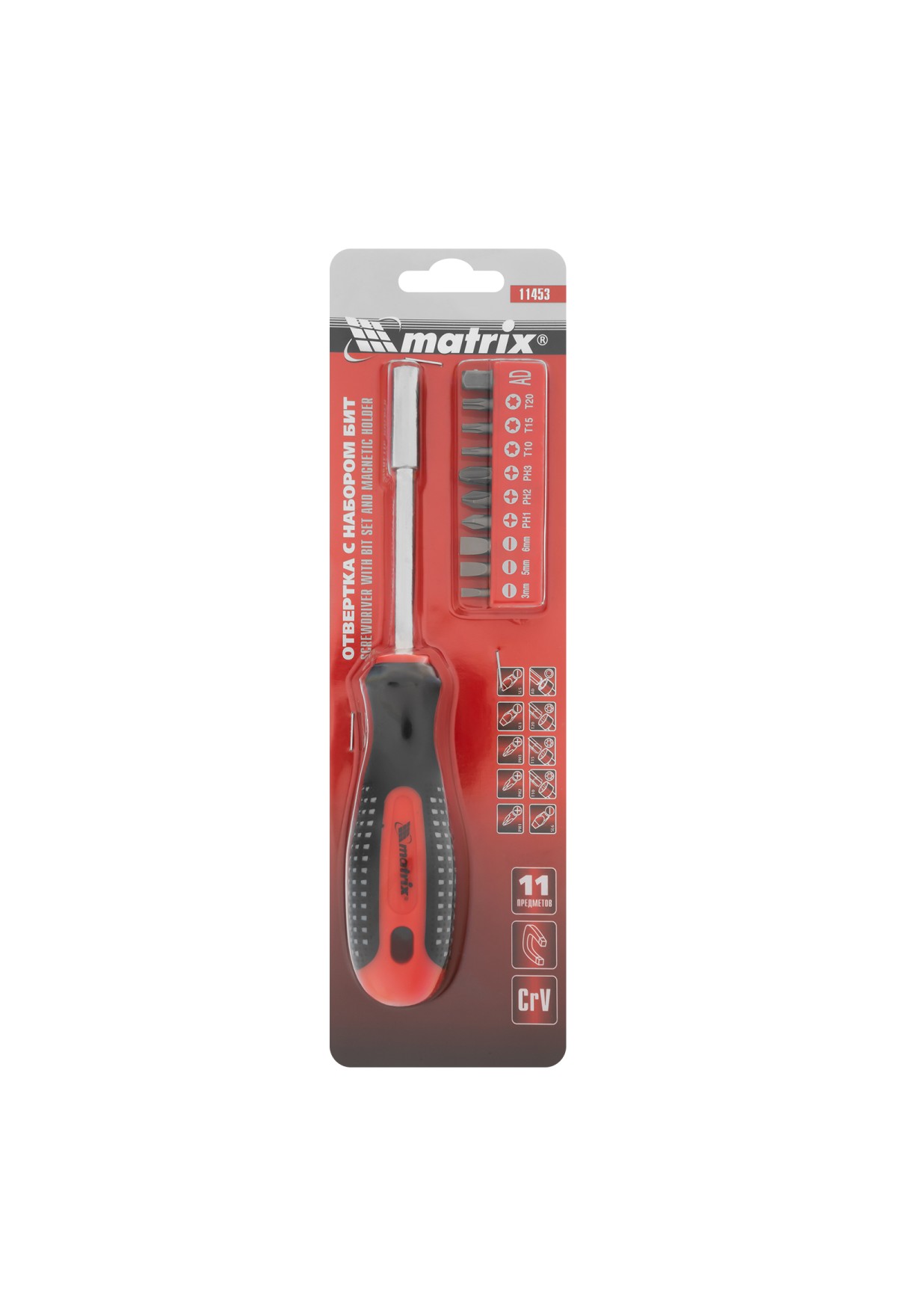 Отвертка с набором бит Matrix Fusion 11453 из стали CrV, с трехкомпонентной рукояткой «Anti slip», входит в комплект из 11 предметов, предназначенный для работы с резьбовым крепежом. Представляет собой отвертку-держатель и поставляется с битами наиболее распространенных размеров со шлицами PH, SL и Torx, поэтому заменяет собой несколько стандартных отверток. Набор пригодится для сборки мебели, ремонта электроприборов, будет полезен в гараже.
