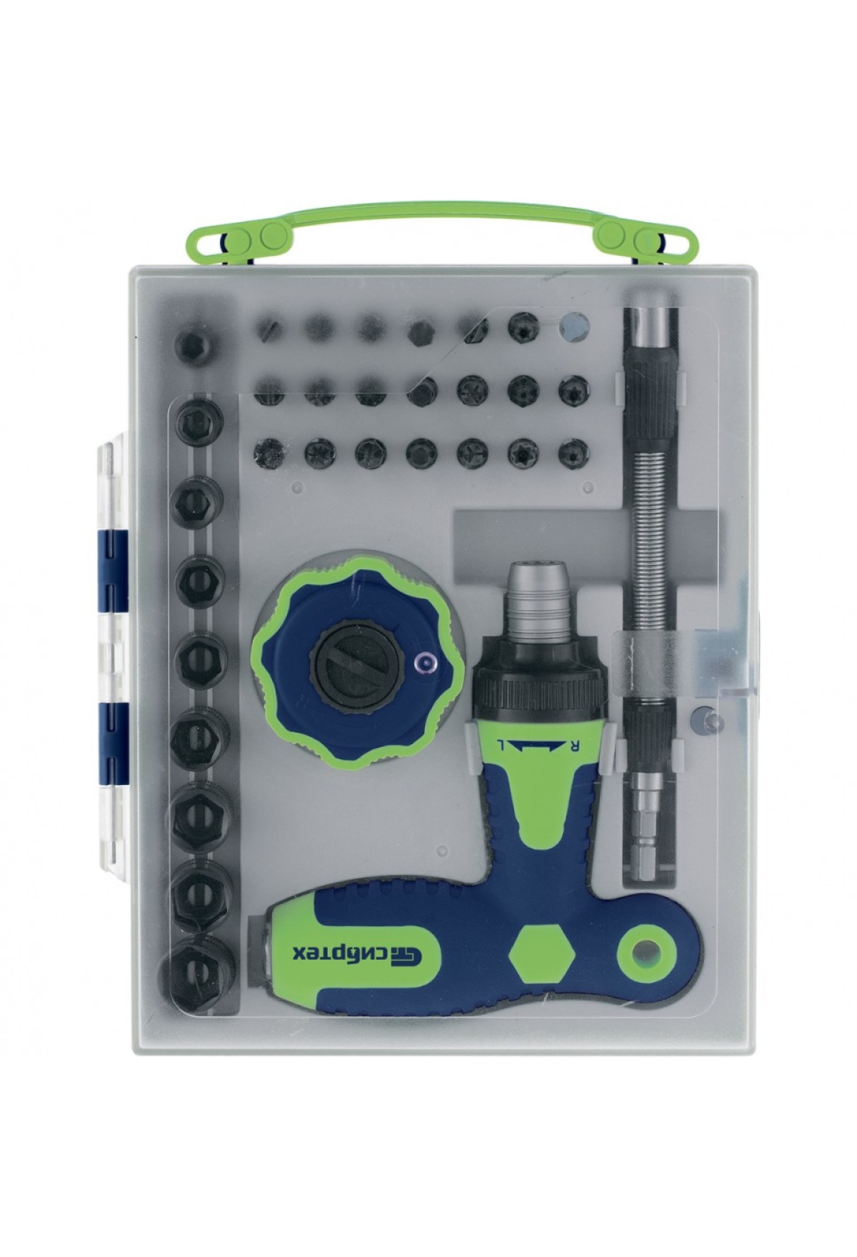 Отвертка Т-образная и трещотка, реверсивные с набором бит, торцевых головок, 34 предмета, CrV Сибртех