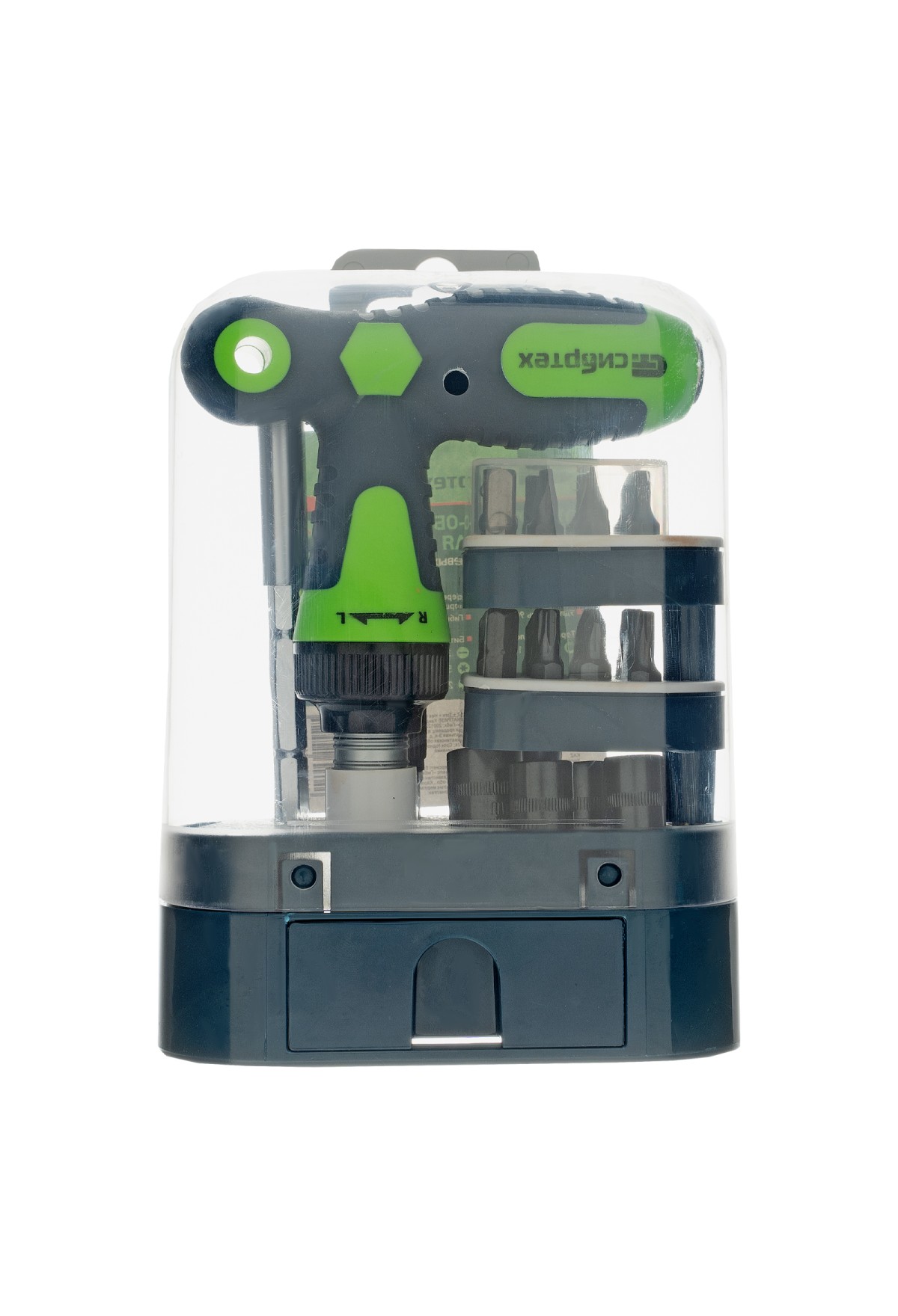 Т-образная реверсивная отвертка с набором бит и торцевых головок Сибртех 13382 входит в комплект из 33 предметов, выполненных из стали CrV. Инструменты предназначены для монтажа/демонтажа резьбовых соединений в условиях ограниченного пространства, где обычную отвертку использовать затруднительно. Набор включает биты для крепежа с профилем SL, PH, PZ, TR, TT, TW, TA, HEX, SPAN и торцевые головки для болтовых соединений.
