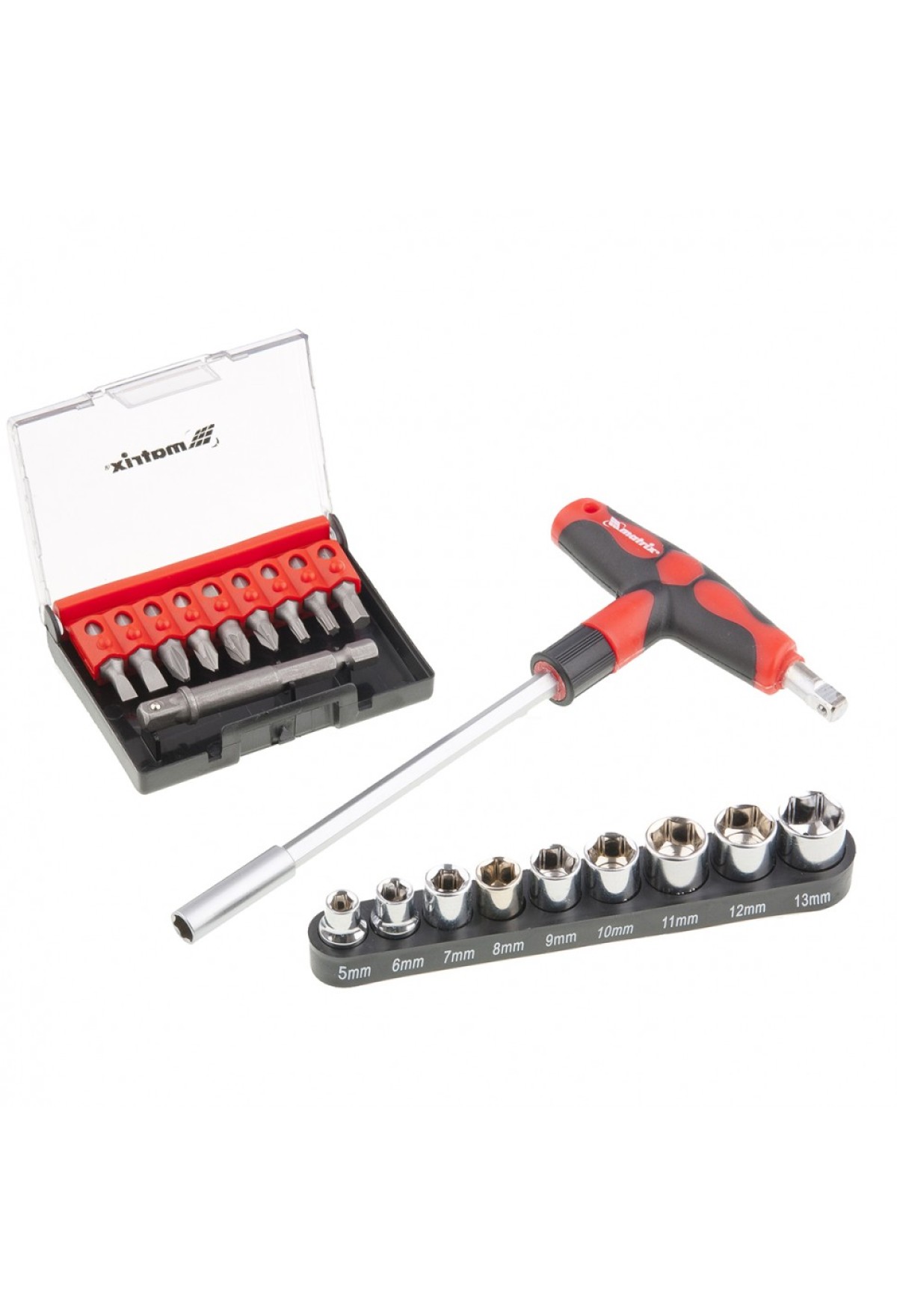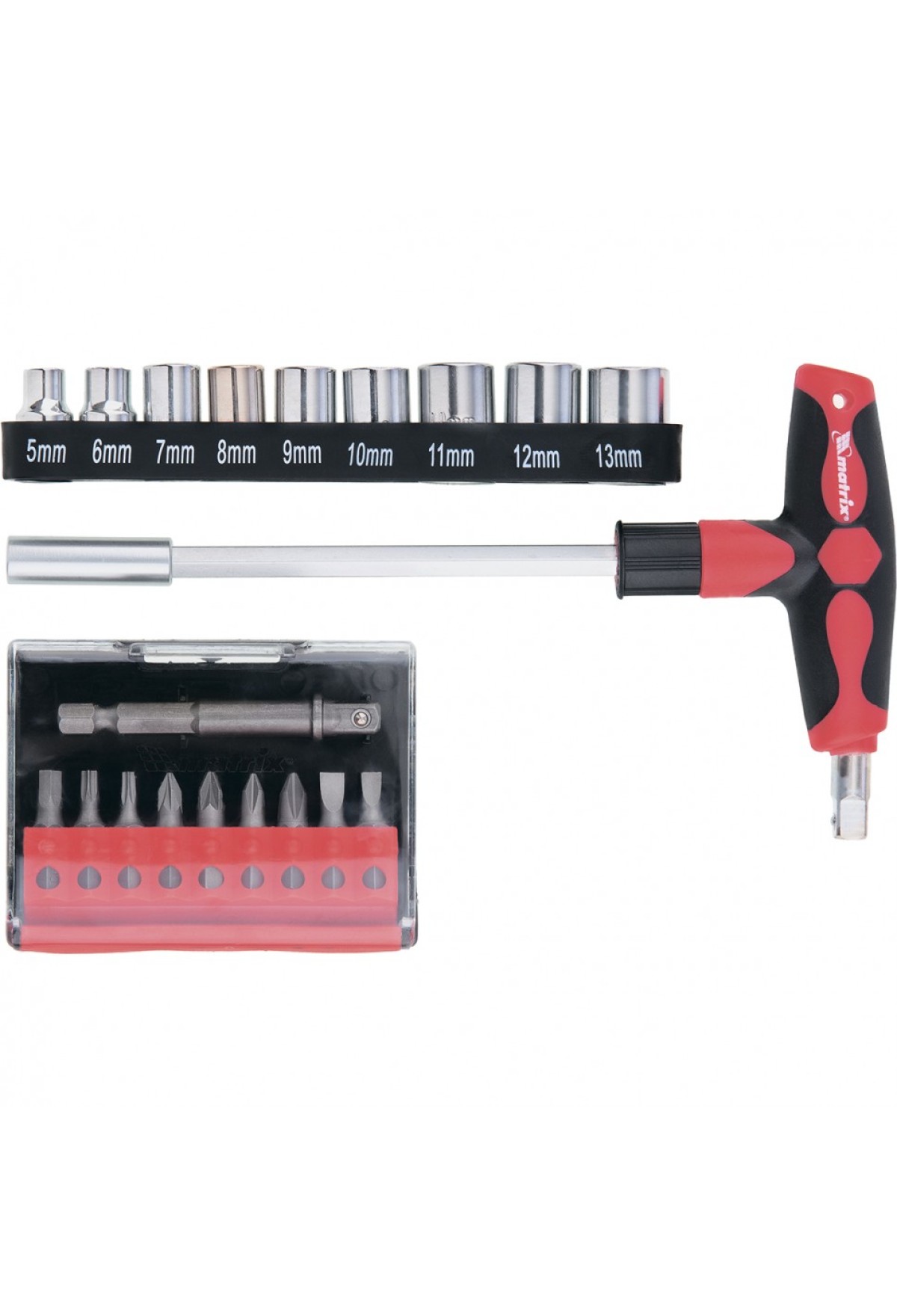 Отвертка Matrix 11574 с Т-образной эргономичной ручкой, набором бит и насадок (торцевых головок) из стали CrV, входит в комплект из 20 предметов, предназначенный для работы с резьбовым крепежом. В нем 9 бит и 9 торцевых головок, поэтому набор подходит для монтажа и демонтажа болтов, шурупов и гаек. Для фиксации бит предусмотрен присоединительный шестигранник размером 1/4", для торцевых головок имеется адаптер. Использование присоединительного квадрата размером 1/4", встроенного в ручку отвертки, позволяет увеличить длину рычага и работать со значительным усилием. Набор рекомендован для профессионального применения.