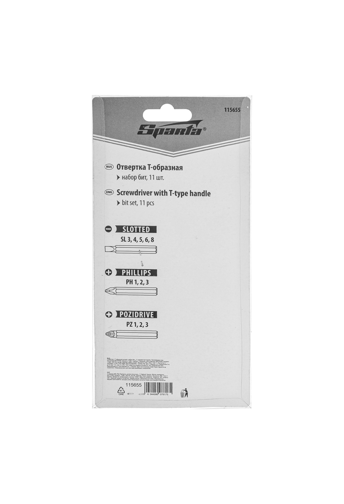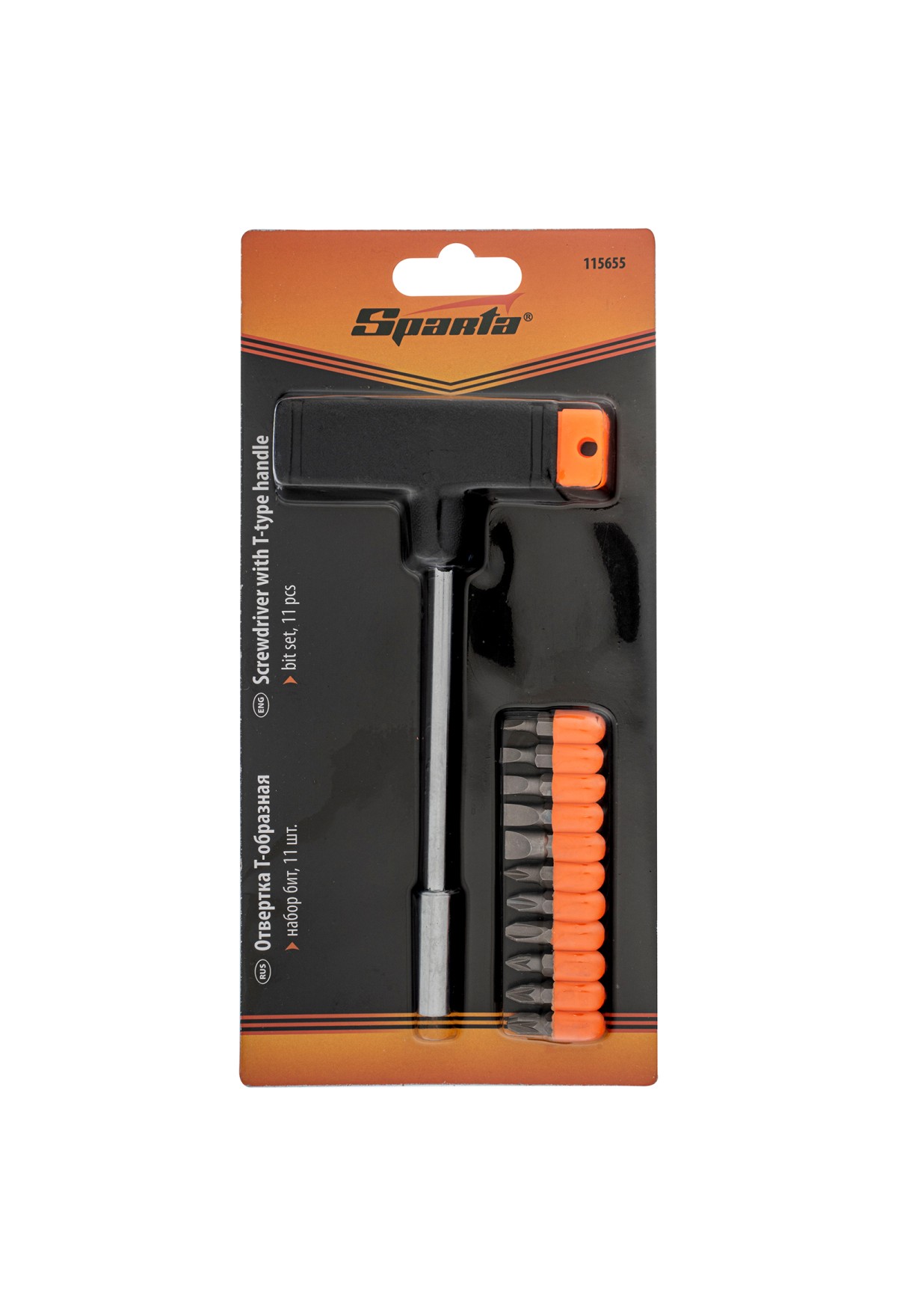 Отвертка Sparta 115655 с Т-образной ручкой, с набором бит из 11 предметов, используется для закручивания и откручивания винтов, саморезов и других крепежных элементов. В комплект поставки входят биты самых распространенных размеров со шлицами PH, PZ и SL. Т-образная рукоятка увеличивает силу крутящего момента, экономя силы мастера. Набор предназначен для ремонта техники, сборки мебели и рекомендован для применения в домашних условиях.