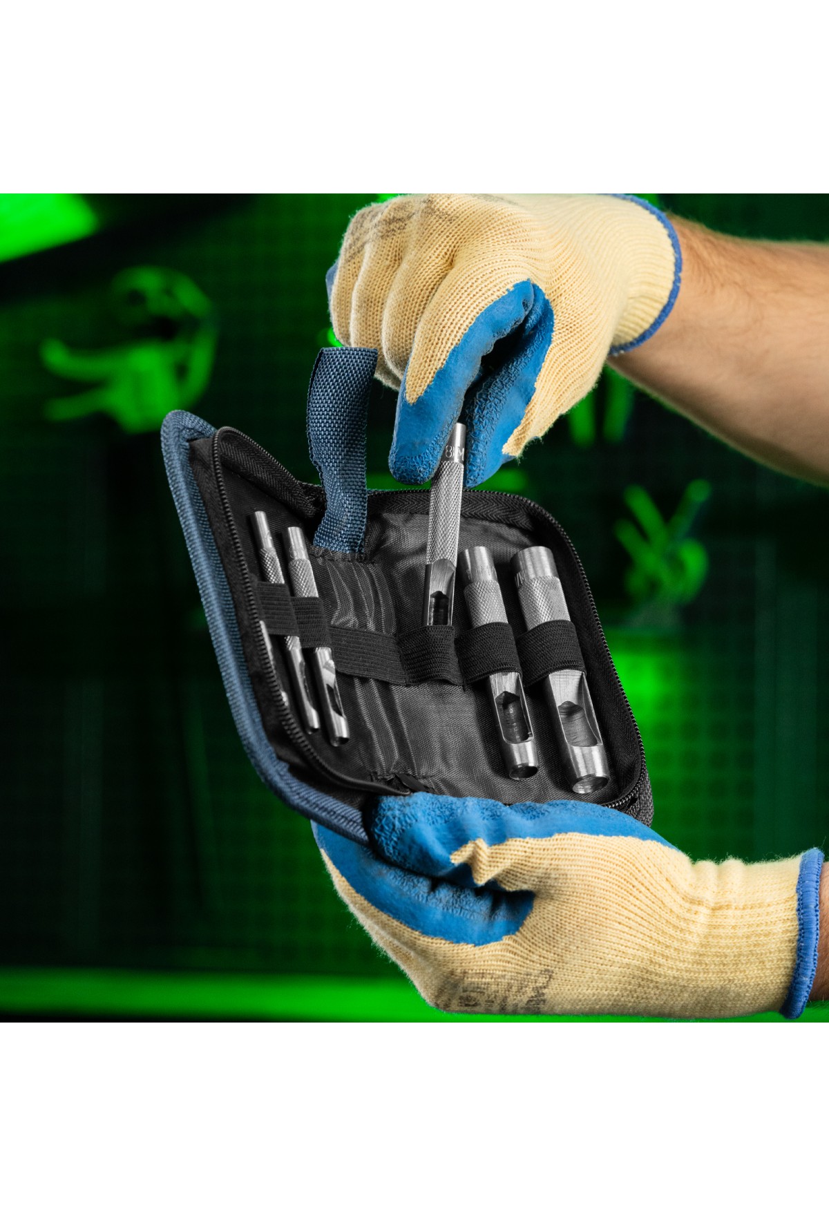 • Все пробойники в комплекте имеют рельефную рукоятку для надежного захвата и комфортной работы.
