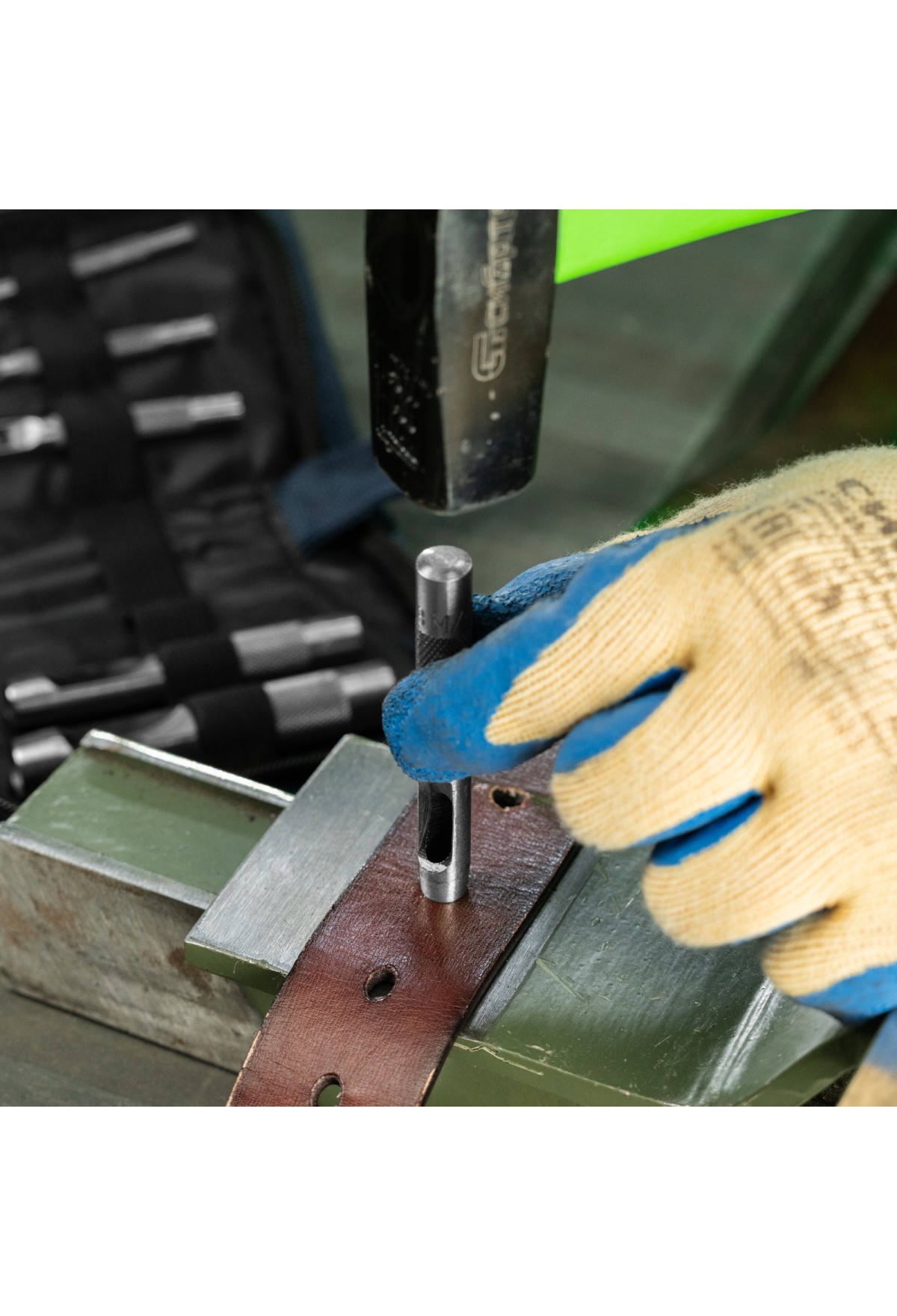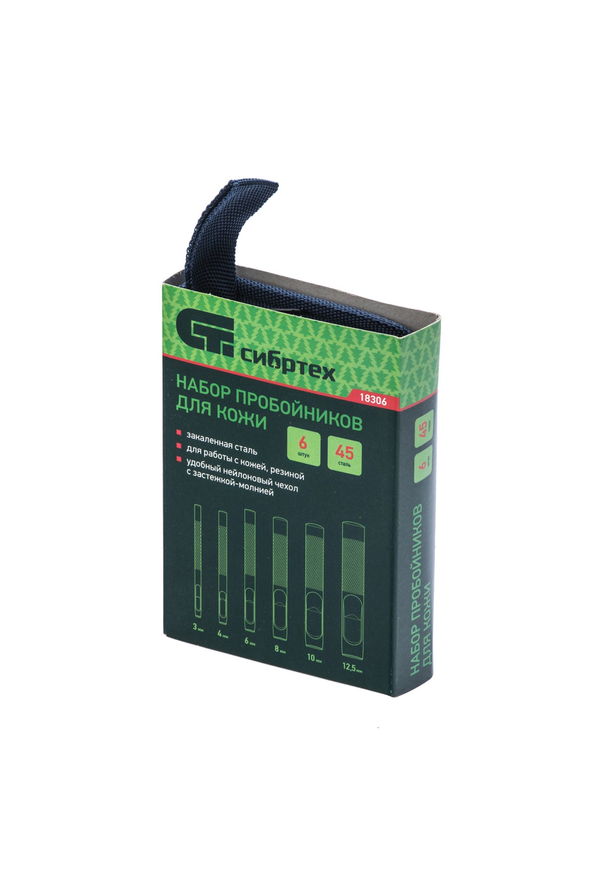 Набор пробойников для кожи Сибртех 18306, 6 шт. в чехле, позволяет пробить отверстия диаметром 3, 4, 6, 8, 10 и 12,5 мм посредством ударного воздействия от киянки. Инструменты предназначены для работы с плотными материалами: кожей и резиной. Благодаря высокоточной прецизионной заточке режущих кромок пробойники выполняют ровный и качественный рез.