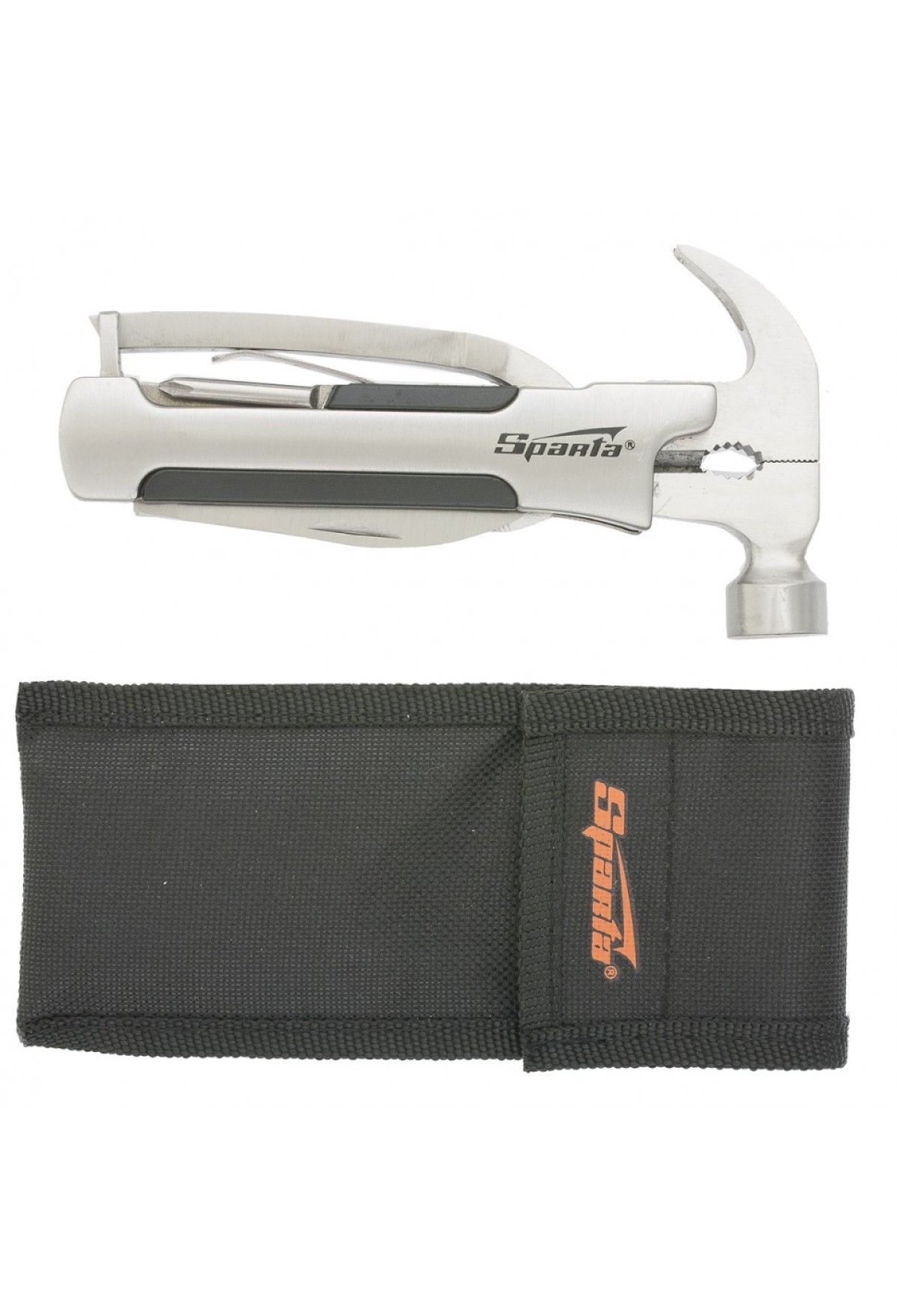 Трансформер Sparta 176075 выполняет 12 функций и включает в себя предметы, необходимые дома, на даче, рыбалке или охоте, а также в походе или поездке. Ножом можно разрезать веревку или вскрыть упаковку, а консервным ножом-открывалкой — открыть банку или бутылку. Молоток-гвоздодер пригодится для забивания и выпрямления гвоздей, а отвертки — для работы с резьбовым крепежом.