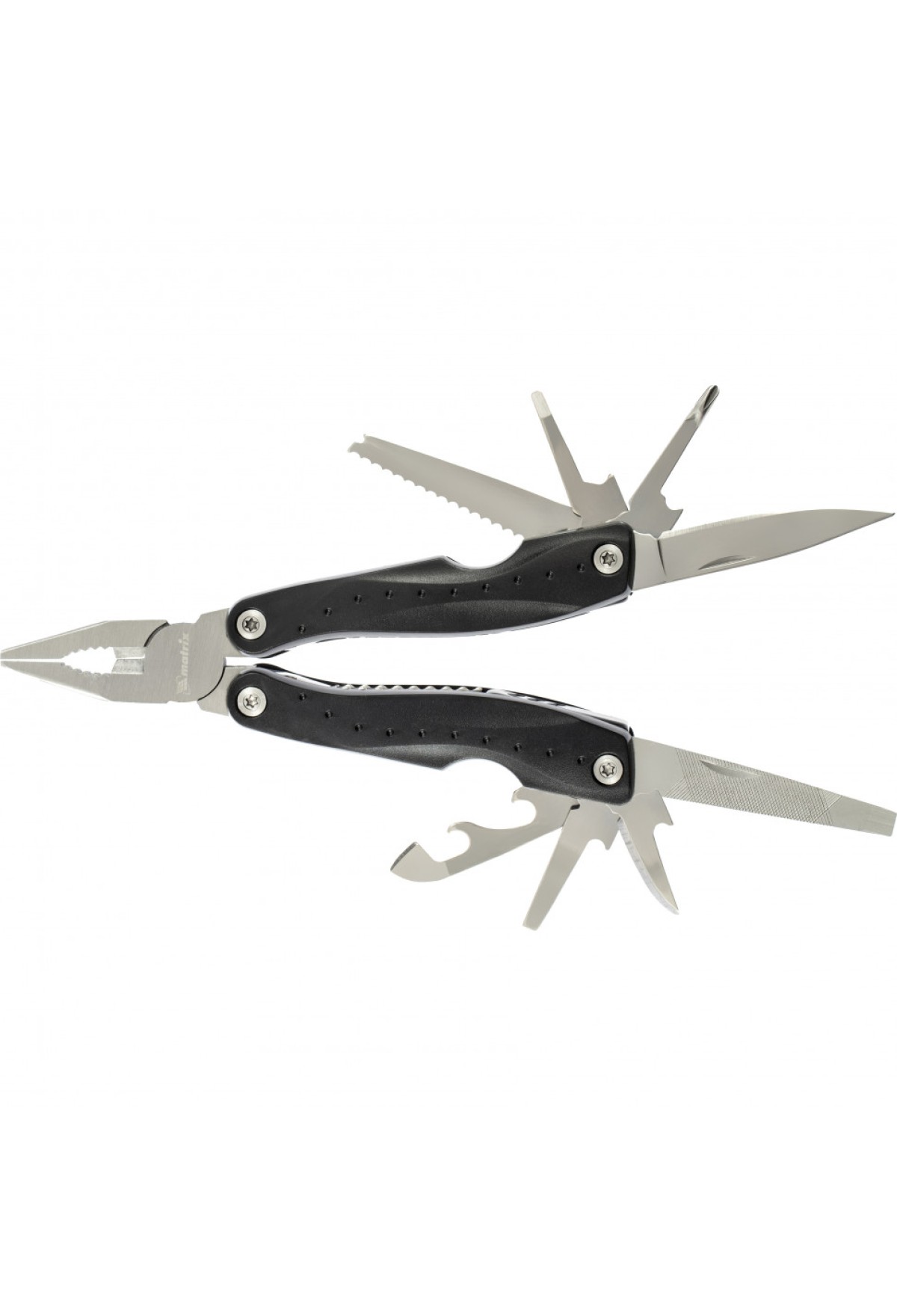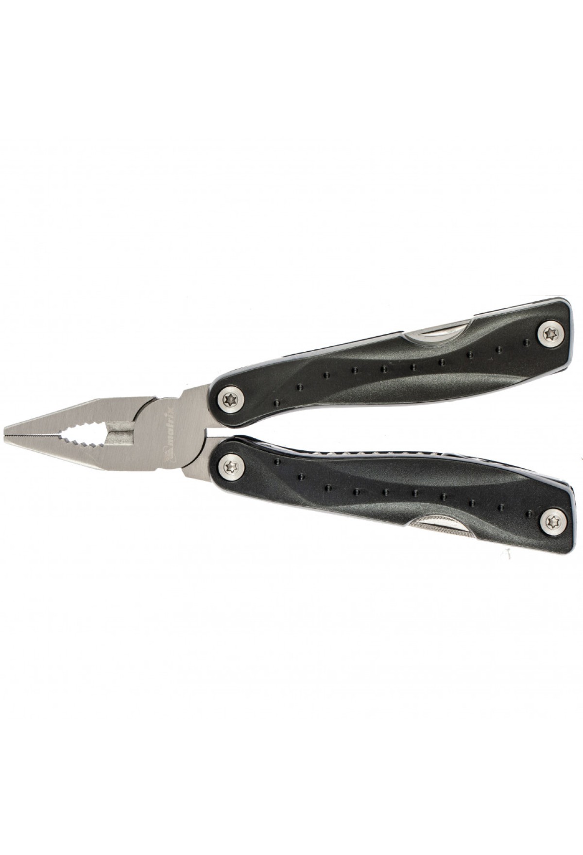 Трансформер Matrix 17621 длиной 160 мм имеет 13 функций и авторазжим, поставляется с чехлом. Его можно использовать в гараже — мультитул включает в себя длинногубцы с кусачками и захватом полукруглых предметов, а также отвертки. Инструмент пригодится в походе, на рыбалке или охоте, поскольку имеет в составе нож, пилу, открывалку и консервный нож. Благодаря пилке для ногтей трансформер будет полезен и в быту.