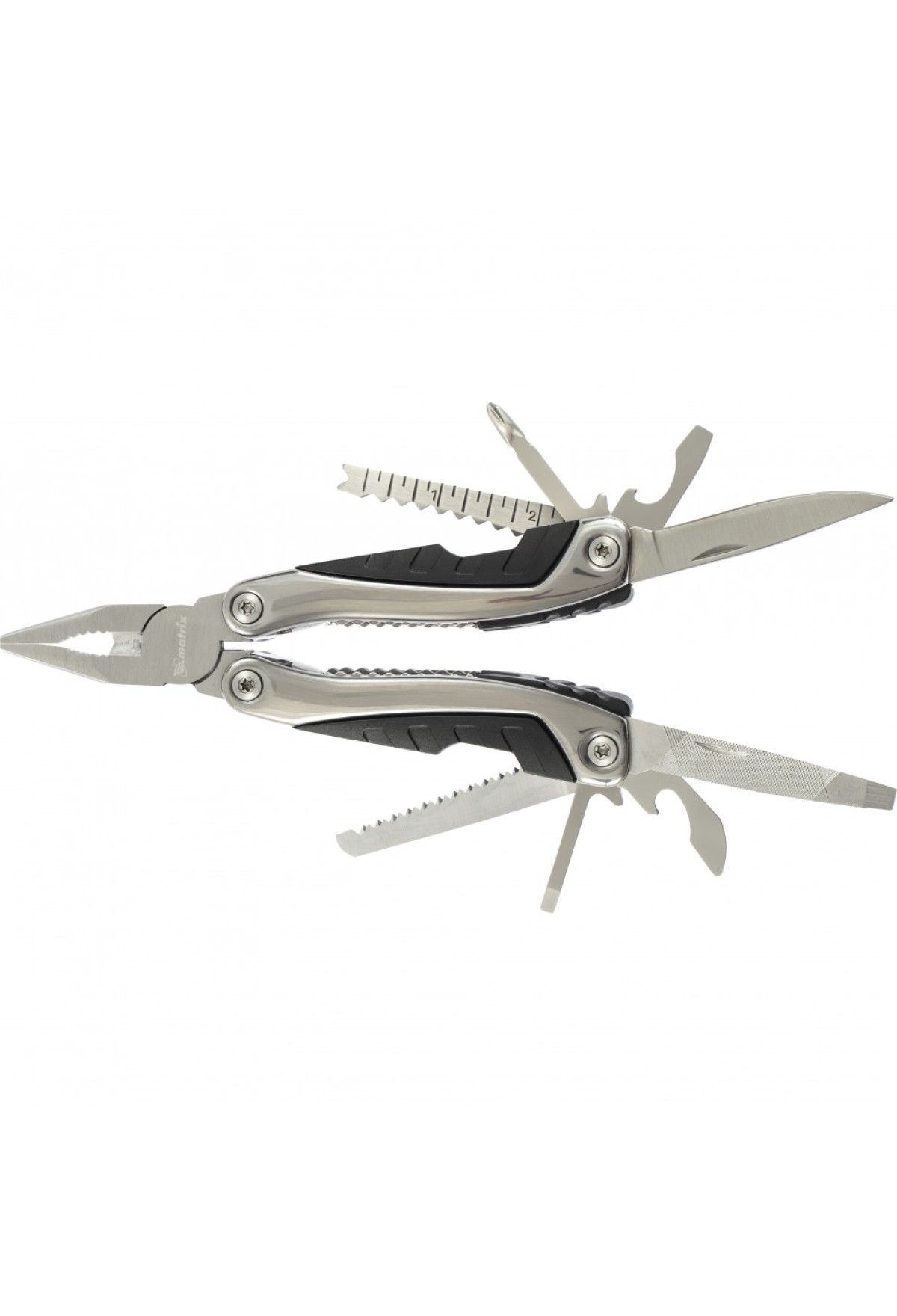 Трансформер Matrix 17623 длиной 160 мм имеет 15 функций и авторазжим, поставляется с чехлом. Может использоваться в гараже, т.к. включает длинногубцы с кусачками и захватом полукруглых предметов, а также отвертки и линейку. Трансформер пригодится в походе, на рыбалке или охоте, поскольку имеет в составе нож, пилу, открывалку, консервный нож, инструменты для чистки рыбы и удаления крючка. Благодаря пилке для ногтей мультитул будет полезен в быту.