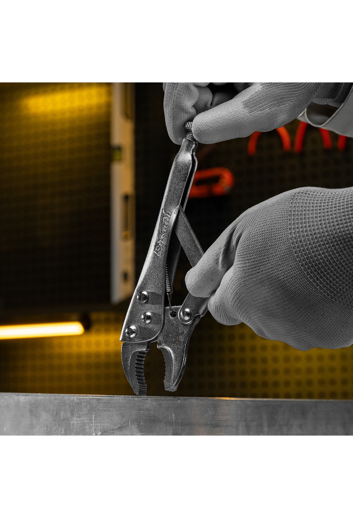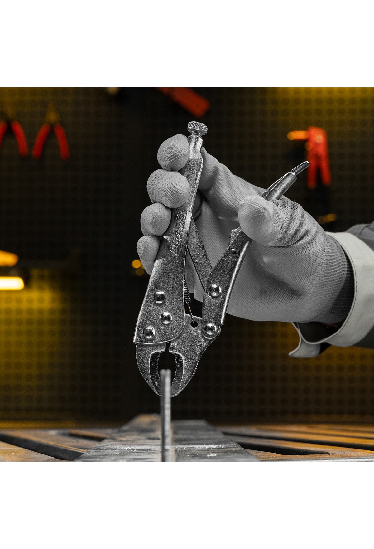 Ручной зажим Sparta 184205 длиной 180 мм, с полукруглым захватом, позволяет фиксировать детали разной формы для последующей сварки, резки, шлифовки и других работ. Используется в слесарном деле, во время строительства и ремонта, для проведения кузовных работ, а также полезен в быту.