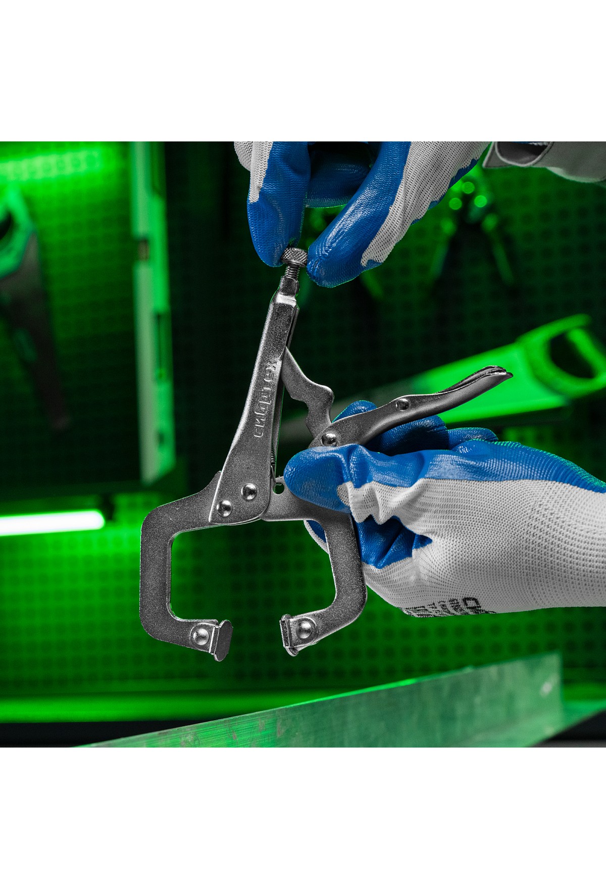 Ручной зажим Сибртех 18425 длиной 170 мм, с увеличенным захватом и подвижными губками, позволяет фиксировать и удерживать детали и заготовки в заданном положении. При этом руки мастера остаются свободными. Подвижные губки позволяют работать с предметами сложной формы. Зажим используется для сварочных, столярных, слесарных работ. Применяется во время проведения строительных и ремонтных работ, а также будет полезен дома, в гараже или на даче.