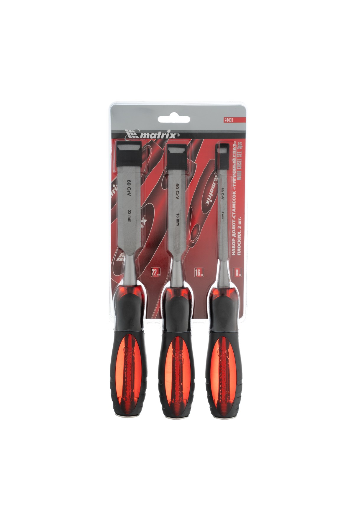 Набор долот-стамесок плоских Matrix «Тигровый глаз» 24431, 3 штуки 8-16-22 мм, используется для обработки древесины любых пород. Стамески позволяют выбирать пазы, проделывать выемки, снимать фаски, выдалбливать отверстия разной ширины. Рукоятки из ударопрочного пластика имеют металлический затыльник и выдерживают удары киянкой или молотком для легкого врезания в древесину любой твердости. Набор пригодится столярам, плотникам и мебельным мастерам.