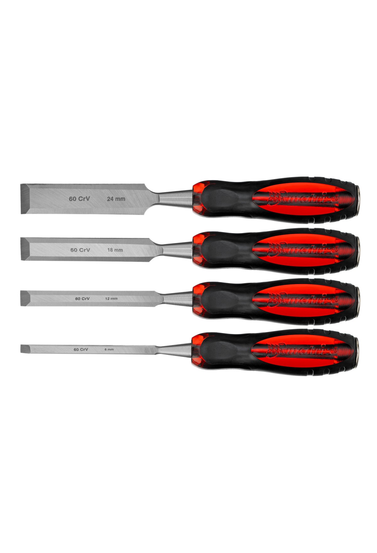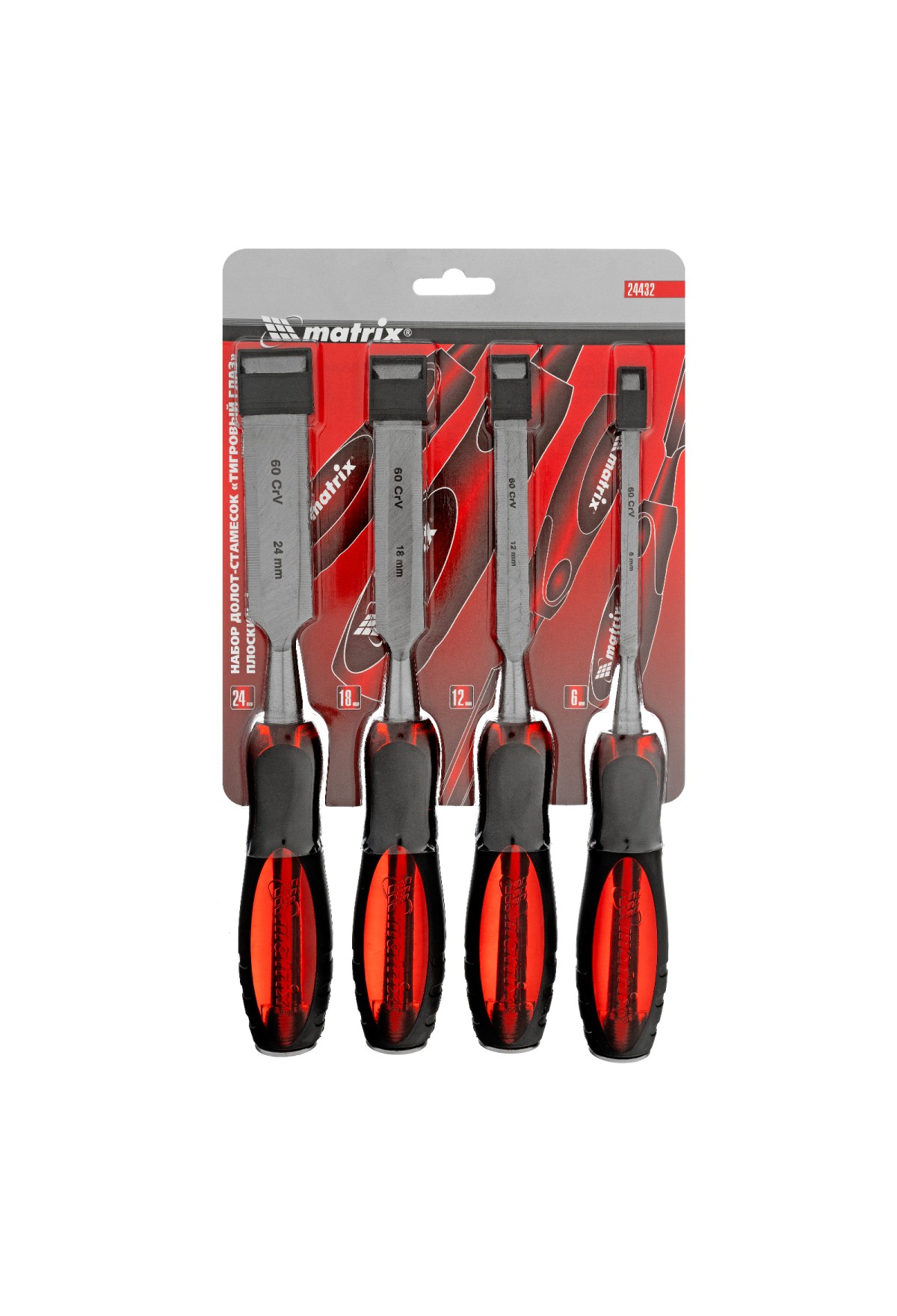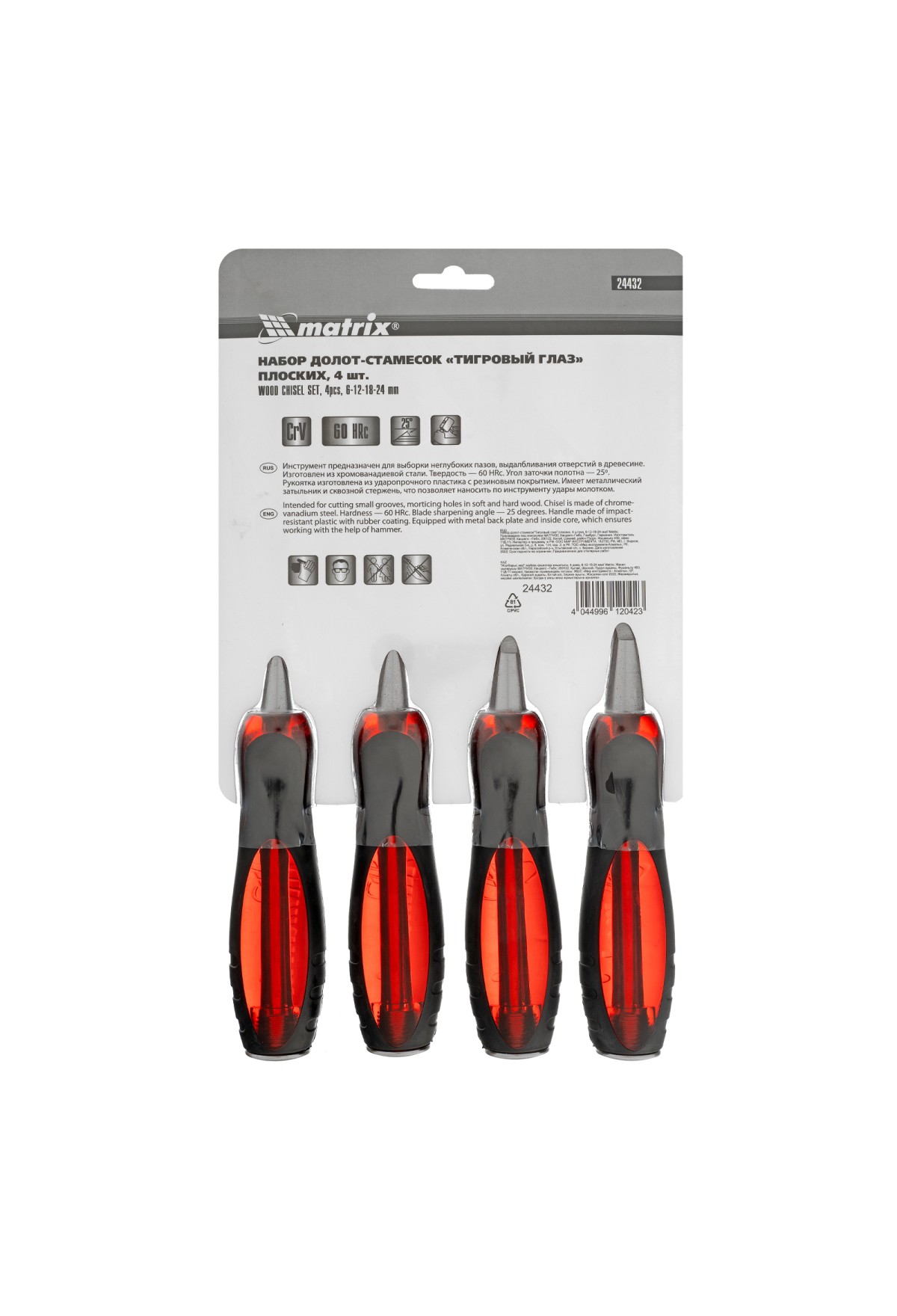 Набор долот-стамесок плоских Matrix «Тигровый глаз» 24432, 4 штуки размером 6-12-18-24 мм, используется для обработки древесины любых пород. Стамески позволяют выбирать пазы, проделывать выемки, снимать фаски, выдалбливать отверстия разной ширины. Рукоятки из ударопрочного пластика имеют металлический затыльник и выдерживают удары киянкой или молотком для легкого врезания в древесину любой твердости. Набор пригодится столярам, плотникам и мебельным мастерам.