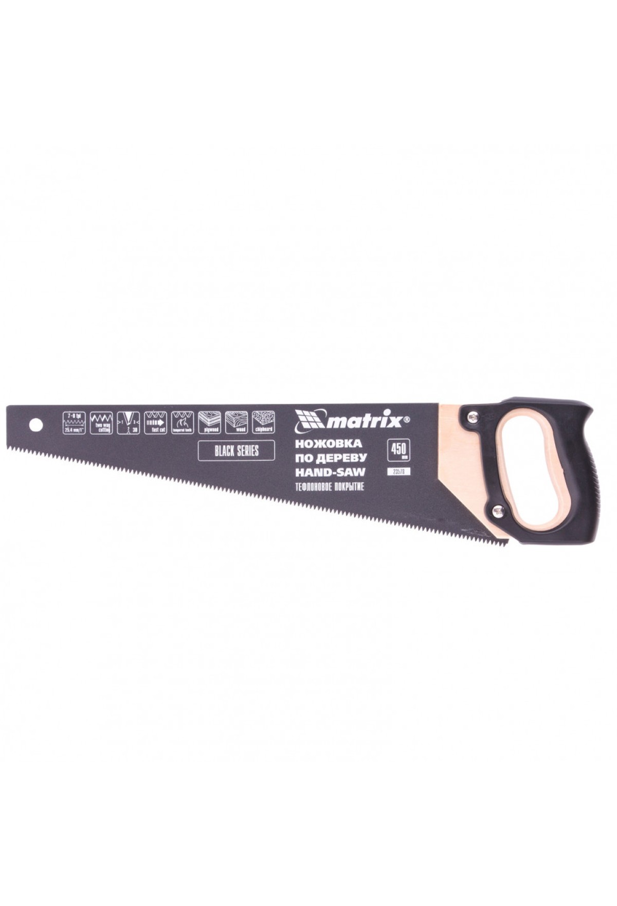 Ножовка по дереву Matrix 23578 с полотном длиной 450 мм, с калеными зубьями с 3D-заточкой и шагом 7-8 TPI, с тефлоновым покрытием и деревянной рукояткой, служит для продольного и поперечного пиления древесины, фанеры и ДСП. Режущая часть не требует заточки и содержит 7-8 зубьев на дюйм, что обеспечивает быстрый рез. Благодаря трехгранной заточке зубьев ножовка обладает высокой производительностью. Инструмент будет полезен для проведения плотницких работ в мастерской, а также дома или на даче.