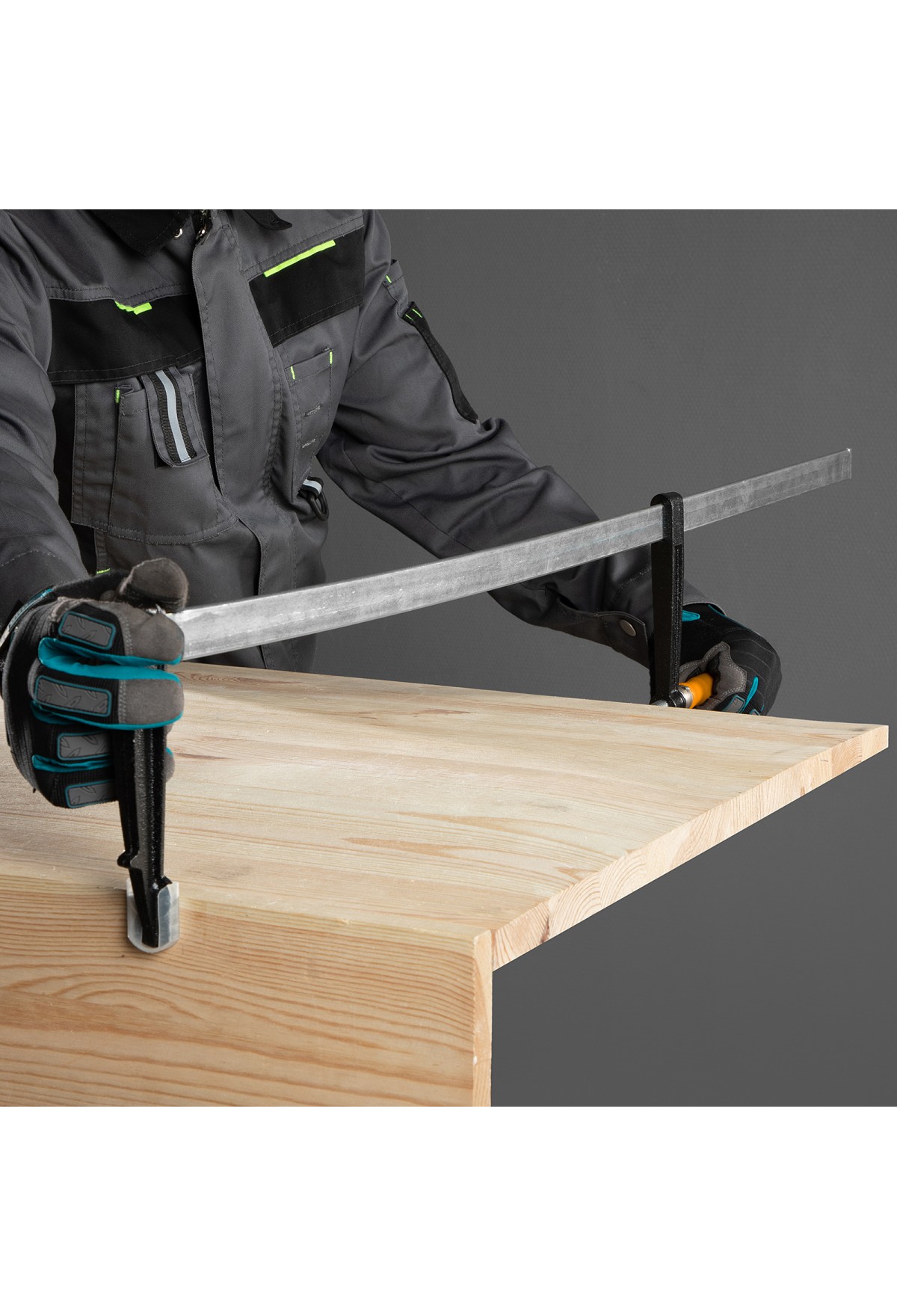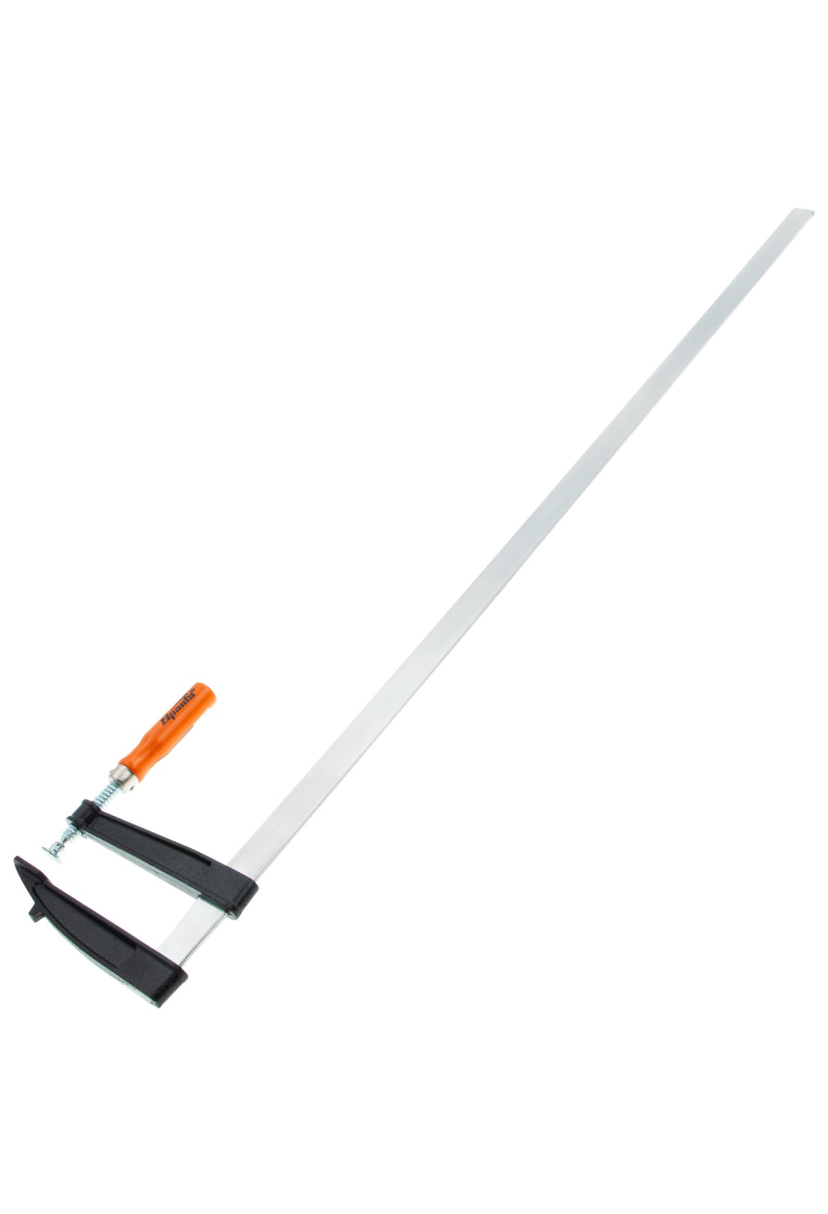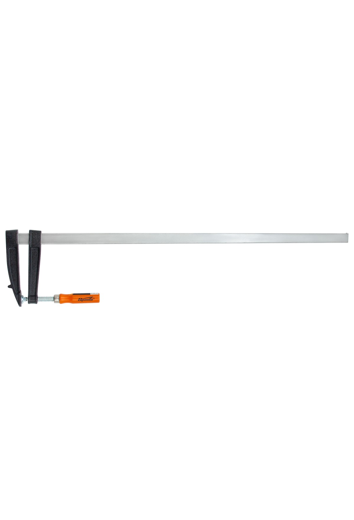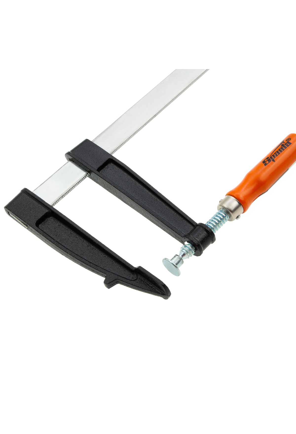 F-образная струбцина Sparta 204475, 1000 х 120 х 1050 мм, используется в столярном и слесарном деле и позволяет фиксировать заготовки из металла, древесины и других материалов для их соединения или обработки. Деталь помещают между губками, одна из которых подвижна и служит для регулировки величины захвата. Винтовой зажим позволяет прикладывать значительное усилие для надежной фиксации. Защитные накладки предотвращают повреждение детали. Элементы конструкции выдерживают высокую температуру, поэтому струбцина подходит для проведения сварочных работ, при этом пластиковые накладки необходимо снять.