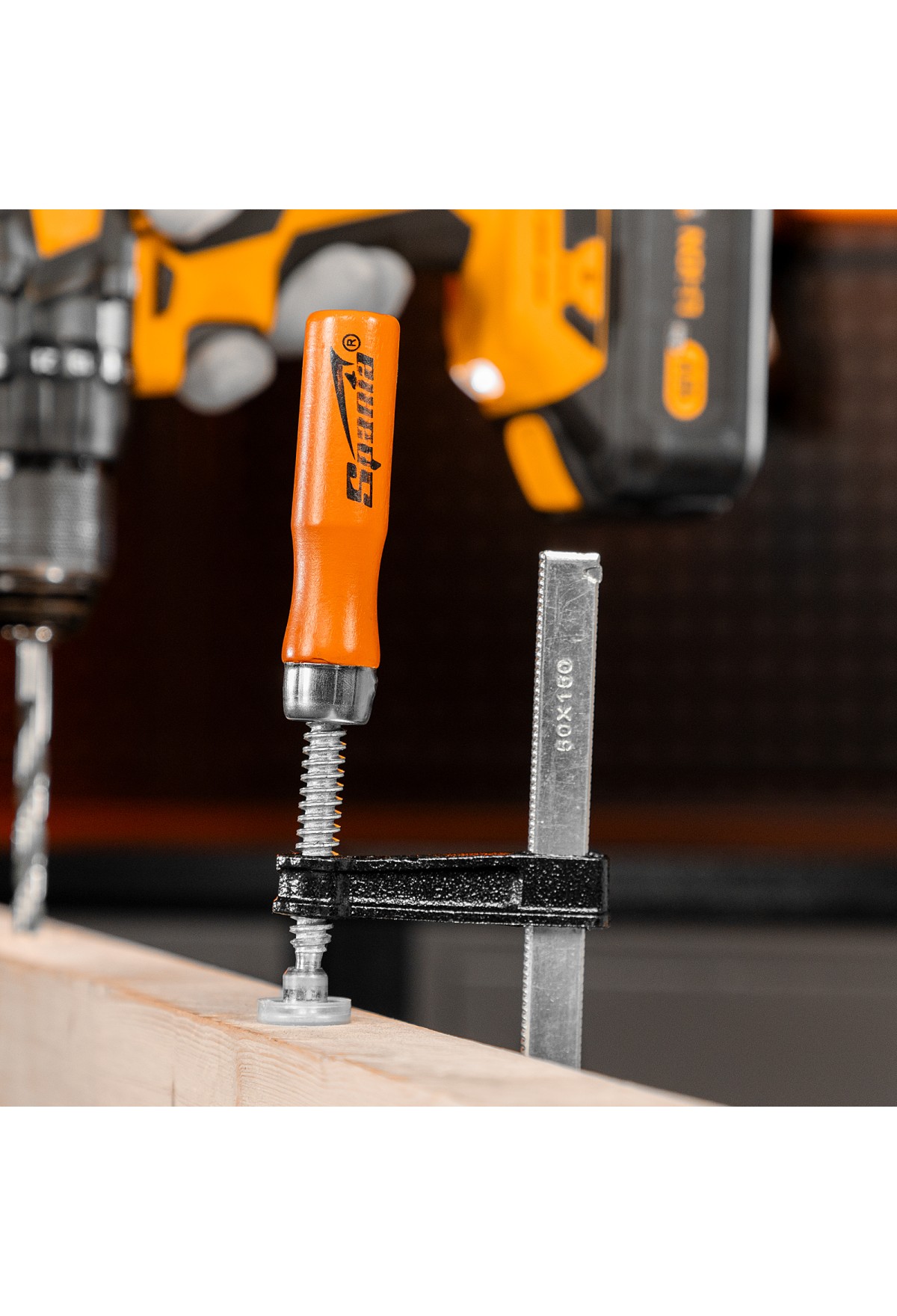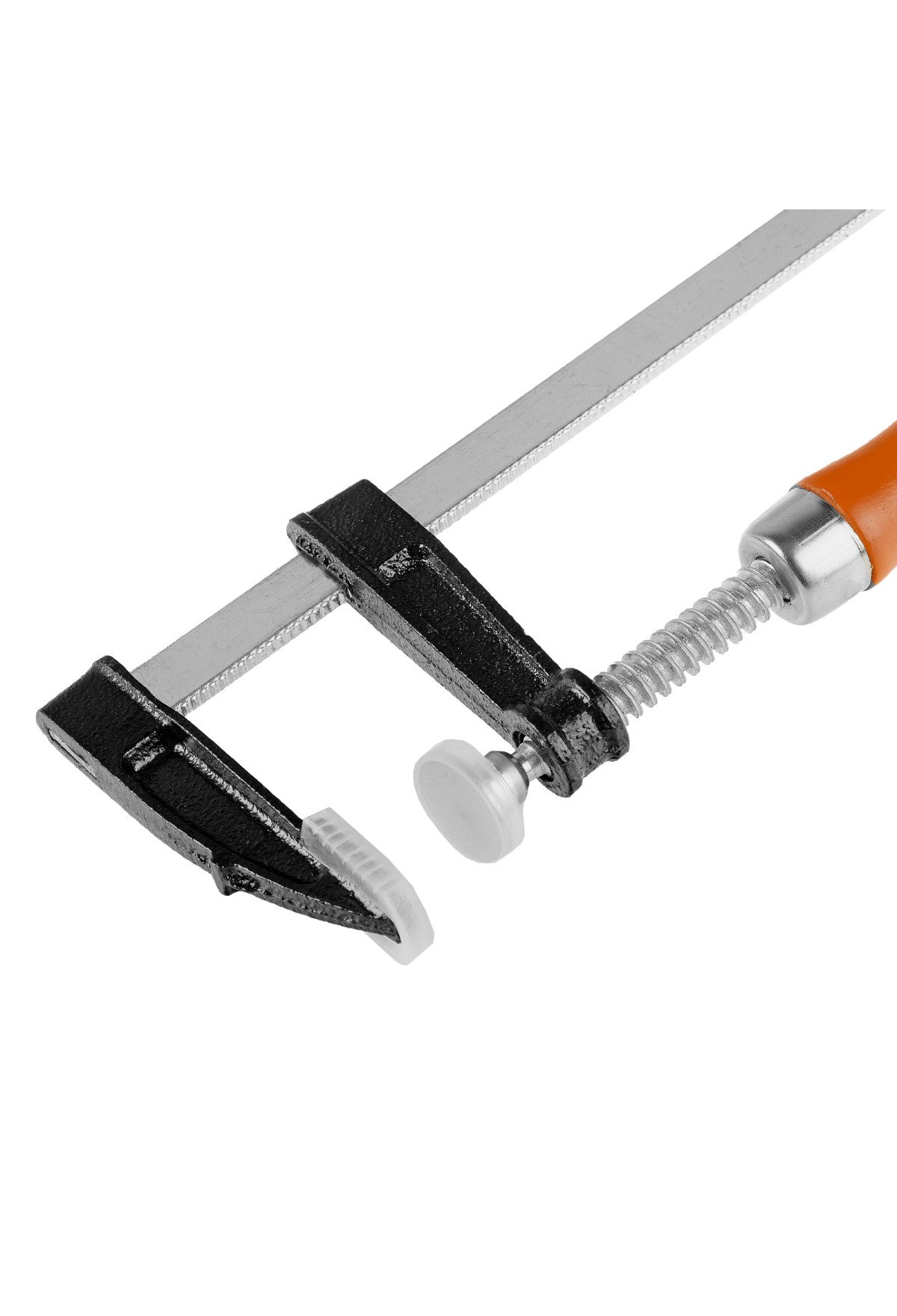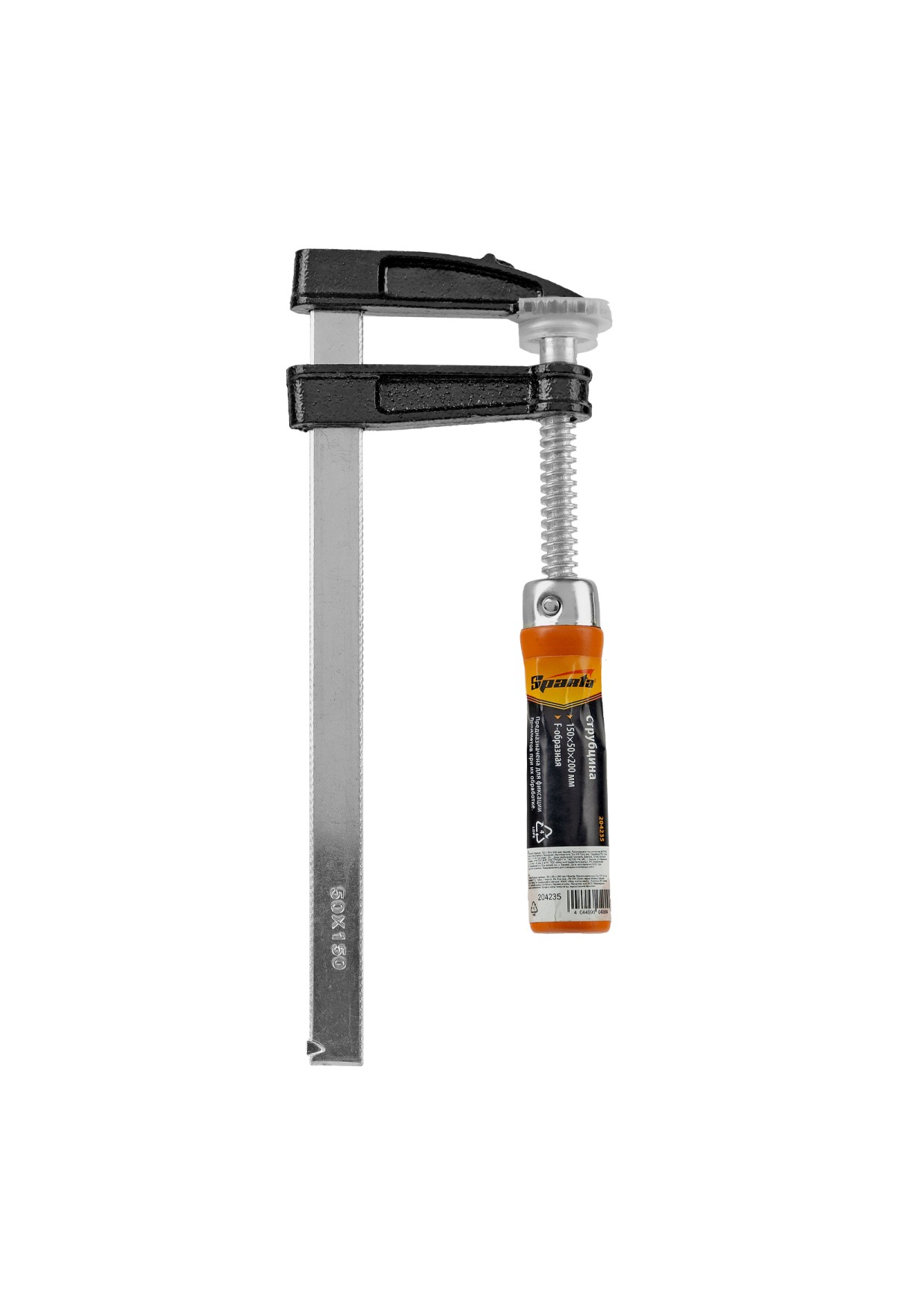 F-образная струбцина Sparta 204235 длиной 200 мм и величиной зажима 150 х 50 мм позволяет фиксировать заготовки из металла, древесины и других материалов для их соединения или обработки. Используется в столярном и слесарном деле. Деталь помещают между губками, одна из которых подвижна и служит для регулировки величины захвата. Винтовой зажим позволяет фиксировать заготовку со значительным усилием. Элементы конструкции выдерживают высокую температуру, поэтому струбцина подходит для проведения сварочных работ, при этом пластиковые накладки необходимо снять.