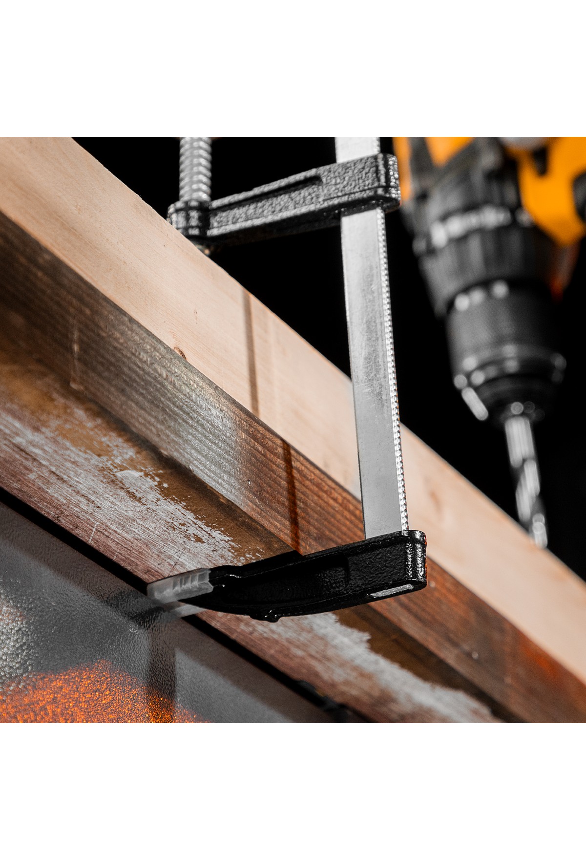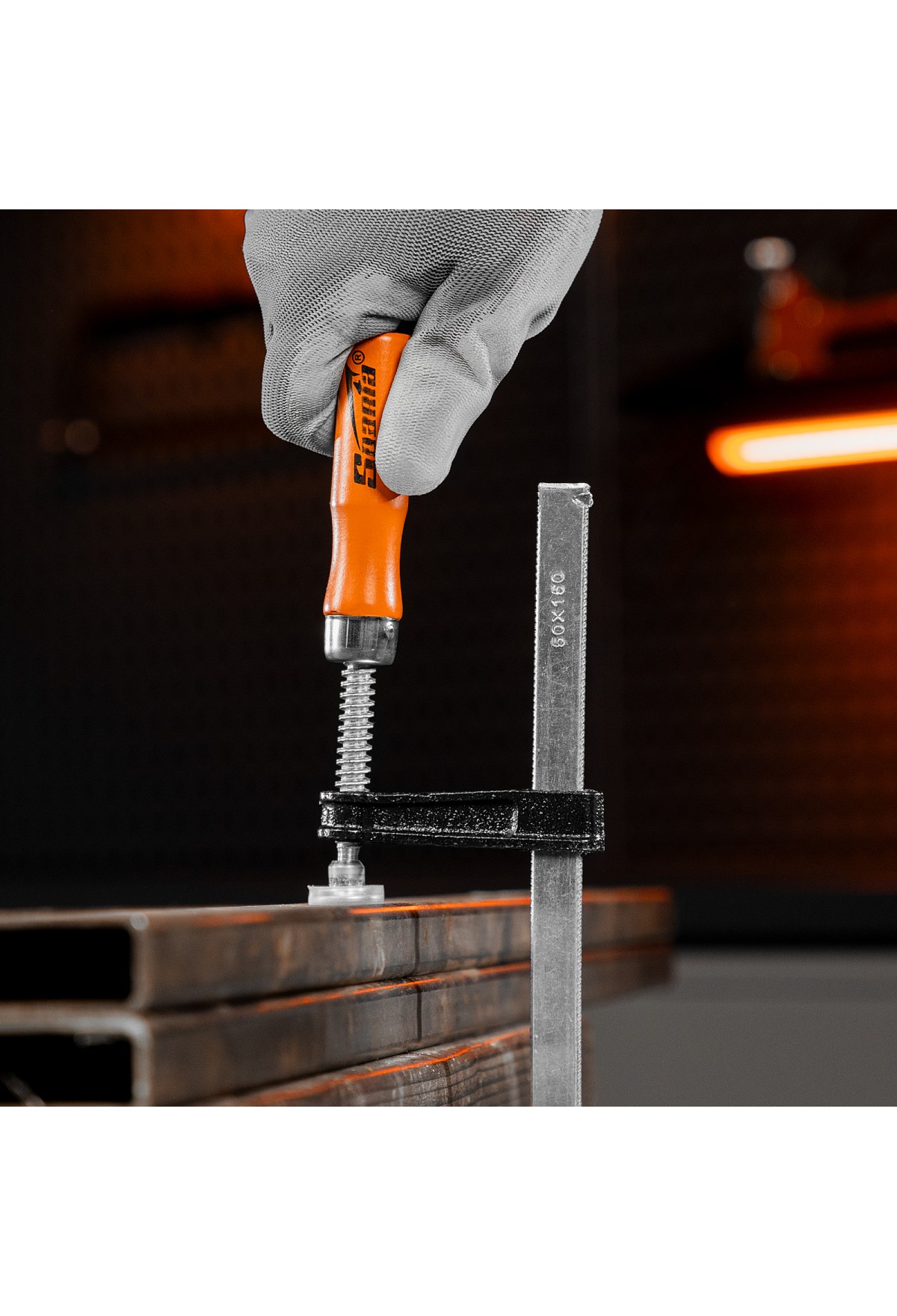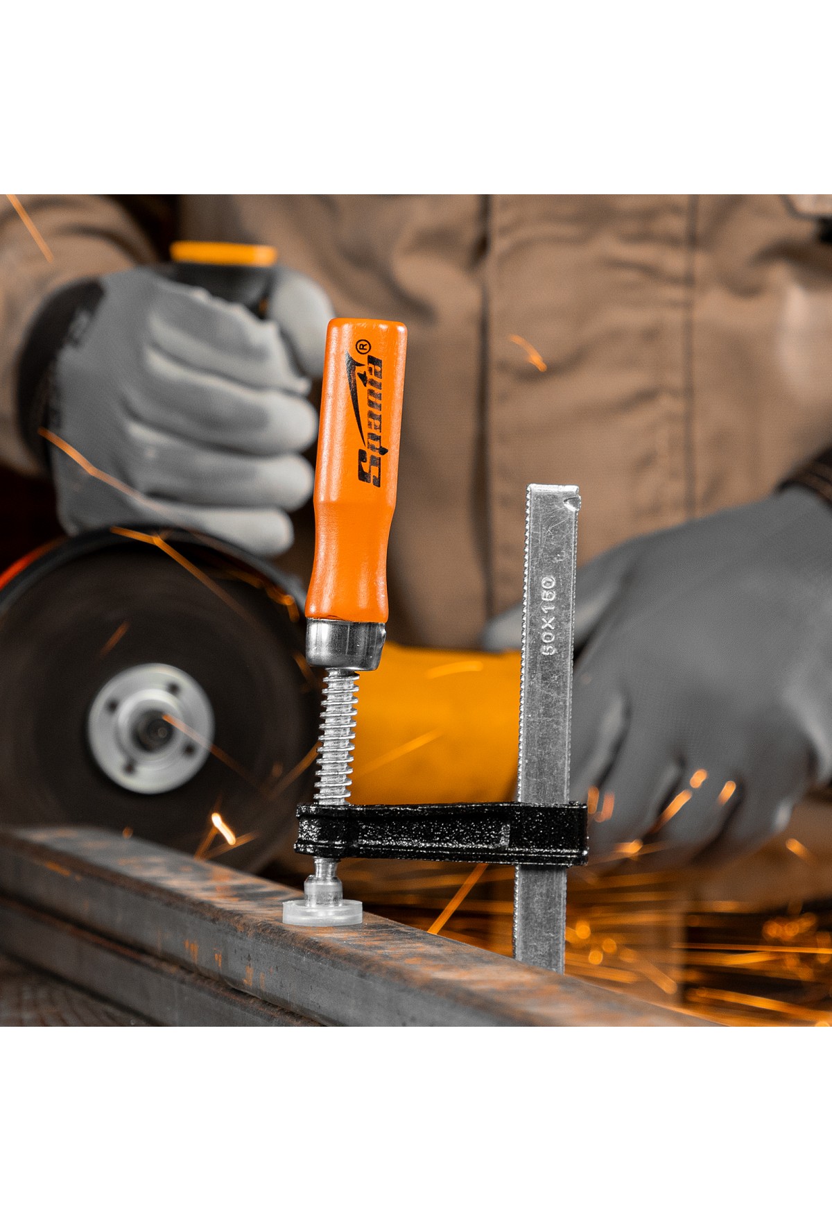 F-образная струбцина Sparta 204235 длиной 200 мм и величиной зажима 150 х 50 мм позволяет фиксировать заготовки из металла, древесины и других материалов для их соединения или обработки. Используется в столярном и слесарном деле. Деталь помещают между губками, одна из которых подвижна и служит для регулировки величины захвата. Винтовой зажим позволяет фиксировать заготовку со значительным усилием. Элементы конструкции выдерживают высокую температуру, поэтому струбцина подходит для проведения сварочных работ, при этом пластиковые накладки необходимо снять.