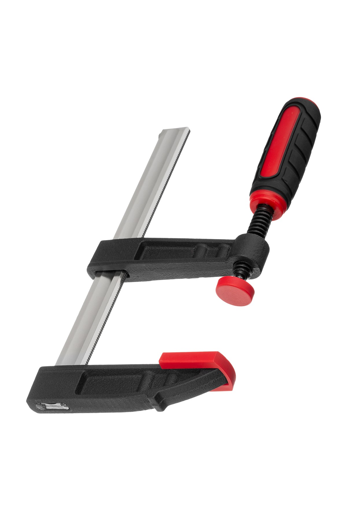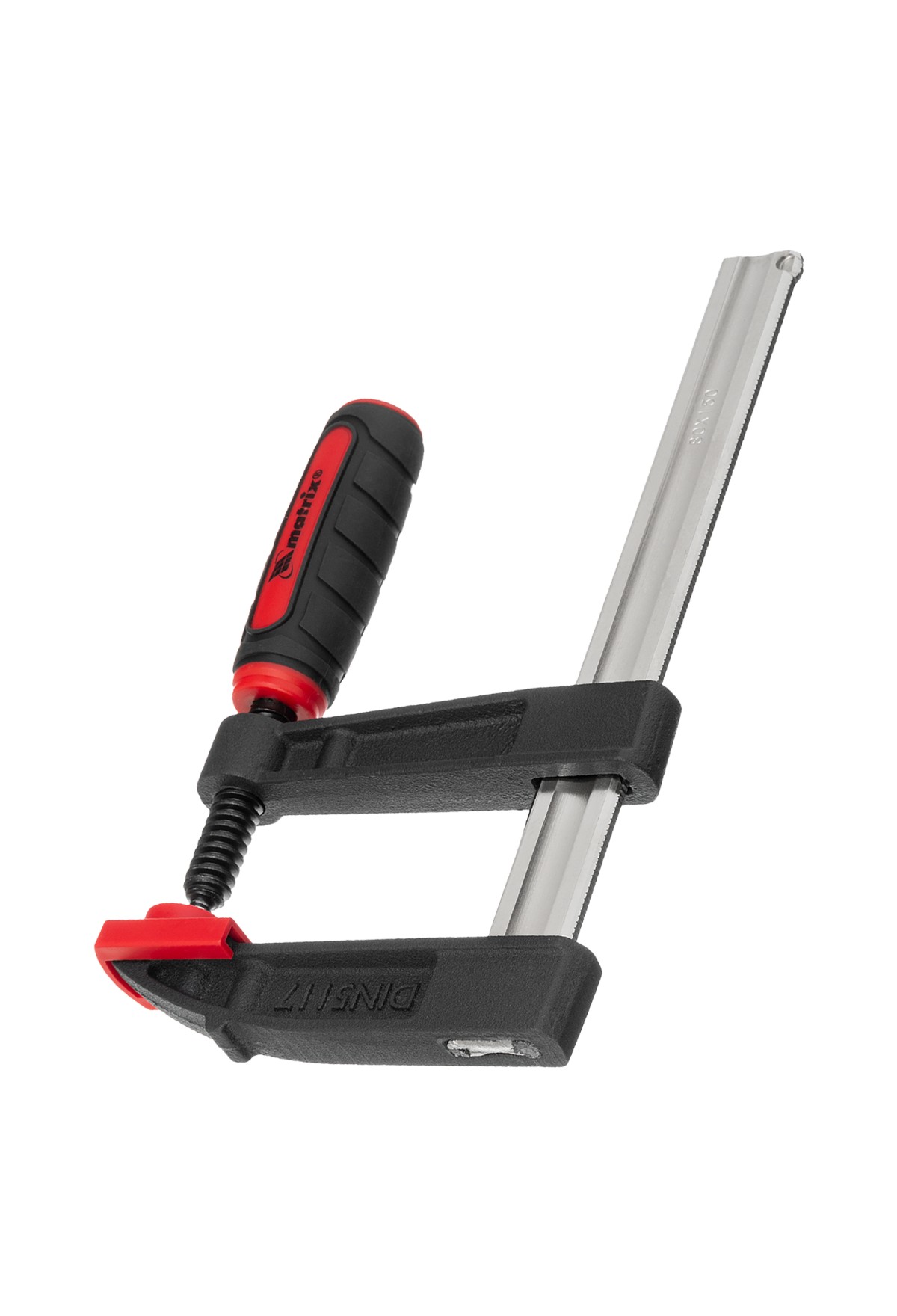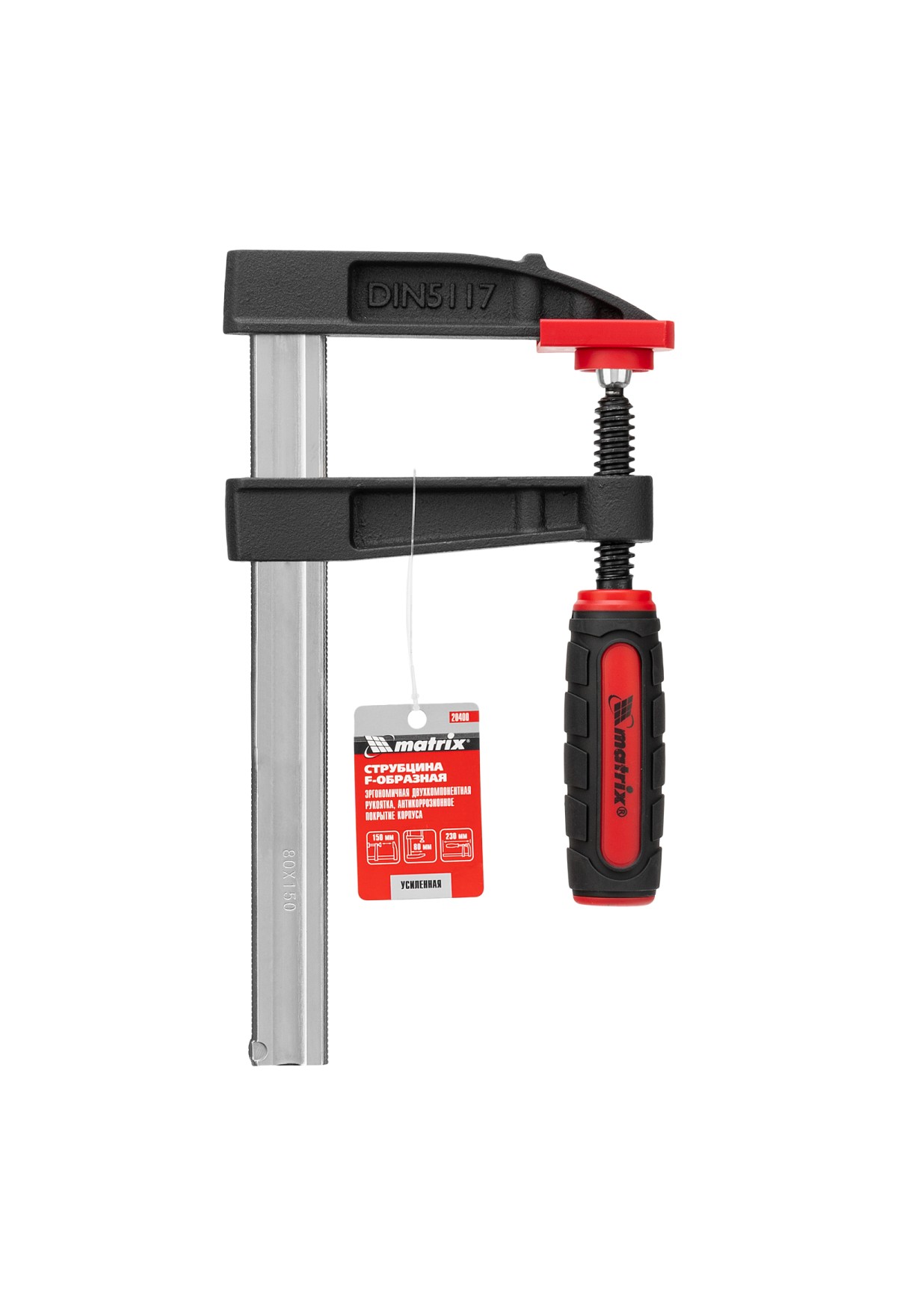 Усиленная F-образная струбцина Matrix 20400 размером 150 х 80 х 230 мм используется для зажима металлических, деревянных и других заготовок для их последующей обработки или сборки. Представляет собой штангу, на которой установлены 2 кронштейна — неподвижный и подвижный. Деталь помещается между ними и прижимается к губкам при помощи винтового зажима с трапециевидной резьбой. Величина захвата регулируется при помощи подвижного кронштейна и может достигать 150 мм. Струбцину используют для проведения слесарных и столярных работ. Металлическая конструкция выдерживает высокую температуру, поэтому инструмент пригодится для выполнения сварочных работ (перед началом необходимо снять пластиковые накладки с губок).