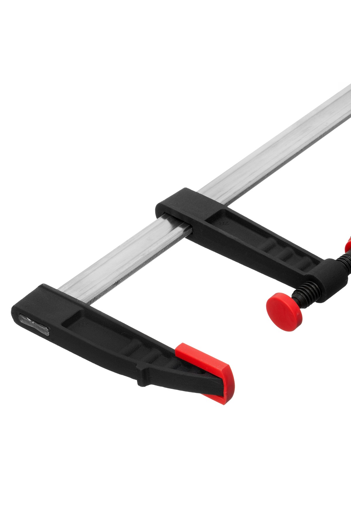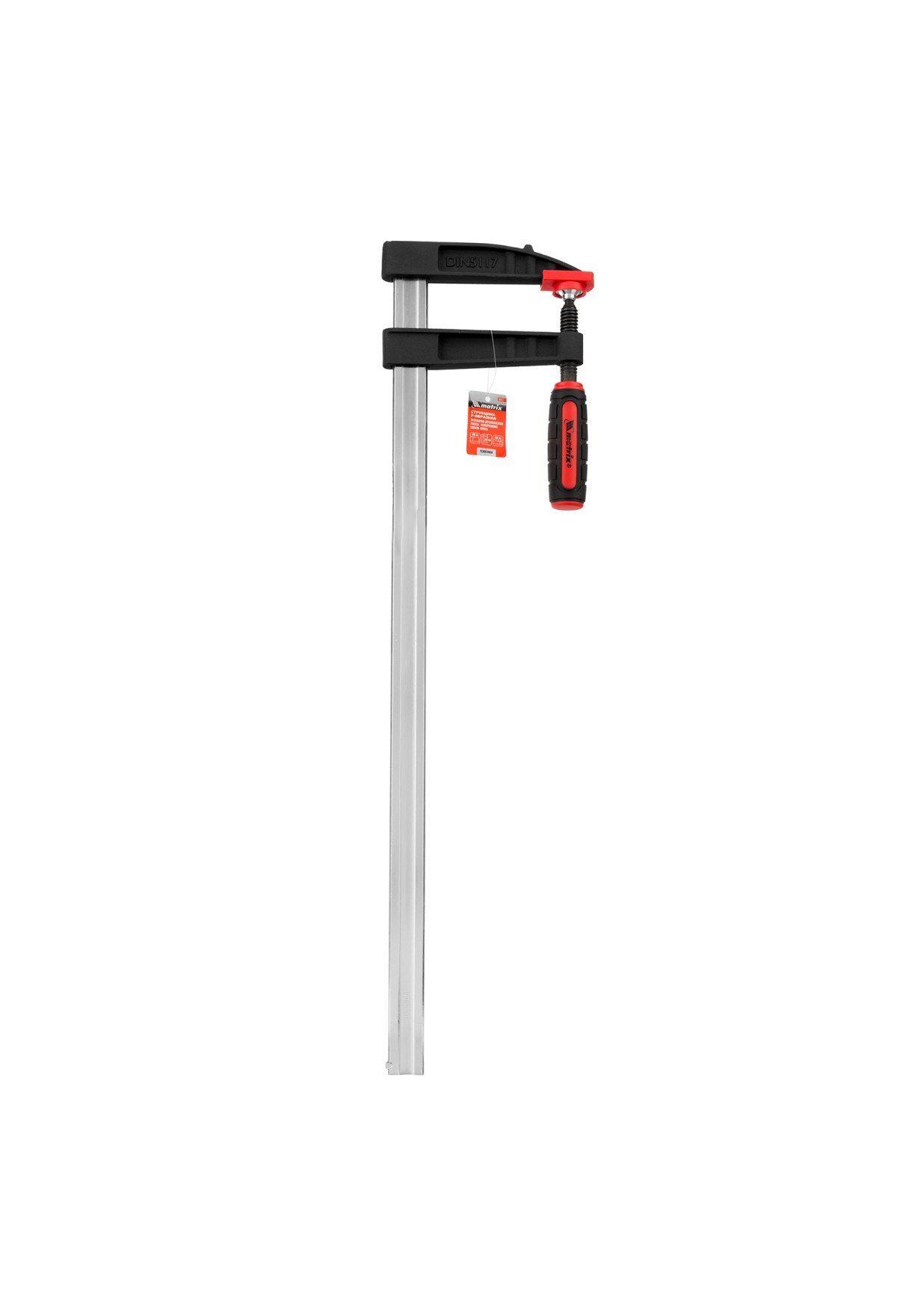Усиленная F-образная струбцина Matrix 20417 размером 600 х 120 х 700 мм используется для зажима металлических, деревянных и других заготовок для их последующей обработки или сборки. Представляет собой штангу, на которой установлены 2 кронштейна — неподвижный и подвижный. Деталь помещается между ними и прижимается к губкам при помощи винтового зажима с трапециевидной резьбой. Величина захвата регулируется при помощи подвижного кронштейна и может достигать 200 мм. Струбцину используют для проведения слесарных и столярных работ. Металлическая конструкция выдерживает высокую температуру, поэтому инструмент пригодится для выполнения сварочных работ (перед началом необходимо снять пластиковые накладки с губок).