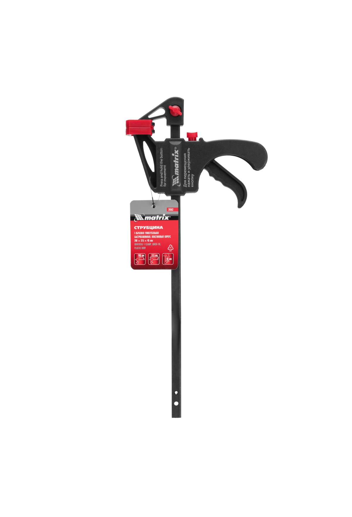 Универсальная F-образная быстрозажимная струбцина Matrix 20562 размером 200 х 315 х 45 мм, в пластиковом корпусе, используется в столярном деле. Позволяет быстро фиксировать заготовки с целью их соединения или обработки — склеивания, сверления, шлифовки, пиления и других видов работ. Подвижная губка перемещается вдоль штанги при помощи пластинчатого механизма, а фиксатор препятствует разжиманию струбцины. Массивная конструкция обеспечивает надежность инструмента.
