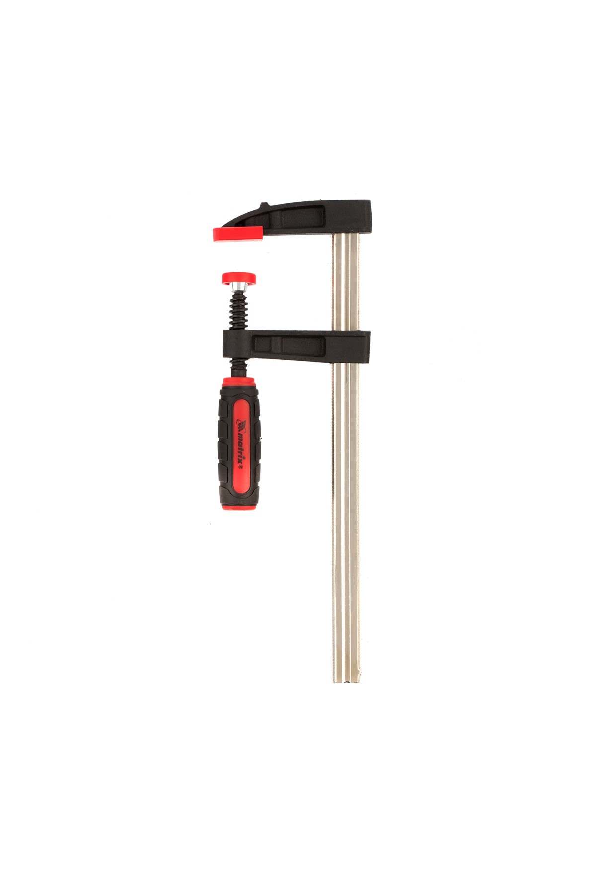 F-образная струбцина Matrix 20403 размером 200 х 50 х 260 мм используется для зажима металлических, деревянных и других заготовок для их последующей обработки или сборки. Представляет собой штангу, на которой установлено 2 кронштейна — неподвижный и подвижный. Деталь помещается между ними и прижимается к губкам при помощи винтового зажима с трапециевидной резьбой. Подвижный кронштейн позволяет регулировать величину захвата, которая может достигать 200 мм. Струбцину применяют для выполнения слесарных и столярных работ.