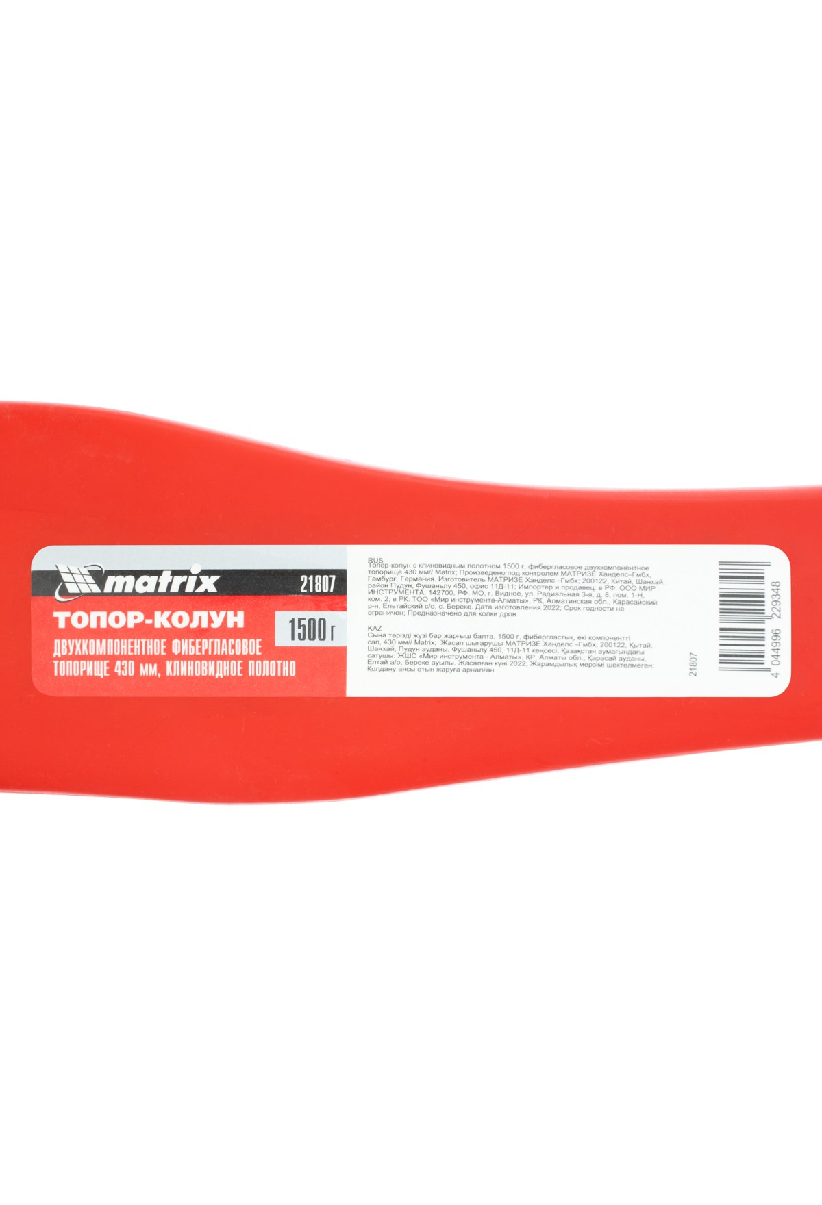 Технические характеристики Топор-колун с клиновидным полотном 1500 г, фибергласовое двухкомпонентное топорище 430 мм Matrix