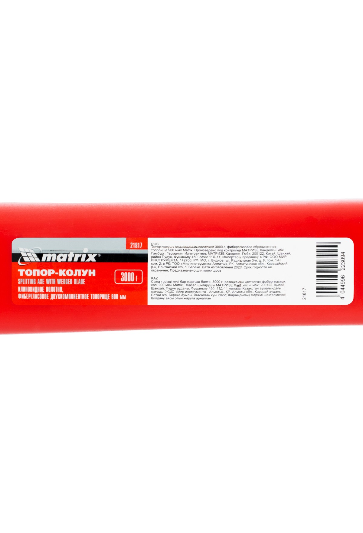 Технические характеристики Топор-колун с клиновидным полотном 3000 г, фибергласовое обрезиненное топорище 900 мм Matrix