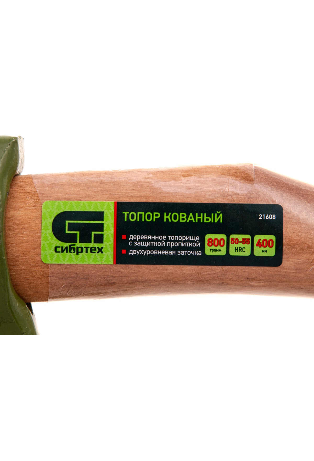 Кованый топор Сибртех 21608 длиной 400 м, с полотном весом 800 г, общим весом 1050 г, с прямым лезвием (тип Б2), поставляется в сборе с деревянным топорищем. Предназначен для рубки, тесания и грубой обработки древесины. Используется для заготовки дров и выполнения плотницких работ.