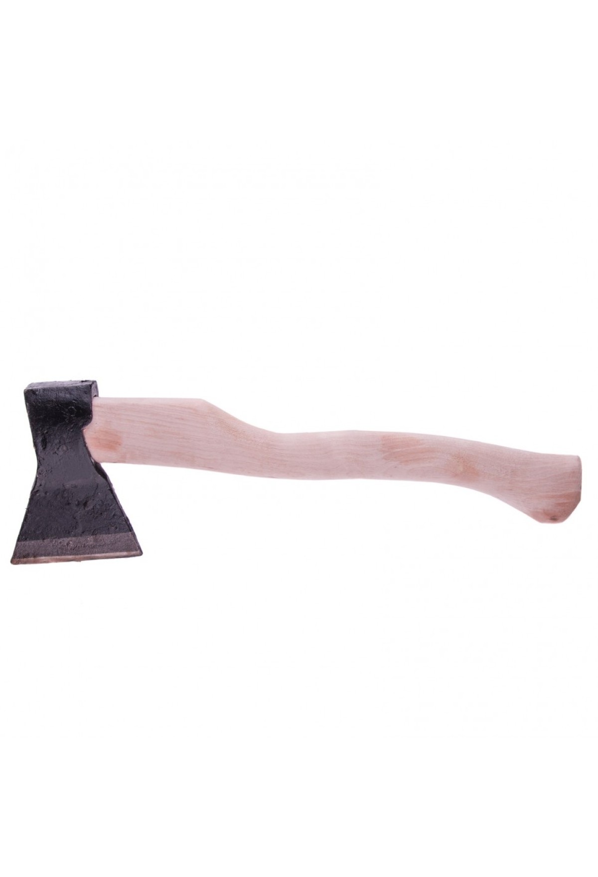 Кованый топор Б 21670 с рабочей частью весом 680 г и деревянным топорищем длиной 400 мм, весит в сборе 900 г и рассчитан на бытовое использование. Инструмент с небольшим прямым лезвием позволяет рубить и тесать древесину любых пород.