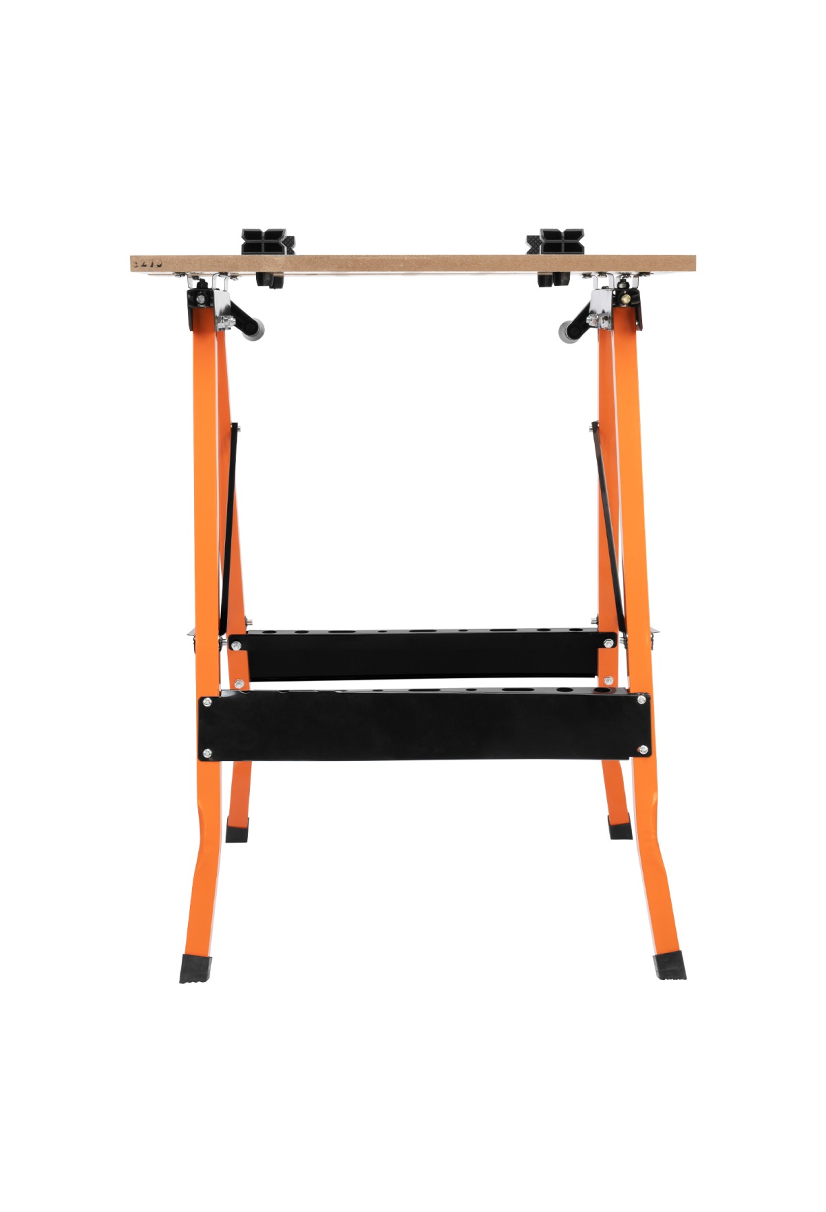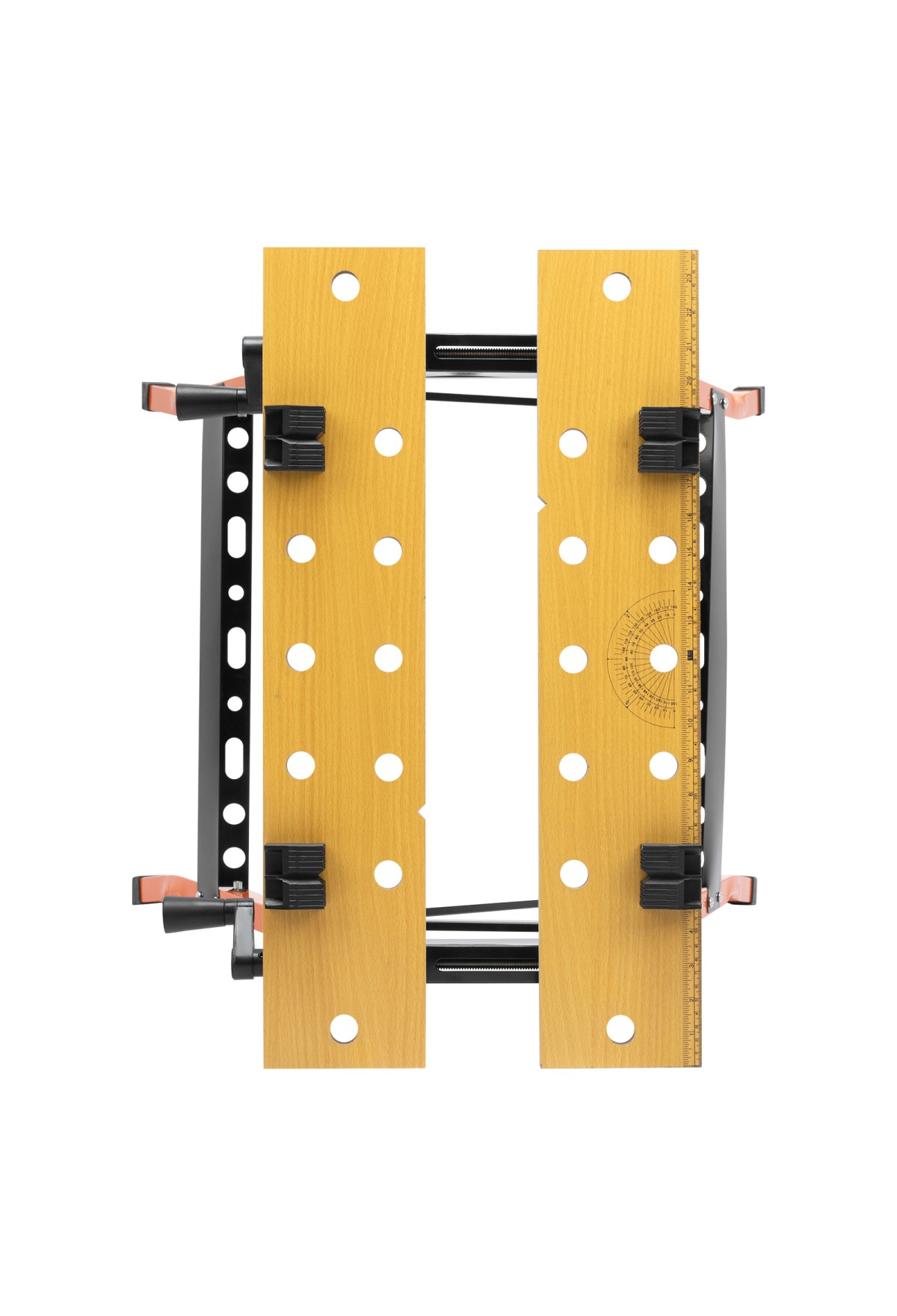 - Удобная эксплуатация — верстак снабжен 4 съемными упорами, которые устанавливаются в различных позициях, а на столешнице имеется разметка с линейкой и транспортиром.