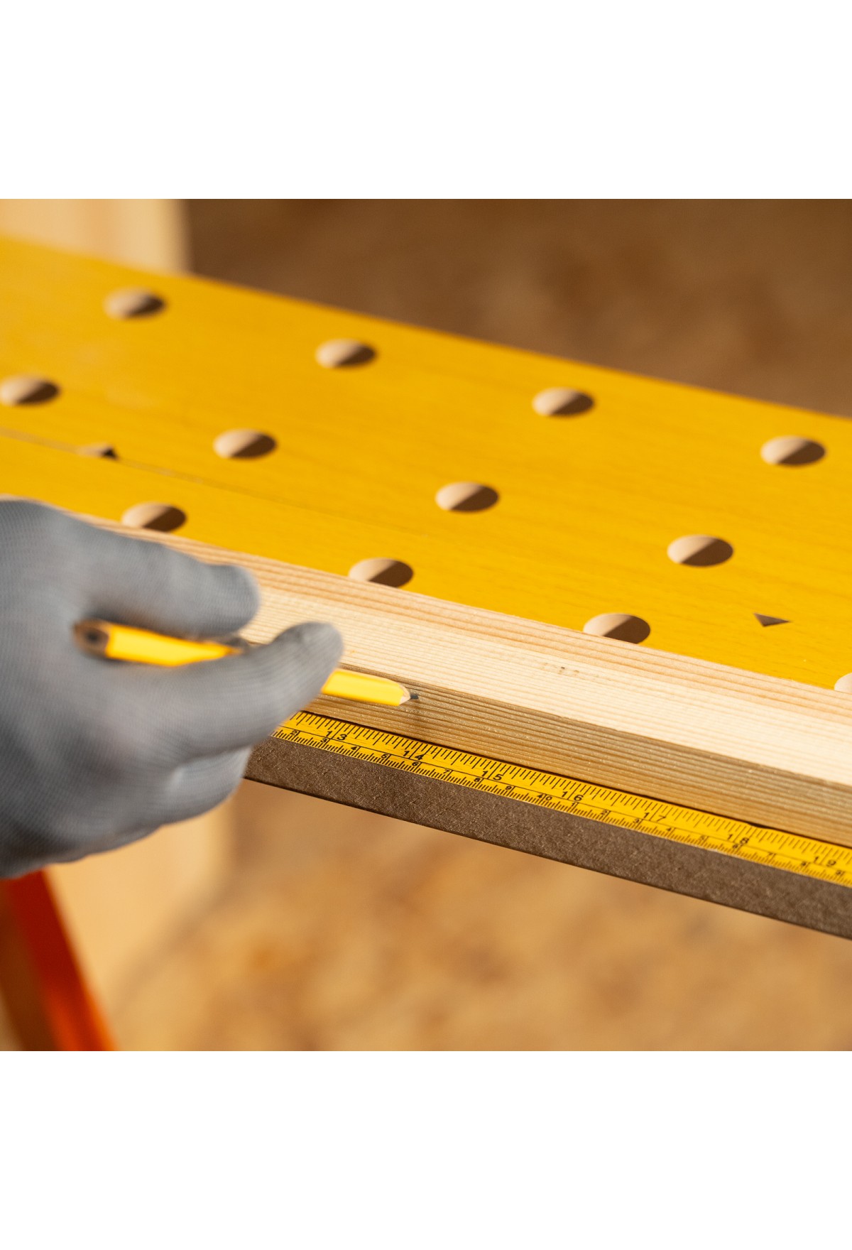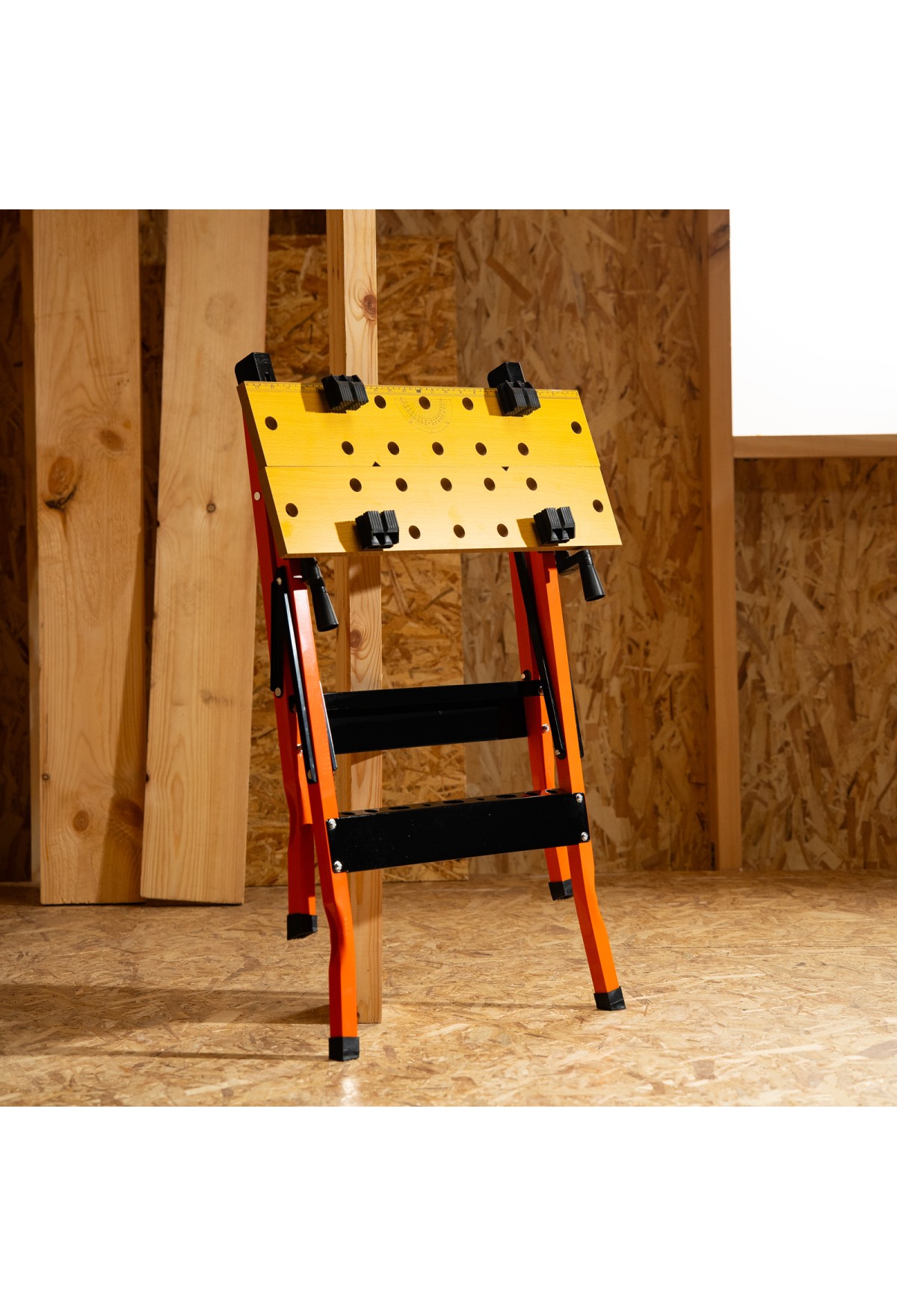 - Удобная эксплуатация — верстак снабжен 4 съемными упорами, которые устанавливаются в различных позициях, а на столешнице имеется разметка с линейкой и транспортиром.