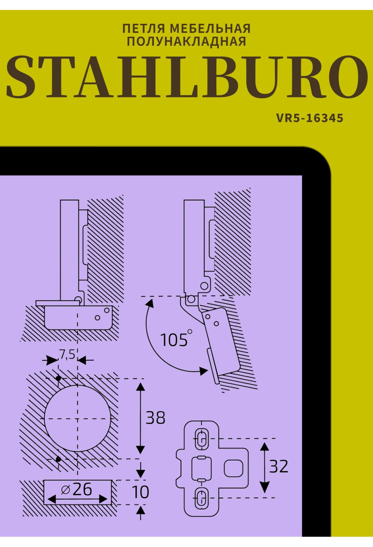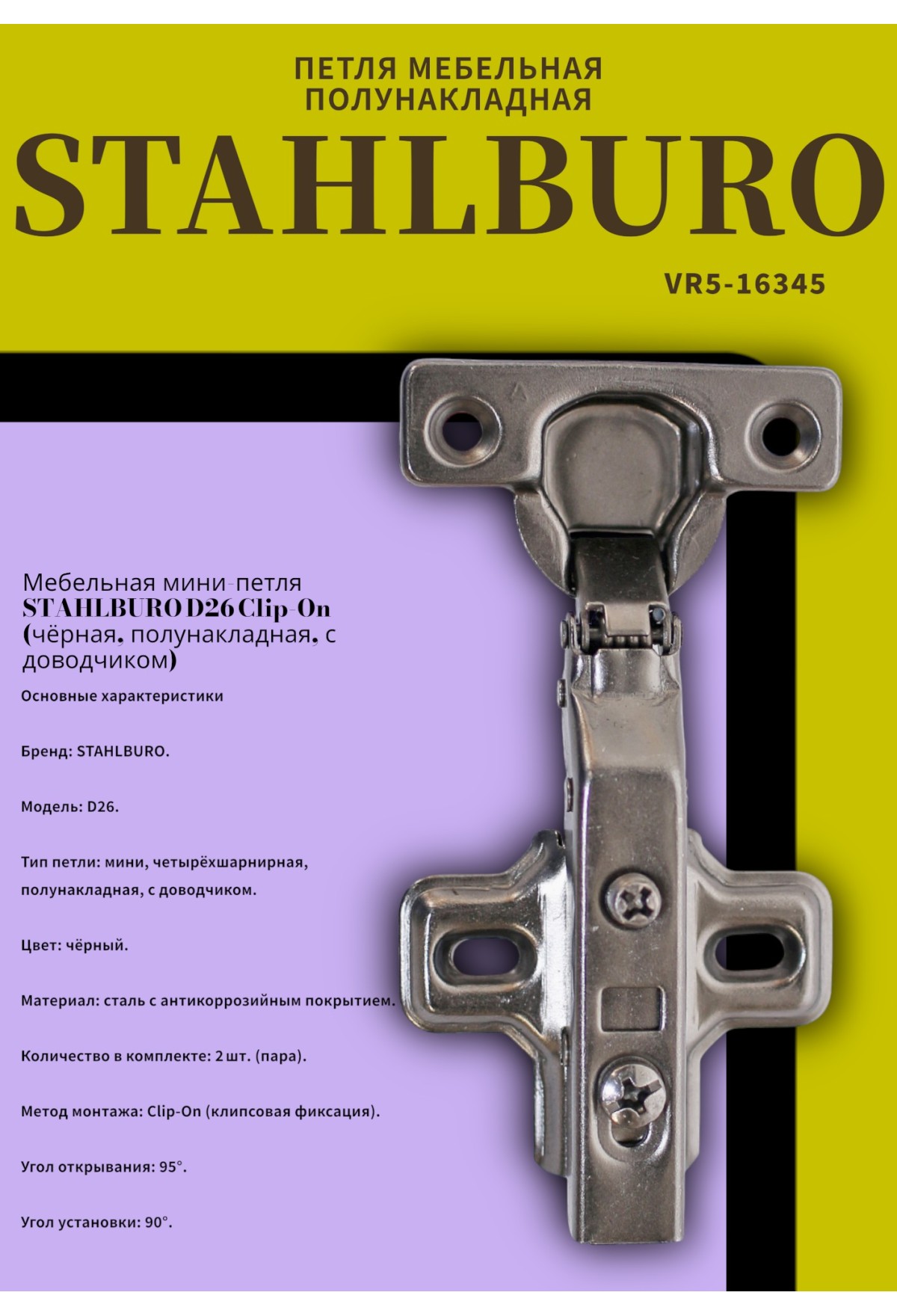 Мебельная мини‑петля STAHLBURO D26 Clip‑On (чёрная, полунакладная, с доводчиком)