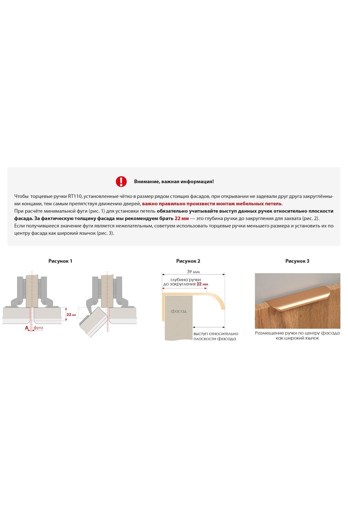 RT110 подходит для установки на фасады толщиной до 18 мм и крепится накладным способом, что значительно облегчает установку и не требует дополнительной работы с торцом.