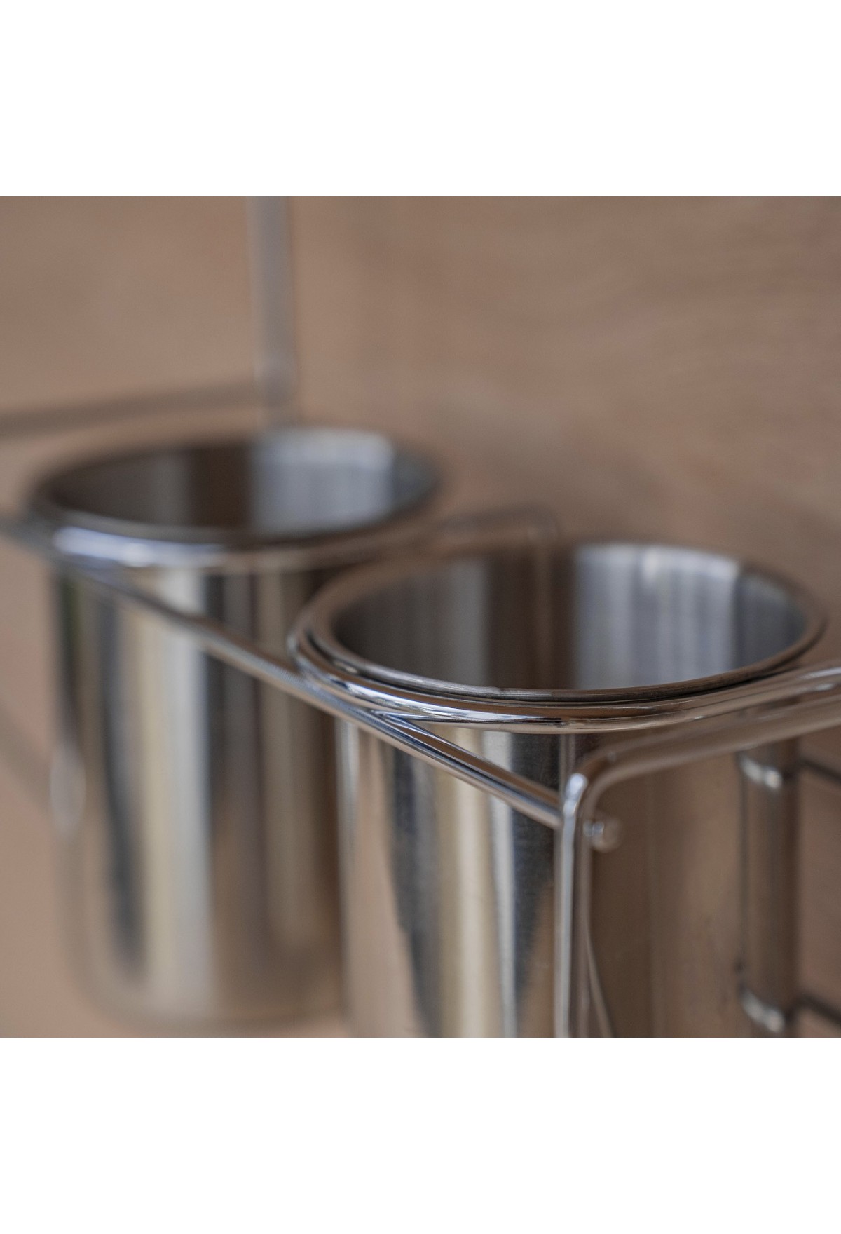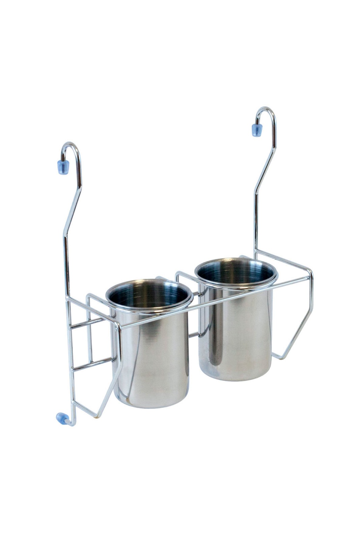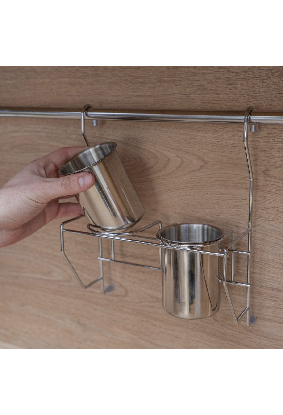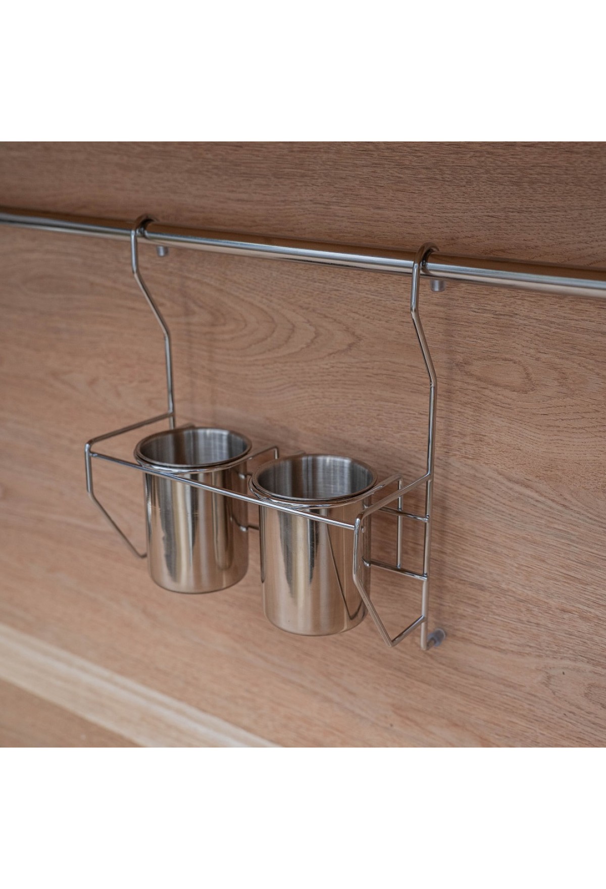 Стаканы для столовых приборов, комплектуются полкой подвесом на рейлинг диаметра до 16 мм , цвет хром. Стаканы выполнены из пищевой нержавеющей стали и имеют перфорированное дно, что обеспечивает проветривание вымытых столовых приборов.