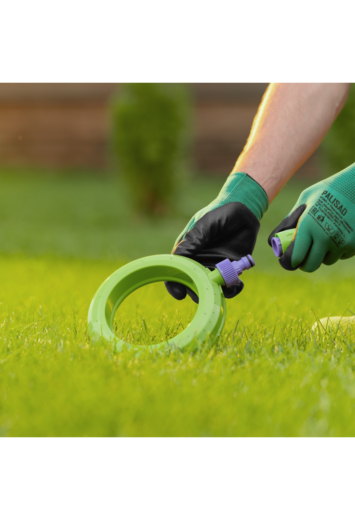 Круговой разбрызгиватель Palisad 65404 имеет 53 форсунки, благодаря которым способен производить радиальный полив растений на участке диаметром до 8,8 м. Может использоваться на дачном участке, в парке, сквере и на придомовой территории.