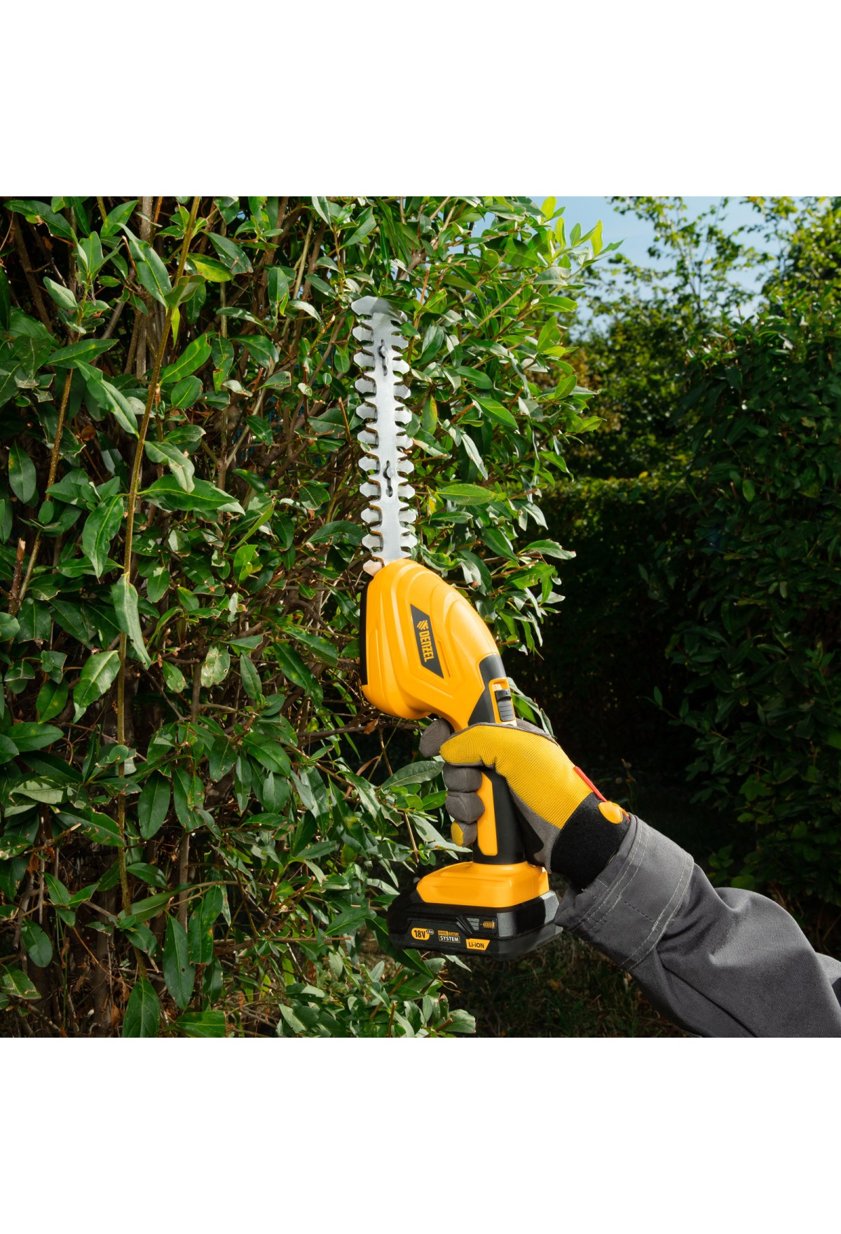 - Полный комплект поставки — аккумулятор и зарядное устройство прилагаются к ножницам-кусторезу.