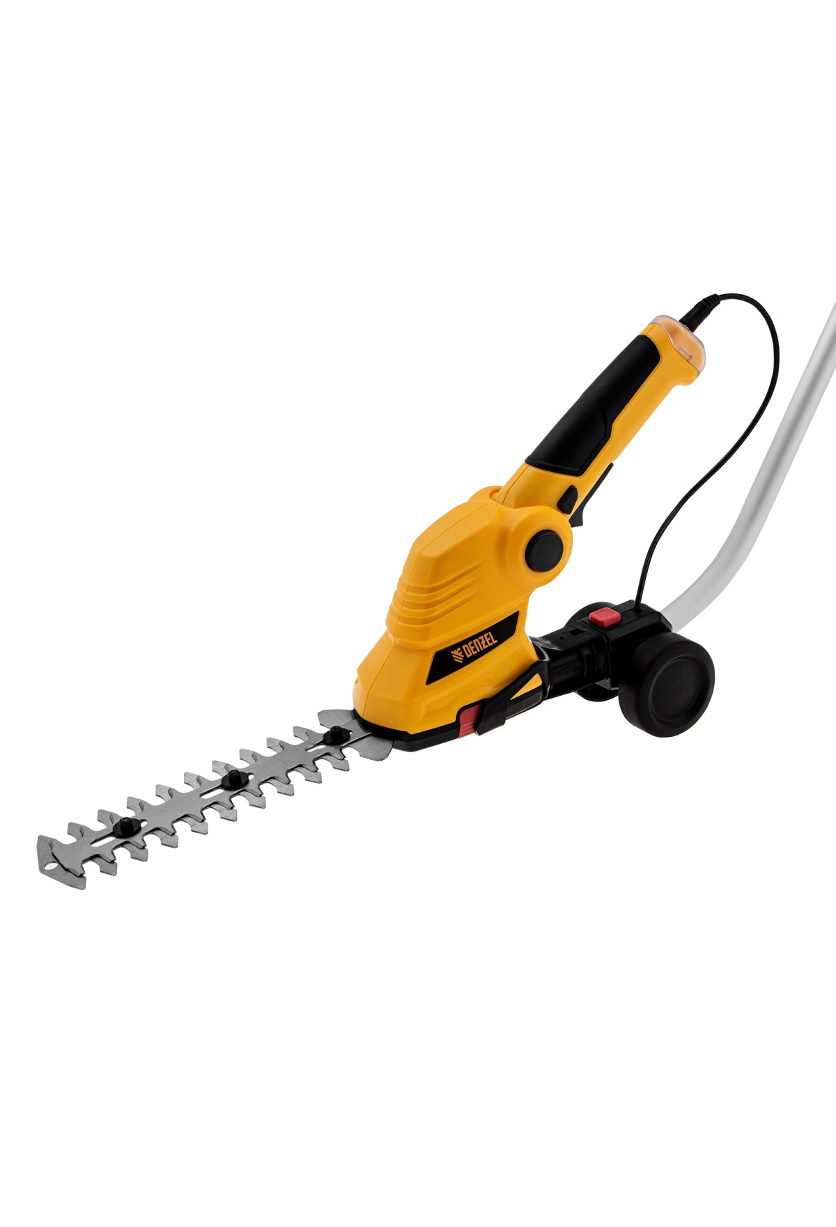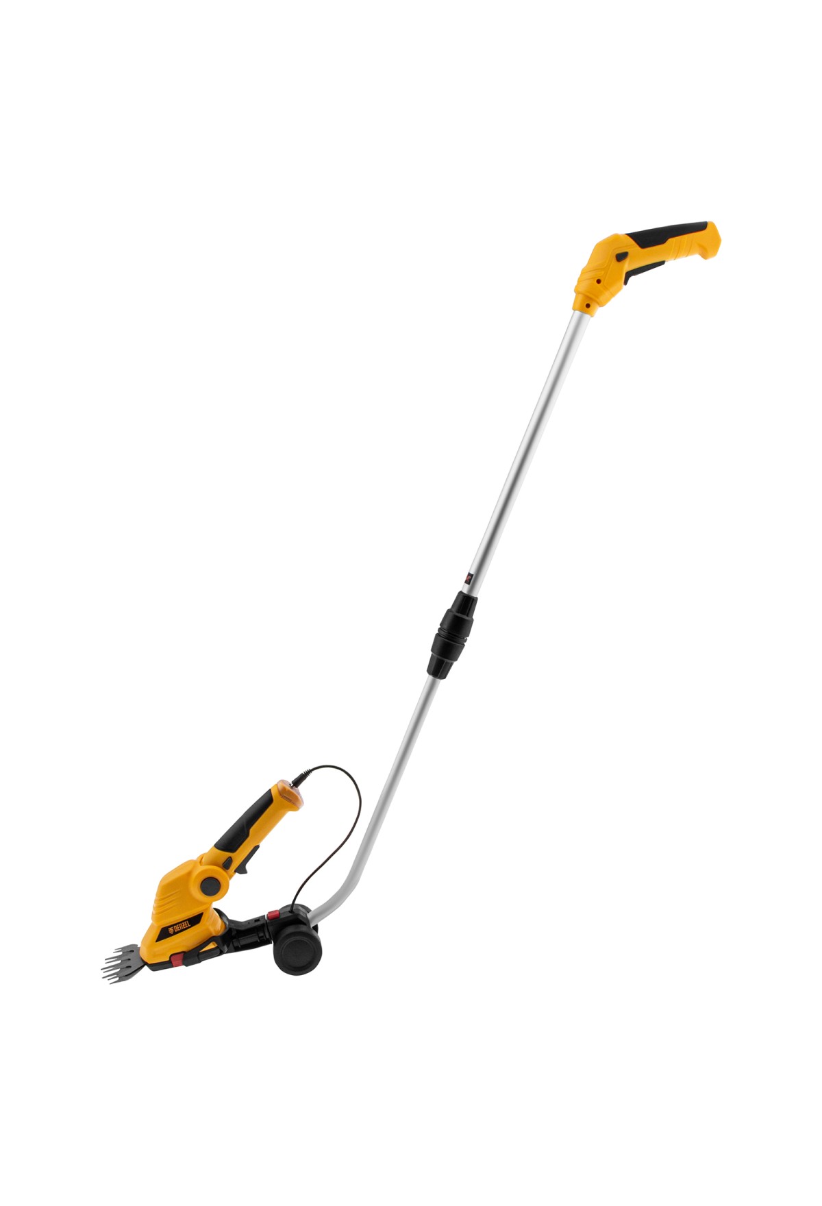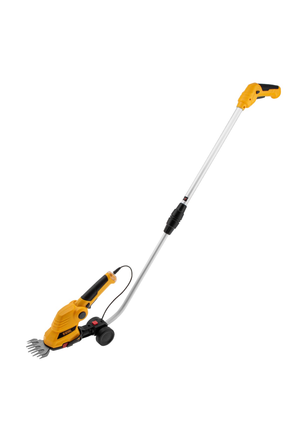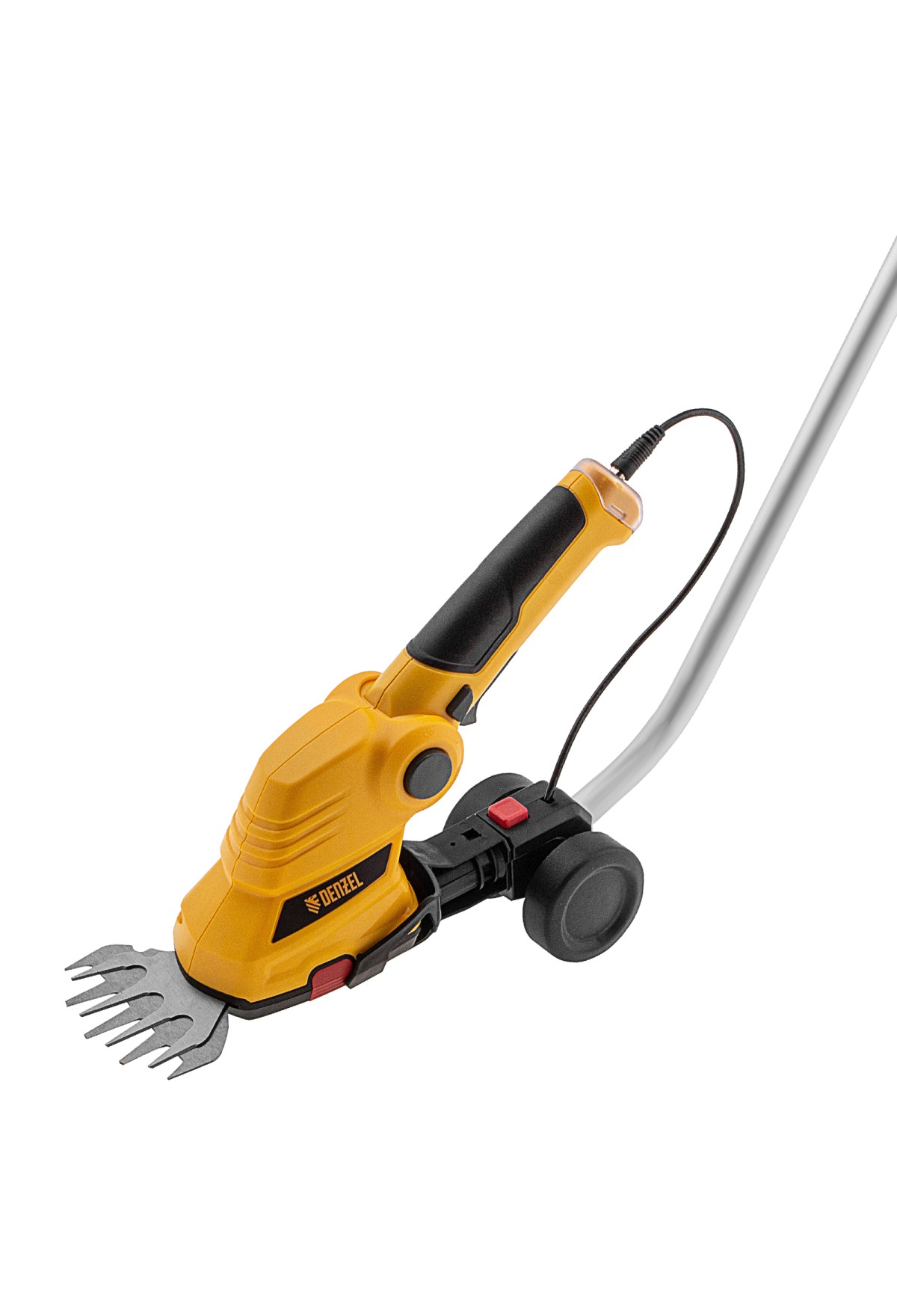 Аккумуляторные ножницы-кусторез Denzel G801E 968157 с телескопической штангой, с Li-Ion батареей емкостью 1,5 Ач и напряжением 7,2 В, используются для ухода за садовым участком. Поставляются с двумя насадками: для подрезания газонной травы и для обрезки кустов и тонких веток деревьев. Небольшой вес 1,1 кг и съемная штанга с колесным блоком обеспечивают комфортное использование ножниц-кустореза.
