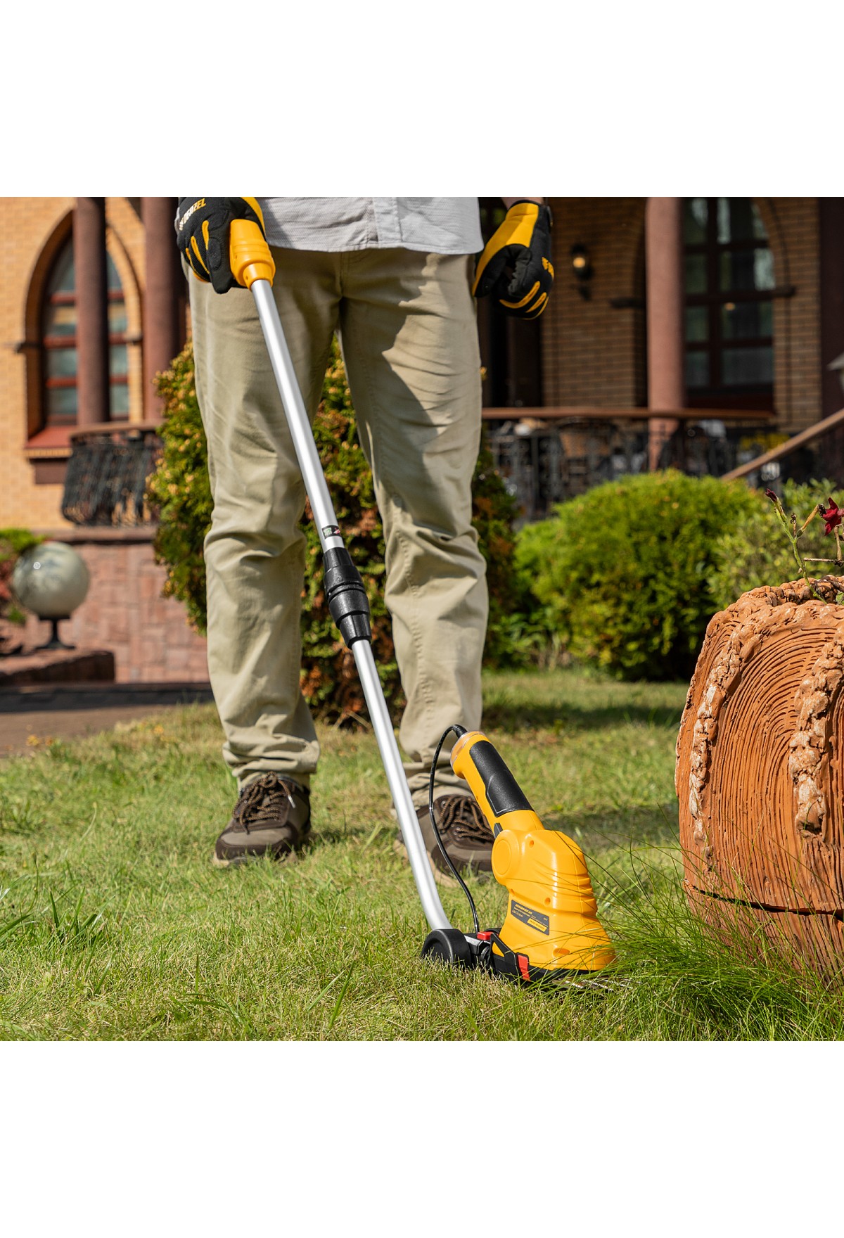 - Удобная эксплуатация — инструмент можно закрепить на телескопической штанге, регулируемой в диапазоне 800-1100 мм, что позволяет выполнять работы в труднодоступных местах.