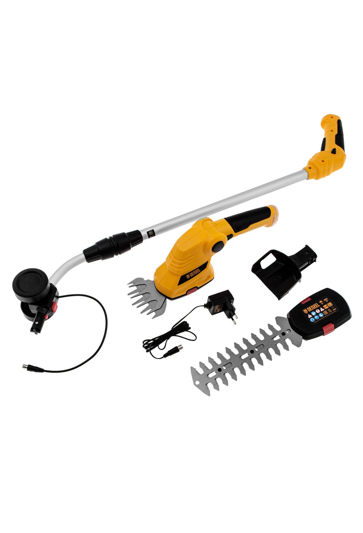 | Комплектация | Аккумуляторные садовые ножницы (со встроенным аккумулятором) - 1 штБлок-переходник - 1 штРежущий модуль для травы быстросъемный - 1 штРежущий модуль для кусторезов быстросъемные - 1 штЗарядное устройство - 1 штТелескопическая рукоятка - 1 штРуководство по эксплуатации с гарантийным талоном - 1 шт |