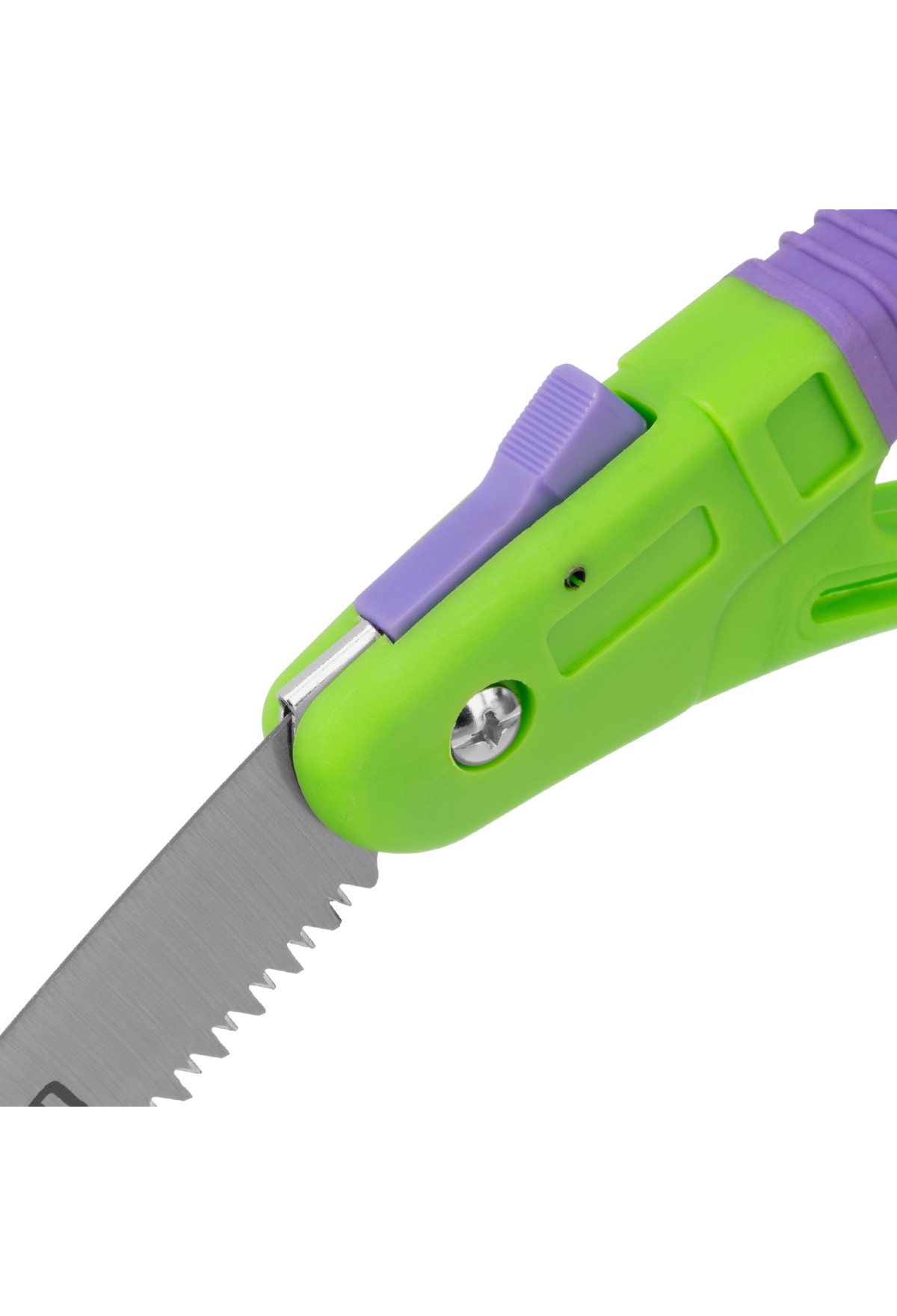 Садовая складная пила Palisad 60411 с полотном длиной 175 мм, пластиковой обрезиненной рукояткой и защитной кулисой, предназначена для продольного и поперечного распила сухой или сырой древесины. Зубья трехгранной формы с шагом 6-7 TPI облегчают работу и обеспечивают чистый и ровный рез. Складная пила удобна и безопасна в транспортировке и хранении, что делает ее оптимальной для использования на выездных работах и в походах.