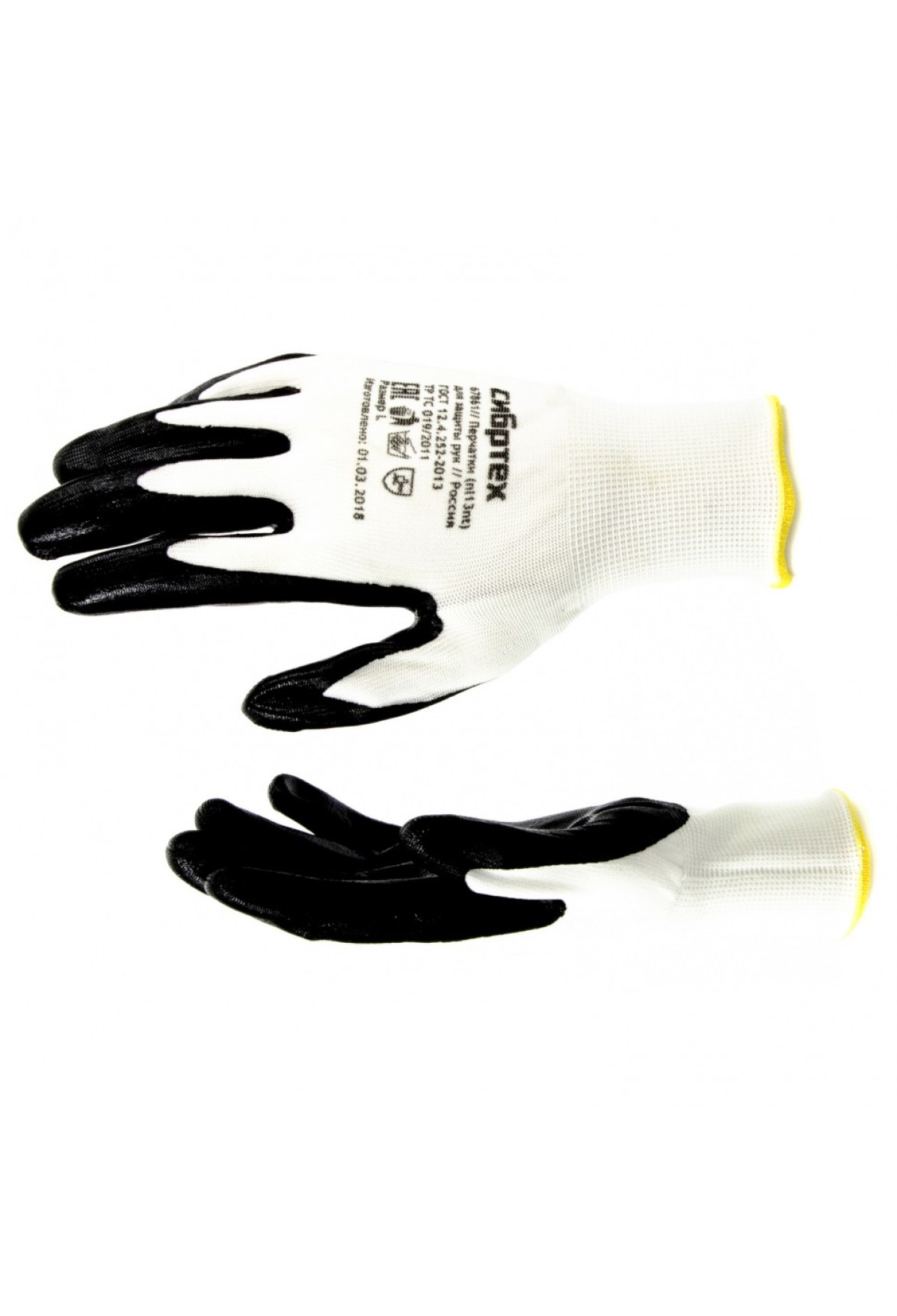 Маслобензостойкие полиэфирные перчатки Сибртех 67861 с черным нитрильным покрытием, 15 класса вязки, размера L, предназначены для выполнения хозяйственных, ремонтных, строительных и автослесарных работ, в том числе предполагающих контакт с агрессивными веществами. Покрытие из нитрила защищает кожу рук от попадания бензина, масла или краски, а также от влаги и загрязнений. Плотная пряжа предохраняет ладони от царапин, ссадин, порезов и мозолей. Перчатки будут полезны дома, в гараже или на даче.